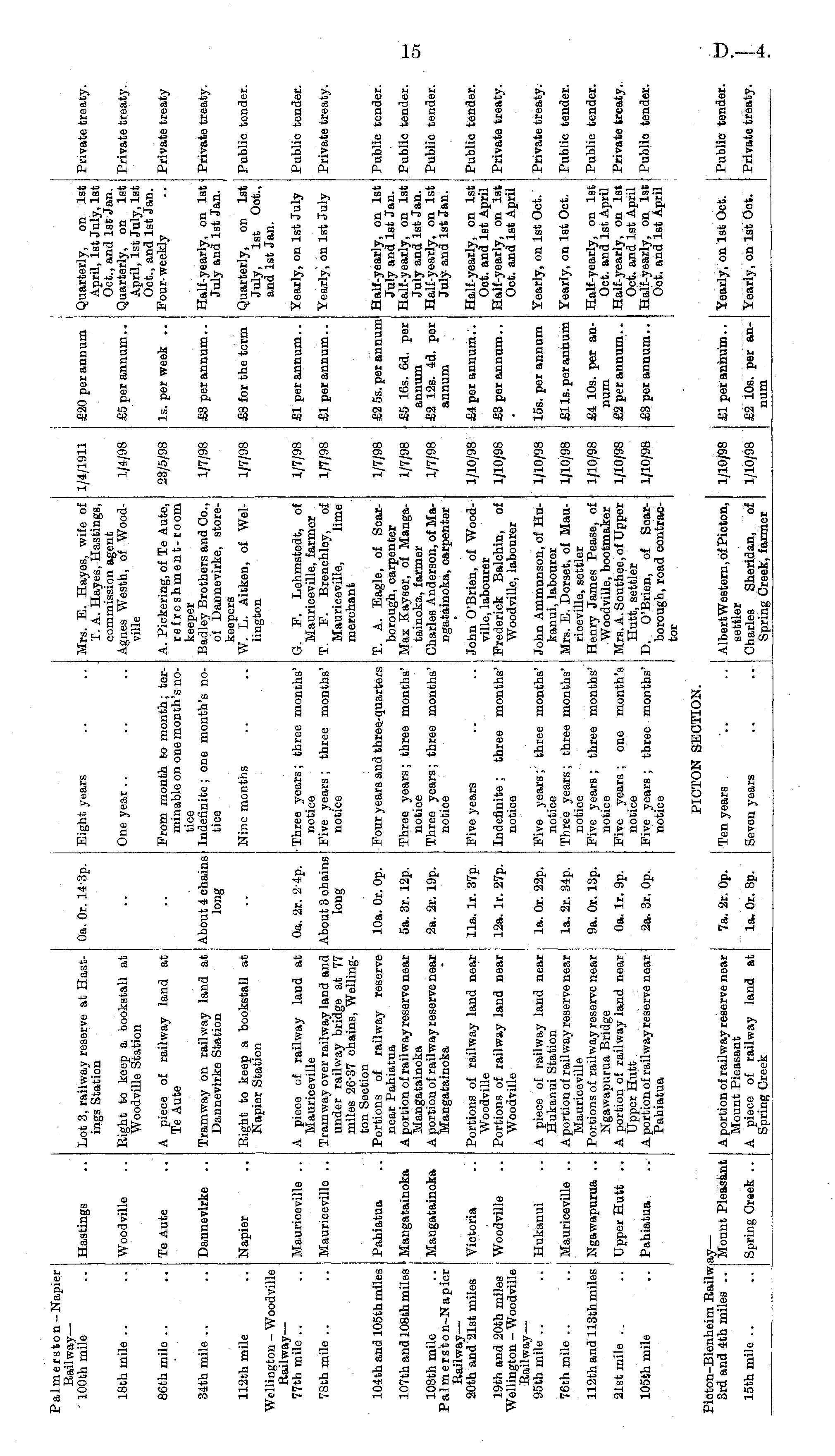 Palmerston -Napier Railway — 100th mile Hastings .. Lot 3, railway reserve at Hastings Station 0a. Or. 14-3p. Eight yaars Mrs. E. Hayes, wife of 1/4/1911 £20 per annum Quarterly, on 1st Private treaty. T. A. Hayes, Hastings, April, 1st July, 1st commission agent Oct., and 1st Jan. Agnes Westh, of Wood- 1/4/98 £5 per annum.. Quarterly, on 1st Private treaty. ville April, 1st July, 1st Oct., and 1st Jan. A. Pickering, of Te Aute, 23/5/98 Is. per week .. Four- weekly .. Private treaty refreshment- room keeper Badley Brothers and Co., 1/7/98 £3 per annum.. Half-yearly, on 1st Private treaty. of Dannevirke, store- July and 1st Jan. keepers W. L. Aitken, of Wei- 1/7/98 £8 for the term Quarterly, on 1st Public tender. lington July, 1st Oct., and 1st Jan. 18th mile Woodville .. Right to keep a bookstall at Woodville Station One year 86th mile Te Aute .. A piece of railway land at Te Aute Dannevirke .. Tramway on railway land at Dannevirke Station About 4 chains long From month to month; terminable on one month's notice Indefinite; one month's notice 34th mile 112th mile Napier .. Right to keep a bookstall at Napier Station Nine months Wellington - Woodville Railway — 77th mile Mauriceville .. A piece of railway land at Mauriceville Mauriceville .. Tramway over railway land and under railway bridge at 77 miles 26-37 chains, Wellington Section Pahiatua .. Portions of railway reserve near Pahiatua Mangatainoka A portion of railway reserve near Mangatainoka Mangatainoka A portion of railway reserve near Mangatainoka 0a. 2r. 24p. About 3 chains long 10a. Or. Op. 5a. 3r. 12p. 2a. 2r. 19p. Three years; three months' notice Five years; three months' notice Four years and three-quartets Three years; three months' notice Three years; three months' notice G. F. Lehmstedt, of 1/7/98 £1 per annum.. Yearly, on 1st July Public tender. Mauriceville, farmer T. F. Brenchley, of 1/7/98 £1 per annum.. Yearly, on 1st July Private treaty. Mauriceville, lime merchant 78th mile 104 th and 105th miles T. A. Eagle, of Soar- 1/7/98 £2 5s. per annum Half-yearly, on 1st Public tender. borough, carpenter July and 1st Jan. Max Kayser, of Manga- 1/7/98 £5 16s. 6d. per Half-yearly, on 1st Public tender. tainoka, farmer annum July and 1st Jan. Charles Anderson, of Ma- 1/7/98 £2 12s. 4d. per Half-yearly, on 1st Public tender. ngatainoka, carpenter annum July and 1st Jan. 107 th and 108th miles 108th mile Palmerston-Napier Railway — 20th and 21st miles 19th and 20th miles Wellington - Woodville Railway — 95th mile Victoria .. Portions of railway land near Woodville Woodville .. Portions of railway land near Woodville lla. lr. 37p. 12a. lr. 27p. Five years Indefinite ; three months' notice John O'Brien, of Wood- 1/10/98 £4per annum.. Half-yearly, on 1st Public tender. ville, labourer Oct. and 1st April Frederick Balchin, of 1/10/98 £3 per annum.. Half-yearly, on 1st Private treaty. Woodville, labourer . Oct. and 1st April 76th mile 112th and 113th miles Hukanui .. A piece of railway land near Hukanui Station Mauriceville .. A portion of railway reserve near Mauriceville Ngawapurua .. Portions of railway reserve near Ngawapurua Bridge Upper Hutt .. A portion of railway land near Upper Hutt Pahiatua .. A portion of railway reserve near Pahiatua la. Or. 22p. la. 2r. 34p. 9a. Or. 13p. 0a. lr. 9p. 2a. 3r. Op. Five years; three months' notice Three years; three months' notice Five years ; three months' notice Five years ; one month's notice Five years ; three months' notice John Ammunson, of Hu- 1/10/98 15s. per annum Yearly, on 1st Oct. Private treaty. kanui, labourer Mrs. E. Dorset, of Mau- 1/10/98 £1 Is. per annum Yearly, on 1st Oct. Public tender. riceville, settler Henry James Pease, of 1/10/98 £4 10s. per an- Half-yearly, on 1st Public tender. Woodville, bootmaker num Oct. and 1st April Mrs. A. Southee, of Upper 1/10/98 £2 per annum.. Half-yearly, on 1st Private treaty. Hutt, settler Oct. and 1st April D. O'Brien, of Soar- 1/10/98 £3 per annum.. Half-yearly, on 1st Public tender. borough, road contrac- Oct. and 1st April tor 21st mile 105th mile Picton-Blenheim Railw i 3rd and 4th miles .. 15th mile ly— Mount Pleasant A portion of railway reserve near Mount Pleasant Spring Creek .. A piece of railway land at Spring Creek 7a. 2r. Op. la. Or. 8p. PIOTON SECTION. Ten years Seven years Albert Western, of Picton, 1/10/98 £1 per annum.. Yearly, on 1st Oct. Public tender. settler Charles Sheridan, of 1/10/98 £2 10s. per an- Yearly, on 1st Oct. Private treaty. Spring Creek, farmer num