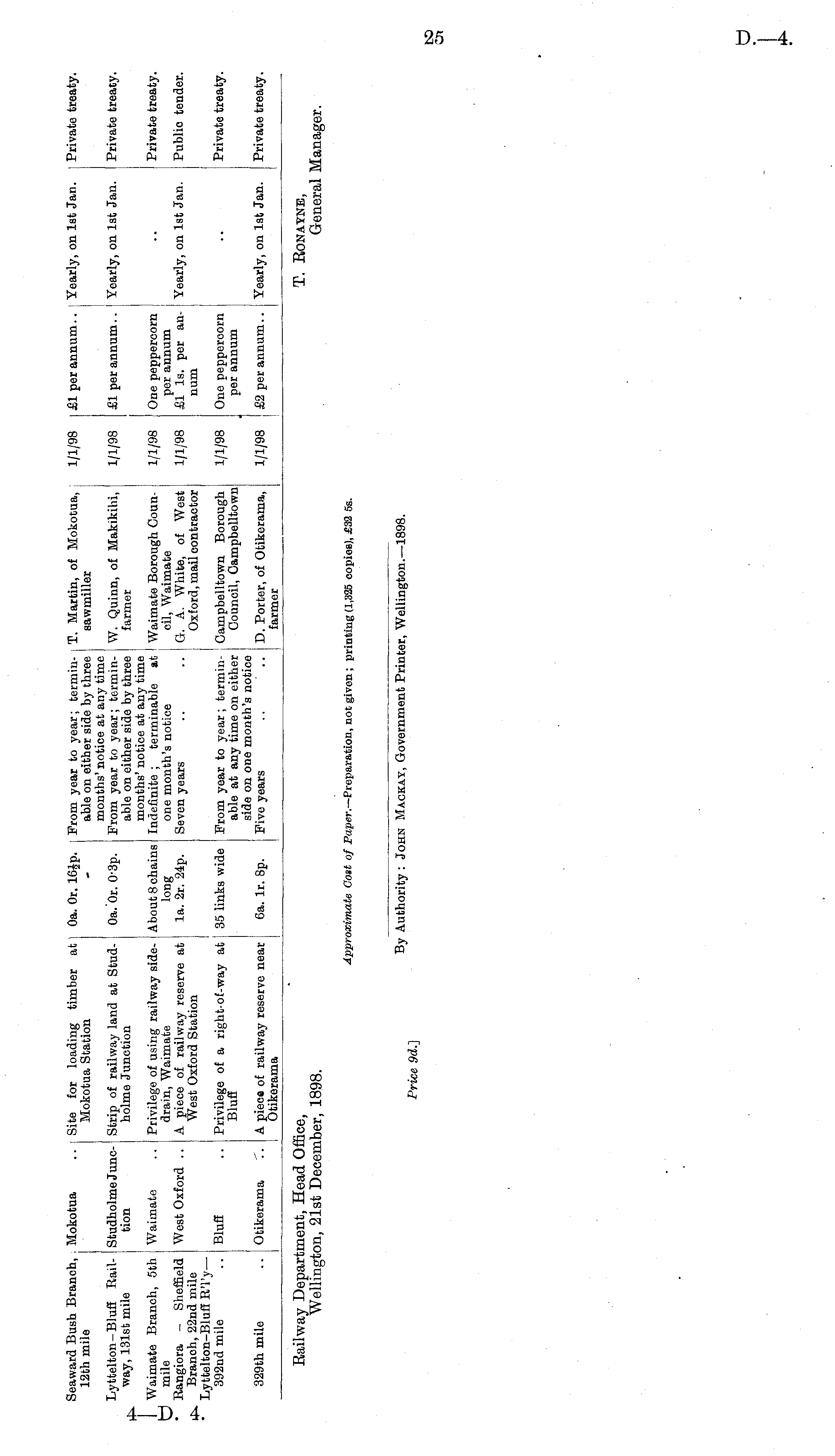 Railway Department, Head Office, T. Ronaynb, Wellington, 21st December, 1898. General Manager. Approximate Cost of Paper.— Preparation, not given; printing (1,325 copies), c£32 ss. By Authority : John Mackay, Government Printer, Wellington.— 1898. Price 9d.}