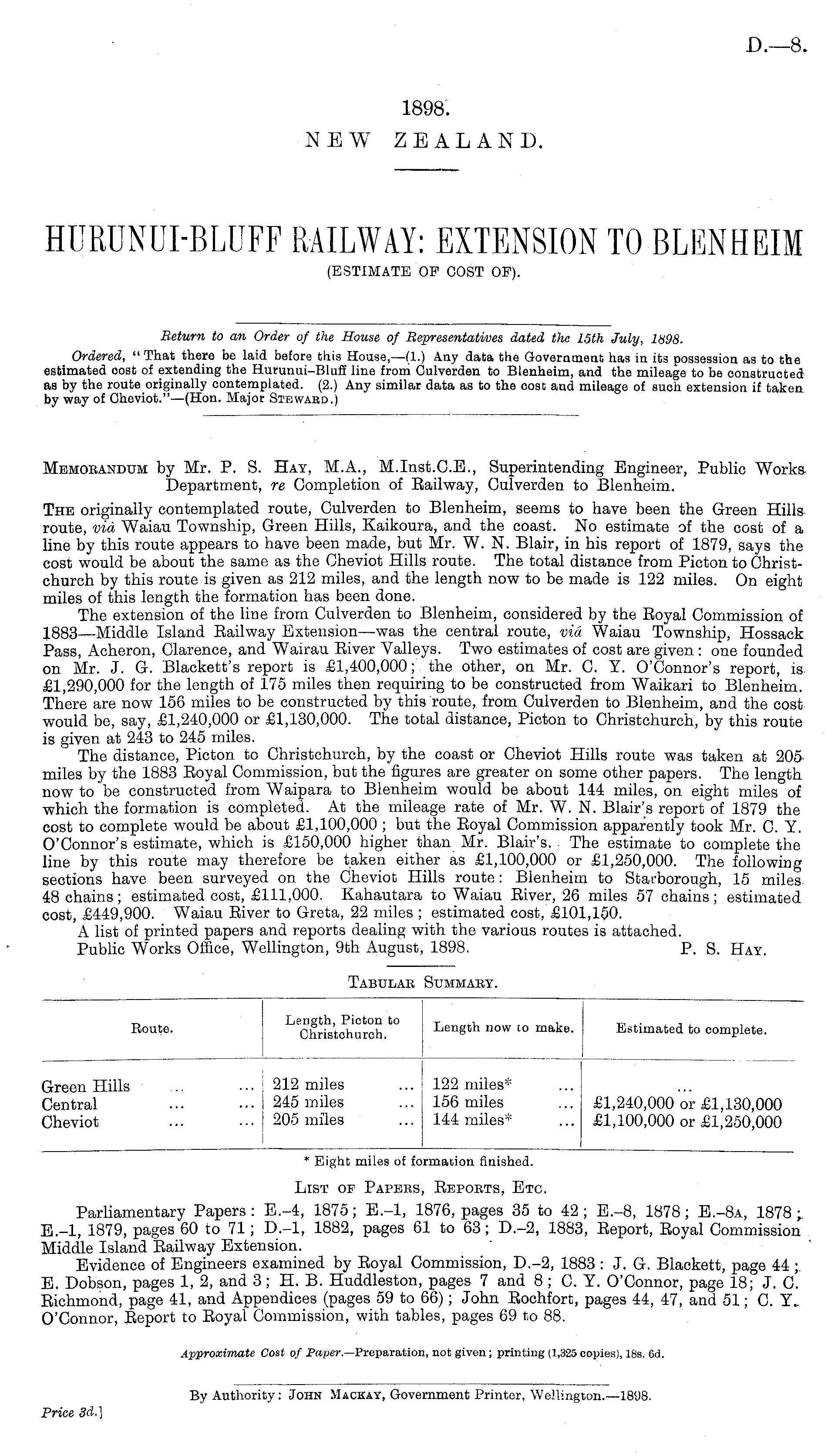 Memoeandum by Mr. P. S. Hay, M.A., M.lnst.C.E., Superintending Engineer, Public Works Department, re Completion of Bailway, Culverden to Blenheim. The originally contemplated route, Culverden to Blenheim, seems to have been the Green Hills route, via Waiau Township, Green Hills, Kaikoura, and the coast. No estimate of the cost of a line by this route appears to have been made, but Mr. W. N. Blair, in his report of 1879, says the cost would be about the same as the Cheviot Hills route. The total distance from Picton to Christchurch by this route is given as 212 miles, and the length now to be made is 122 miles. On eight miles of this length the formation has been done. The extension of the line from Culverden to Blenheim, considered by the Boyal Commission of 1883 —Middle Island Bailway Extension —was the central route, via Waiau Township, Hossack Pass, Acheron, Clarence, and Wairau Biver Valleys. Two estimates of cost are given : one founded on Mr. J. G. Blackett's report is £1,400,000; the other, on Mr. C. Y. O'Connor's report, is £1,290,000 for the length of 175 miles then requiring to be constructed from Waikari to Blenheim. There are now 156 miles to be constructed by this route, from Culverden to Blenheim, and the cost would be, say, £1,240,000 or £1,130,000. The total distance, Picton to Christchurch, by this route is given at 243 to 245 miles. The distance, Picton to Christchurch, by the coast or Cheviot Hills route was taken at 205 miles by the 1883 Boyal Commission, but the figures are greater on some other papers. The length now to be constructed from Waipara to Blenheim would be about 144 miles, on eight miles of which the formation is completed. At the mileage rate of Mr. W. N. Blair's report of 1879 the cost to complete would be about £1,100,000 ; but the Boyal Commission apparently took Mr. C. Y. O'Connor's estimate, which is £150,000 higher than Mr. Blair's. The estimate to complete the line by this route may therefore be taken either as £1,100,000 or £1,250,000. The following sections have been surveyed on the Cheviot Hills route: Blenheim to Starborough, 15 miles 48 chains; estimated cost, £111,000. Kahautara to Waiau Biver, 26 miles 57 chains; estimated cost, £449,900. Waiau Biver to Greta, 22 miles ; estimated cost, £101,150. A list of printed papers and reports dealing with the various routes is attached. Public Works Office, Wellington, 9th August, 1898. P. S. Hay.