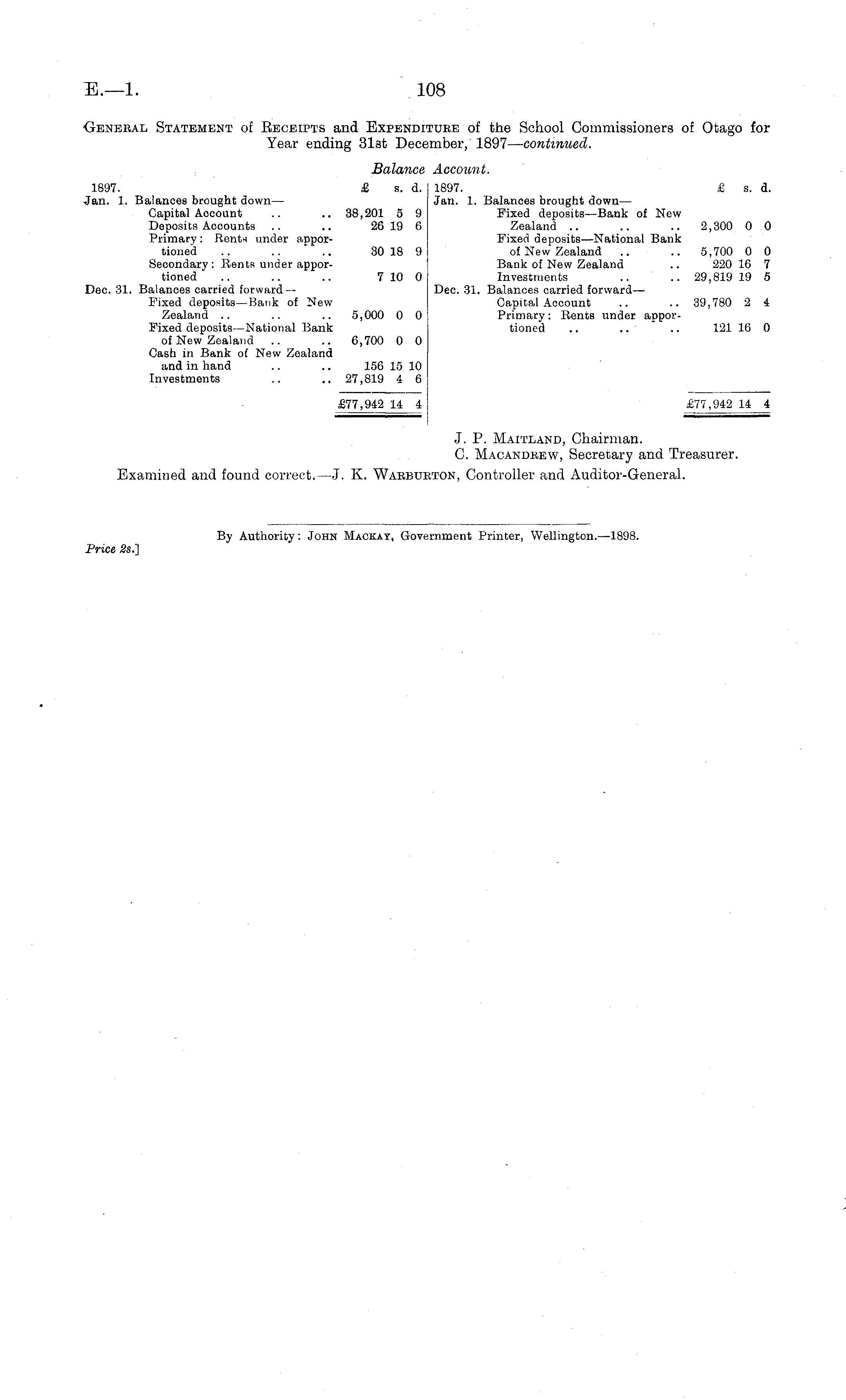 General Statement of Eeceipts and Expenditure of the School Commissioners of Otago for Year ending 31st December, 1897 — continued. Balance Account. 1897. £ s. a. 1897. £ s. d. Jan. 1. Balances brought down— Jan. 1. Balances brought down— Capital Account .. .. 38,201 5 9 Pixea aeposits—Bank of New Deposits Accounts .. .. 26 19 6 Zealand .. .. .. 2,300 0 0 Primary : Rentx under appor- Fixed deposits—National Bank tioned .. .. .. 30 18 9 of New Zealand .. .. 5,700 0 0 Secondary: Rents under appor- Bank of New Zealand .. 220 16 7 tioned .. .. .. 7 10 0 Investments .. .. 29,819 19 5 Dec. 31. Balances carried forward— Dec. 31. Balances carried forward — Fixed deposits—Bank of New Capital Account .. .. 39,780 2 4 Zealand .. .. .. 5,000 0 0 Primary: Rents under apporFixed deposits—National Bank tioned .. .. .. 121 16 0 of New Zealand .. .. 6,700 0 0 Cash in Bank of New Zealand and in hand .. .. 156 15 10 Investments .. .. 27,819 4 6 £77,942 14 4 £77,942 14 4 J. P. Maitland, Chairman. C. Macandrew, Secretary and Treasurer. Examined and found correct. —J. K. Warburton, Controller and Auditor-General.