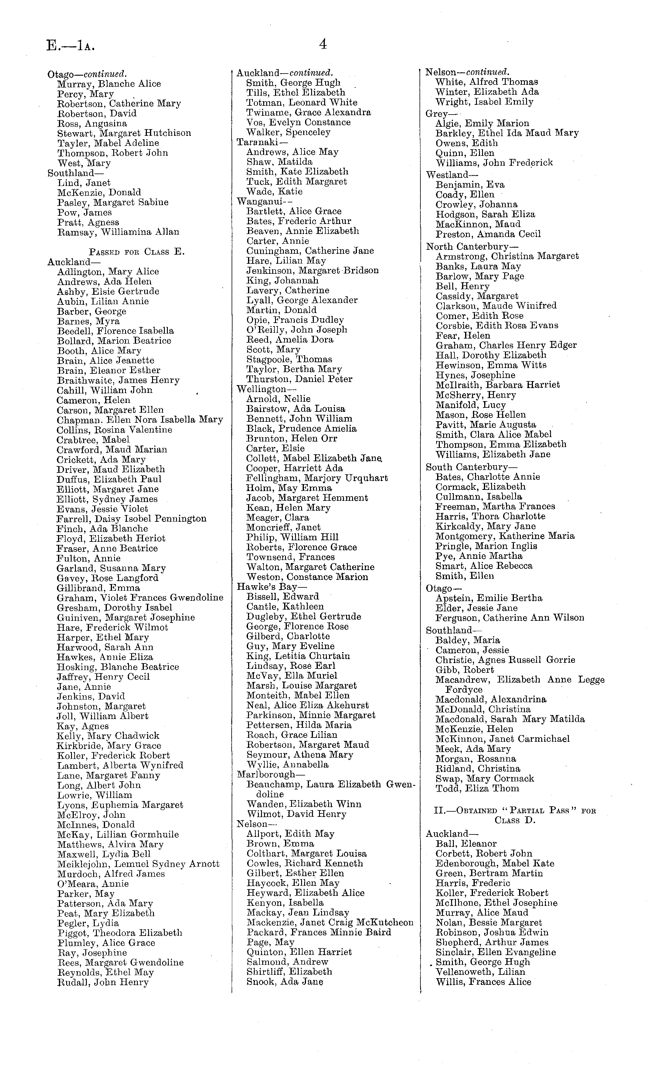 Otago— continued. Murray, Blanche Alice Percy, Mary Robertson, Catherine Mary Robertson, David Ross, Angusina Stewart, Margaret Hutchison Tayler, Mabel Adeline Thompson, Robert John West, Mary Southland — Lind, Janet McKenzie, Donald Pasley, Margaret Sabine Pow, James Pratt, Agness Ramsay, Williamina Allan Passed foe Class E. Auckland— Adlington, Mary Alice Andrews, Ada Helen Ashby, Elsie Gertrude Aubin, Lilian Annie Barber, George Barnes, Myra Beedell, Florence Isabella Bollard, Marion Beatrice Booth, Alice Mary Brain, Alice Jeanette Brain, Eleanor Esther Braithwaite, James Henry Cahill, William John Cameron, Helen Carson, Margaret Ellen Chapman. Ellen Nora Isabella Mary Collins, Rosina Valentine Crabtree, Mabel Crawford, Maud Marian Crickett, Ada Mary Driver, Maud Elizabeth Duffus, Elizabeth Paul Elliott, Margaret Jane Elliott, Sydney James Evans, Jessie Violet Farrell, Daisy Isobel Pennington Finch, Ada Blanche Floyd, Elizabeth Heriot Fraser, Anne Beatrice Fulton, Annie Garland, Susanna Mary Gavey, Rose Langford Gillibrand, Emma Graham, Violet Frances Gwendoline Gresham, Dorothy Isabel Guiniven, Margaret Josephine Hare, Frederick Wilmot Harper, Ethel Mary Harwood, Sarah Ann Hawkes, Annie Eliza Hosking, Blanche Beatrice Jaffrey, Henry Cecil Jane, Annie Jenkins, David Johnston, Margaret Joll, William Albert Kay, Agnes Kelly, Mary Chadwick Kirkbride, Mary Grace Koller, Frederick Robert Lambert, Alberta Wynifred Lane, Margaret Fanny Long, Albert John Lowrie, William Lyons, Euphemia Margaret McElroy, John Mclnnes, Donald McKay, Lillian Gormhuile Matthews, Alvira Mary Maxwell, Lydia Bell Meiklejolm, Lemuel Sydney Arnott Murdoch, Alfred James O'Meara, Annie Parker, May Patterson, Ada Mary Peat, Mary Elizabeth Pegler, Lydia Piggot, Theodora Elizabeth Plumley, Alice Grace Ray, Josephine Rees, Margaret Gwendoline Reynolds,' Ethel May Rudall, John Henry