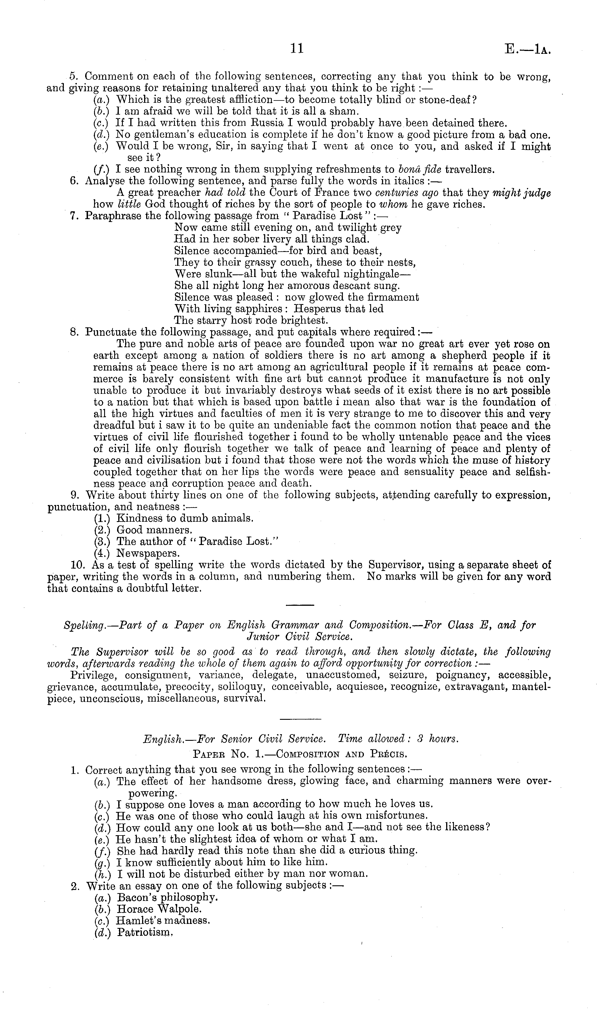 English. — For Senior Civil Service. Time allowed: 3 hours. Papee No. I.—Composition and Peecis. 1. Correct anything that you see wrong in the following sentences: — (a.) The effect of her handsome dress, glowing face, and charming manners were overpowering. (&.) I suppose one loves a man according to how much he loves us. (c.) He was one of those who could laugh at his own misfortunes. (d.) How could any one look at us both—she and I—and not see the likeness? (c.) He hasn't the slightest idea of whom or what I am. (/.) She had hardly read this note than she did a curious thing. (g.) I know sufficiently about him to like him. (h.) I will not be disturbed either by man nor woman. 2. Write an essay on one of the following subjects : — (a.) Bacon's philosophy. (b.) Horace Walpole. (c.) Hamlet's madness. (d.) Patriotism,