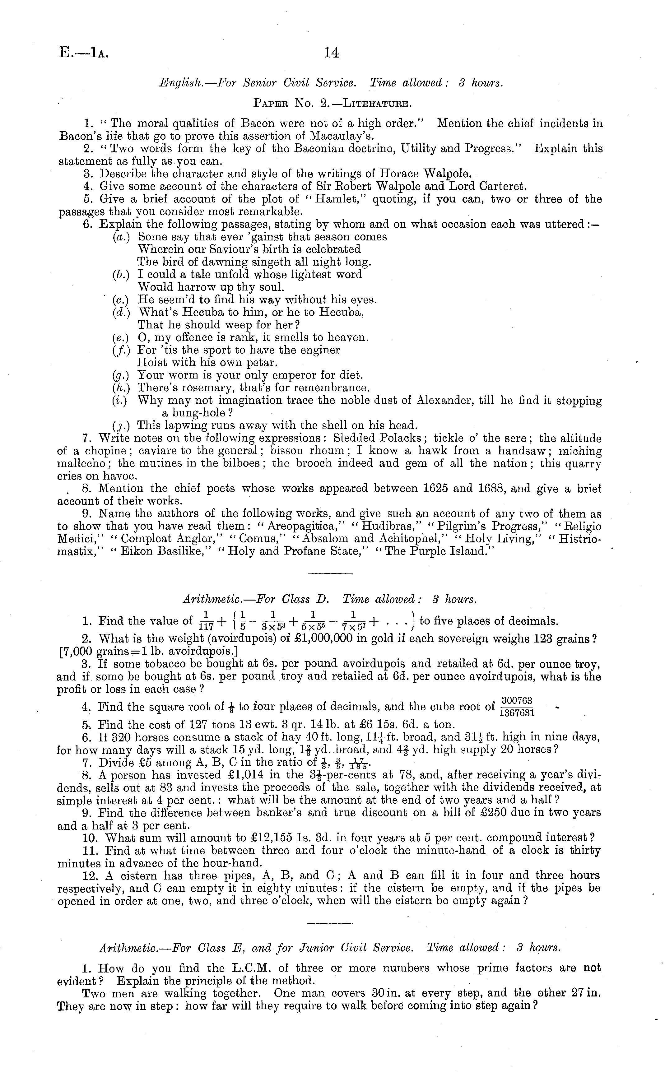 English. — For Senior Civil Service. Time allowed: 3 hours. Papeb No. 2.—Liteeatuee. 1. " The moral qualities of Bacon were not of a high order." Mention the chief incidents in Bacon's life that go to prove this assertion of Macaulay's. 2. " Two words form the key of the Baconian doctrine, Utility and Progress." Explain this statement as fully as you can. 3. Describe the character and style of the writings of Horace Walpole. 4. Give some account of the characters of Sir Bobert Walpole and Lord Carteret. 5. Give a brief account of the plot of "Hamlet," quoting, if you can, two or three of the passages that you consider most remarkable. 6. Explain the following passages, stating by whom and on what occasion each was uttered :— (a.) Some say that ever 'gainst that season comes Wherein our Saviour's birth is celebrated The bird of dawning singeth all night long. (b.) I could a tale unfold whose lightest word Would harrow up thy soul, (c.) He seem'd to find his way without his eyes. (d.) What's Hecuba to him, or he to Hecuba, That he should weep for her ? (c.) 0, my offence is rank, it smells to heaven. (/.) For 'tis the sport to have the enginer Hoist with his own petar. (g.) Your worm is your only emperor for diet. (h.) There's rosemary, that's for remembrance. (i.) Why may not imagination trace the noble dust of Alexander, till he find it stopping a bung-hole ? (j.) This lapwing runs away with the shell on his head. 7. Write notes on the following expressions: Sledded Polacks; tickle o' the sere; the altitude of a chopine; caviare to the general; bisson rheum; I know a hawk from a handsaw; miching mallecho; the mutines in the bilboes; the brooch indeed and gem of all the nation; this quarry cries on havoc. 8. Mention the chief poets whose works appeared between 1625 and 1688, and give a brief account of their works. 9. Name the authors of the following works, and give such an account of any two of them as to show that you have read them: " Areopagitica," " Hudibras," "Pilgrim's Progress," " Beligio Medici," " Compleat Angler," " Comus," " Absalom and Achitophel," " Holy Living," " Histriomastix," " Eikon Basilike," " Holy and Profane State," " The Purple Island."