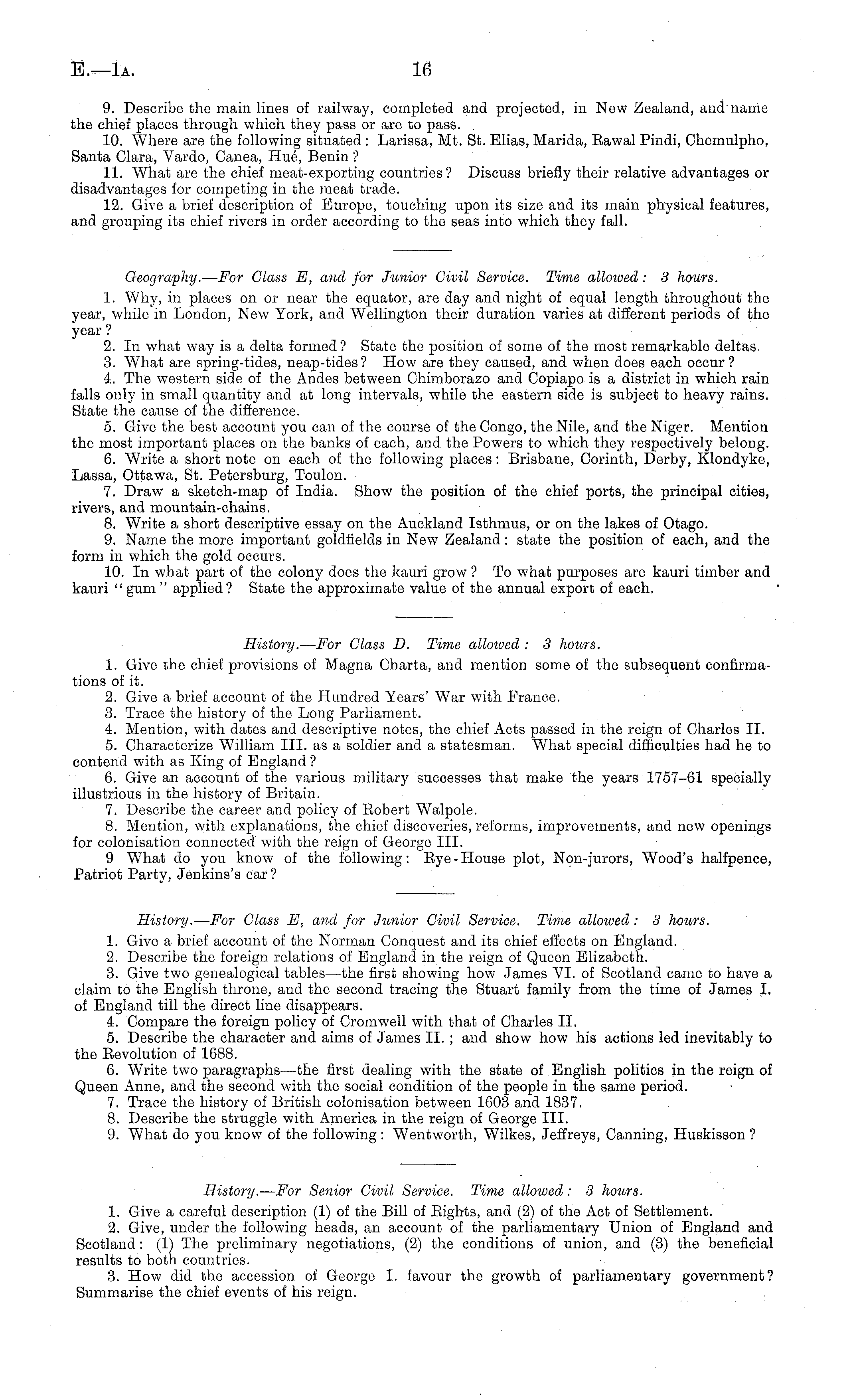 History. — For Class E, and for Junior Civil Service. Time allowed: 3 hours. 1. Give a brief account of the Norman Conquest and its chief effects on England. 2. Describe the foreign relations of England in the reign of Queen Elizabeth. 3. Give two genealogical tables—the first showing how James VI. of Scotland came to have a claim to the English throne, and the second tracing the Stuart family from the time of James I. of England till the direct line disappears. 4. Compare the foreign policy of Cromwell with that of Charles 11. 5. Describe the character and aims of James II.; and show how his actions led inevitably to the Bevolution of 1688. 6. Write two paragraphs —the first dealing with the state of English politics in the reign of Queen Anne, and the second with the social condition of the people in the same period. 7. Trace the history of British colonisation between 1603 and 1837. 8. Describe the struggle with America in the reign of George 111. 9. What do you know of the following : Wentworth, Wilkes, Jeffreys, Canning, Huskisson ? History. — For Senior Civil Service. Time alloived: 3 hours. 1. Give a careful description (1) of the Bill of Bights, and (2) of the Act of Settlement. 2. Give, under the following heads, an account of the parliamentary Union of England and Scotland: (1) The preliminary negotiations, (2) the conditions of union, and (3) the beneficial results to both countries. 3. How did the accession of George I. favour the growth of parliamentary government? Summarise the chief events of his reign.