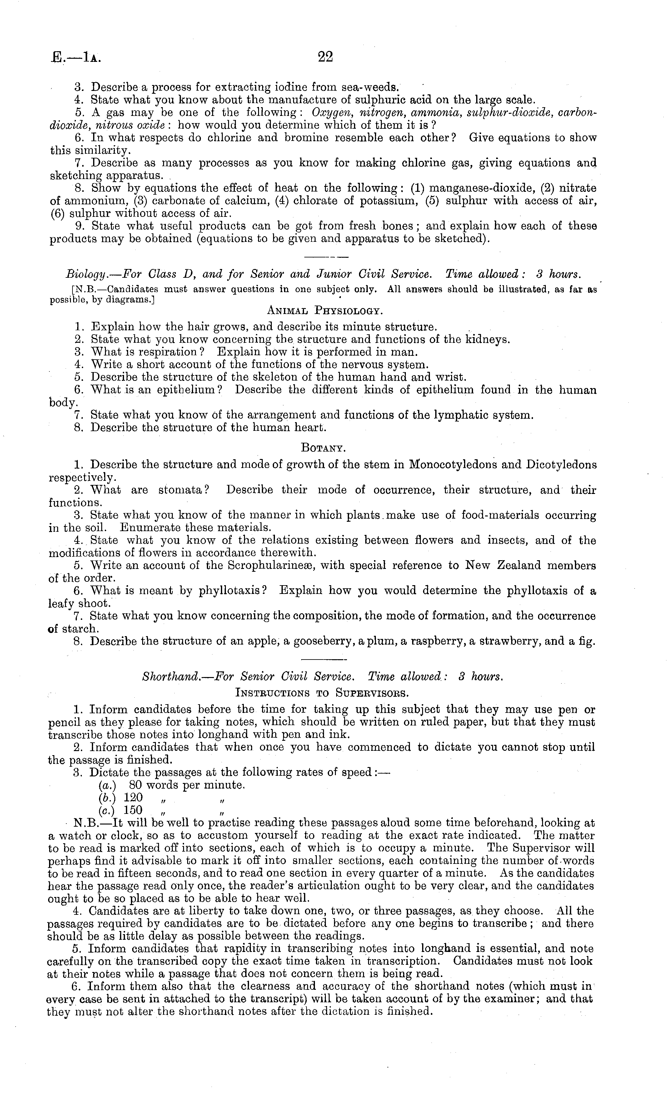 3. Describe a process for extracting iodine from sea-weeds. 4. State what you know about the manufacture of sulphuric acid on the large scale. 5. A gas may be one of the following : Oxygen, nitrogen, ammonia, sulphur-dioxide, carbondioxide, nitrous oxide : how would you determine which of them it is ? 6. In what respects do chlorine and bromine resemble each other? Give equations to show this similarity. 7. Describe as many processes as you know for making chlorine gas, giving equations and sketching apparatus. 8. Show by equations the effect of heat on the following: (1) manganese-dioxide, (2) nitrate of ammonium, (3) carbonate of calcium, (4) chlorate of potassium, (5) sulphur with access of air, (6) sulphur without access of air. 9. State what useful products can be got from fresh bones; and explain how each of these products may be obtained (equations to be given and apparatus to be sketched). Biology. — For Class D, and for Senior and Junior Civil Service. Time allowed: 3 hours. [N.B. —Candidates must answer questions in one subject only. All answers should be illustrated, as far as possible, by diagrams.] Animal Physiology. 1. Explain how the hair grows, and describe its minute structure. 2. State what you know concerning the structure and functions of the kidneys. 3. What is respiration ? Explain how it is performed in man. 4. Write a short account of the functions of the nervous system. 5. Describe the structure of the skeleton of the human hand and wrist. 6. What is an epithelium? Describe the different kinds of epithelium found in the human body. 7. State what you know of the arrangement and functions of the lymphatic system. 8. Describe the structure of the human heart. Botany. 1. Describe the structure and mode of growth of the stem in Monocotyledons and Dicotyledons respectively. 2. What are stomata? Describe their mode of occurrence, their structure, and their functions. 3. State what you know of the manner in which plants make use of food-materials occurring in the soil. Enumerate these materials. 4. State what you know of the relations existing between flowers and insects, and of the modifications of flowers in accordance therewith. 5. Write an account of the Scrophularine®, with special reference to New Zealand members of the order. 6. What is meant by phyllotaxis? Explain how you would determine the phyllotaxis of a leafy shoot. 7. State what you know concerning the composition, the mode of formation, and the occurrence of starch. 8. Describe the structure of an apple, a gooseberry, a plum, a raspberry, a strawberry, and a fig.