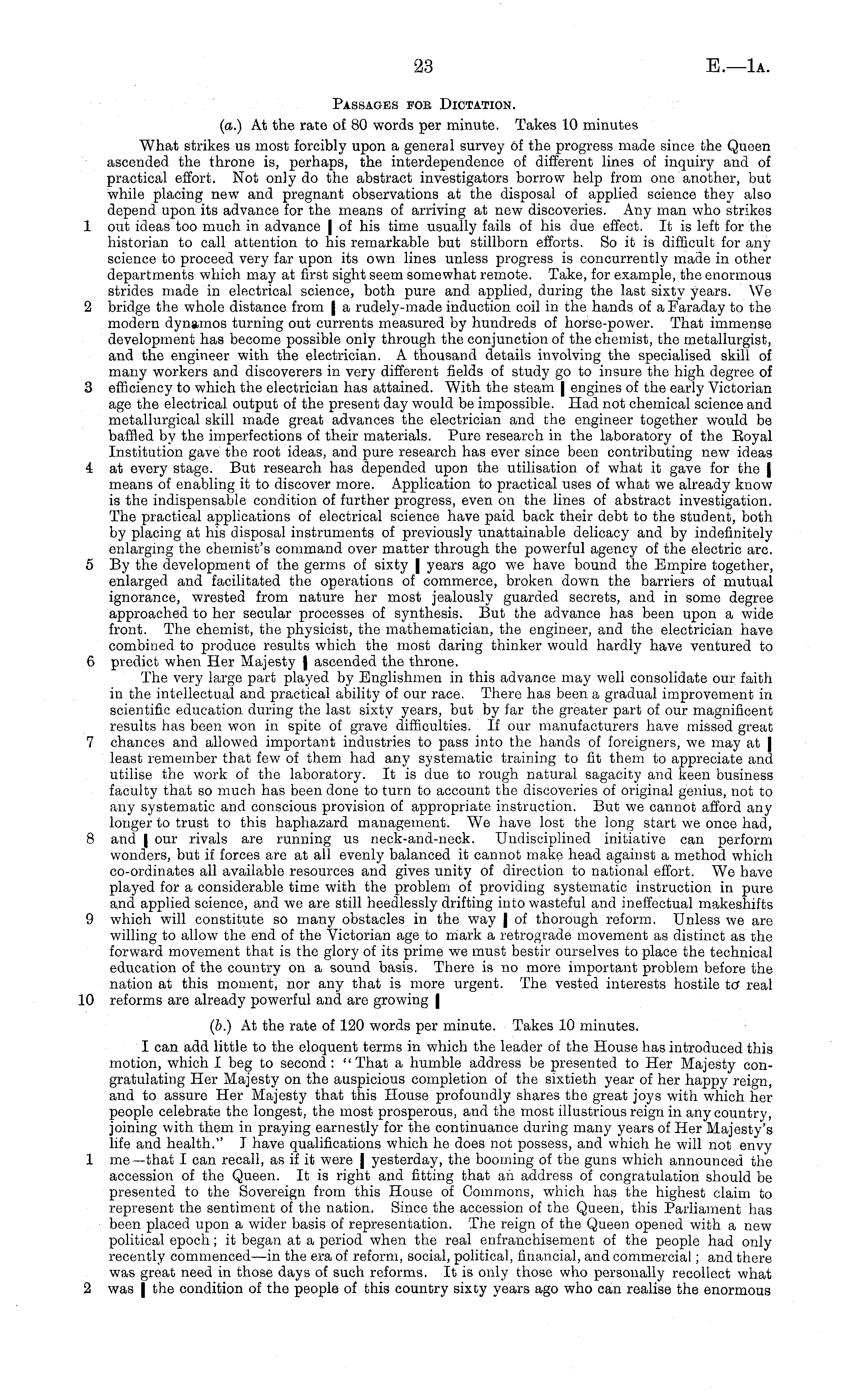 Passages for Dictation. (a.) At the rate of 80 words per minute. Takes 10 minutes What strikes us most forcibly upon a general survey of the progress made since the Queen ascended the throne is, perhaps, the interdependence of different lines of inquiry and of practical effort. Not only do the abstract investigators borrow help from one another, but while placing new and pregnant observations at the disposal of applied science they also depend upon its advance for the means of arriving at new discoveries. Any man who strikes 1 out ideas too much in advance |of his time usually fails of his due effect. It is left for the historian to call attention to his remarkable but stillborn efforts. So it is difficult for any science to proceed very far upon its own lines unless progress is concurrently made in other departments which may at first sight seem somewhat remote. Take, for example, the enormous strides made in electrical science, both pure and applied, during the last sixty years. We 2 bridge the whole distance from | a rudely-made induction coil in the hands of a Faraday to the modern dynamos turning out currents measured by hundreds of horse-power. That immense development has become possible only through the conjunction of the chemist, the metallurgist, and the engineer with the electrician. A thousand details involving the specialised skill of many workers and discoverers in very different fields of study go to insure the high degree of 3 efficiency to which the electrician has attained. With the steam | engines of the early Victorian age the electrical output of the present day would be impossible. Had not chemical science and metallurgical skill made great advances the electrician and the engineer together would be baffled by the imperfections of their materials. Pure research in the laboratory of the Boyal Institution gave the root ideas, and pure research has ever since been contributing new ideas 4 at every stage. But research has depended upon the utilisation of what it gave for the | means of enabling it to discover more. Application to practical uses of what we already know is the indispensable condition of further progress, even on the lines of abstract investigation. The practical applications of electrical science have paid back their debt to the student, both by placing at his disposal instruments of previously unattainable delicacy and by indefinitely enlarging the chemist's command over matter through the powerful agency of the electric arc. 5 By the development of the germs of sixty | years ago we have bound the Empire together, enlarged and facilitated the operations of commerce, broken down the barriers of mutual ignorance, wrested from nature her most jealously guarded secrets, and in some degree approached to her secular processes of synthesis. But the advance has been upon a wide front. The chemist, the physicist, the mathematician, the engineer, and the electrician have combined to produce results which the most daring thinker would hardly have ventured to 6 predict when Her Majesty | ascended the throne. The very large part played by Englishmen in this advance may well consolidate our faith in the intellectual and practical ability of our race. There has been a gradual improvement in scientific education during the last sixty years, but by far the greater part of our magnificent results has been won in spite of grave difficulties. If our manufacturers have missed great 7 chances and allowed important industries to pass into the hands of foreigners, we may at | least remember that few of them had any systematic training to fit them to appreciate and utilise the work of the laboratory. It is due to rough natural sagacity and keen business faculty that so much has been done to turn to account the discoveries of original genius, not to any systematic and conscious provision of appropriate instruction. But we cannot afford any longer to trust to this haphazard management. We have lost the long start we once had, 8 and | our rivals are running us neck-and-neck. Undisciplined initiative can perform wonders, but if forces are at all evenly balanced it cannot make head against a method which co-ordinates all available resources and gives unity of direction to national effort. We have played for a considerable time with the problem of providing systematic instruction in pure and applied science, and we are still heedlessly drifting into wasteful and ineffectual makeshifts 9 which will constitute so many obstacles in the way jof thorough reform. Unless we are willing to allow the end of the Victorian age to mark a retrograde movement as distinct as the forward movement that is the glory of its prime we must bestir ourselves to place the technical education of the country on a sound basis. There is no more important problem before the nation at this moment, nor any that is more urgent. The vested interests hostile to" real 10 reforms are already powerful and are growing | (6.) At the rate of 120 words per minute. Takes 10 minutes. I can add little to the eloquent terms in which the leader of the House has introduced this motion, which I beg to second : "That a humble address be presented to Her Majesty congratulating Her Majesty on the auspicious completion of the sixtieth year of her happy reign, and to assure Her Majesty that this House profoundly shares the great joys with which her people celebrate the longest, the most prosperous, and the most illustrious reign in any country, joining with them in praying earnestly for the continuance during many years of Her Majesty's life and health." I have qualifications which he does not possess, and which he will not envy 1 me—that I can recall, as if it were | yesterday, the booming of the guns which announced the accession of the Queen. It is right and fitting that an address of congratulation should be presented to the Sovereign from this House of Commons, which has the highest claim to represent the sentiment of the nation.