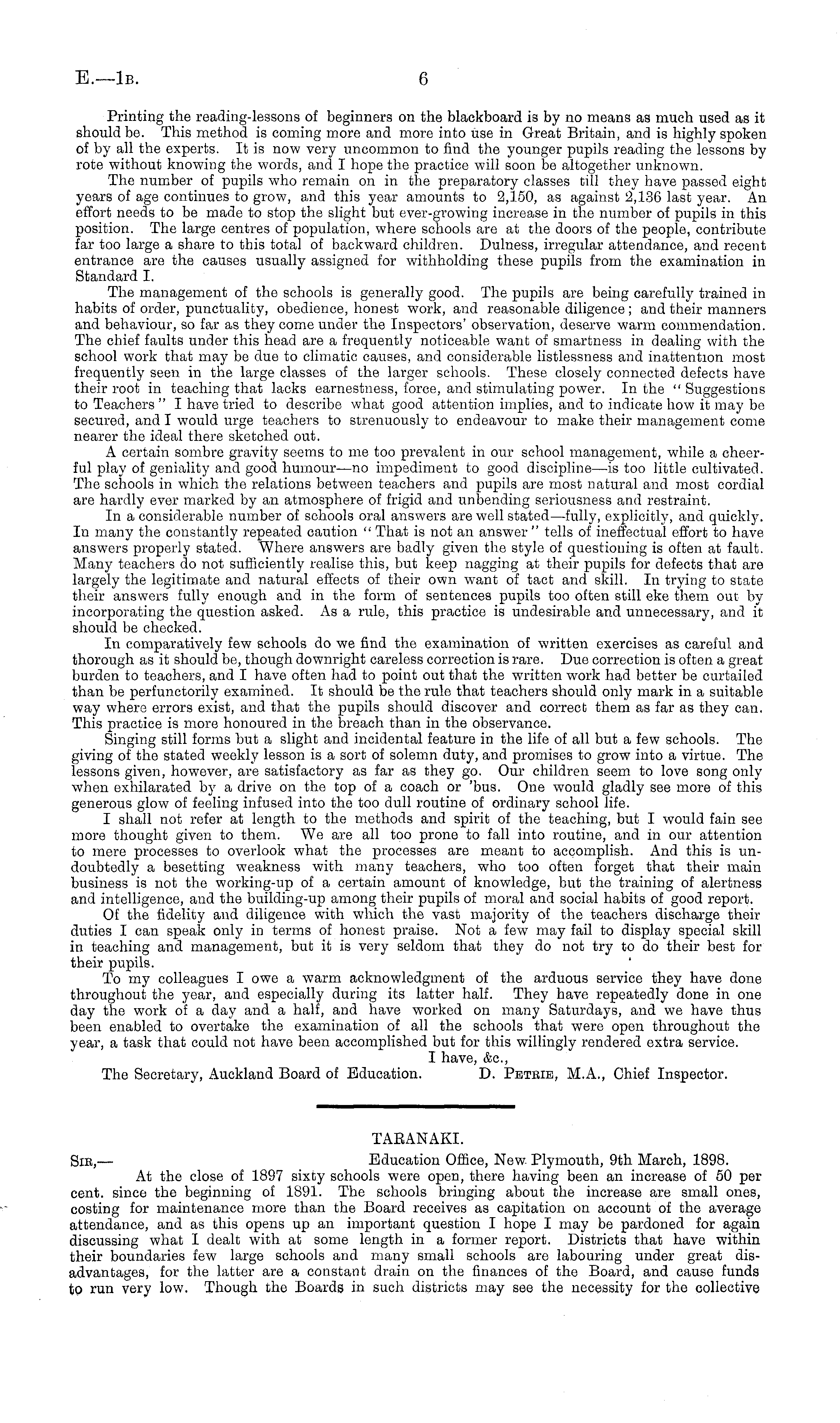 TAEANAKI. Sib,— Education Office, New. Plymouth, 9th March, 1898. At the close of 1897 sixty schools were open, there having been an increase of 50 per cent, since the beginning of 1891. The schools bringing about the increase are small ones, costing for maintenance more than the Board receives as capitation on account of the average attendance, and as this opens up an important question I hope I may be pardoned for again discussing what I dealt with at some length in a former report. Districts that have within their boundaries few large schools and many small schools are labouring under great disadvantages, for the latter are a constant drain on the finances of the Board, and cause funds to run very low. Though the Boards in such districts may see the necessity for the collective