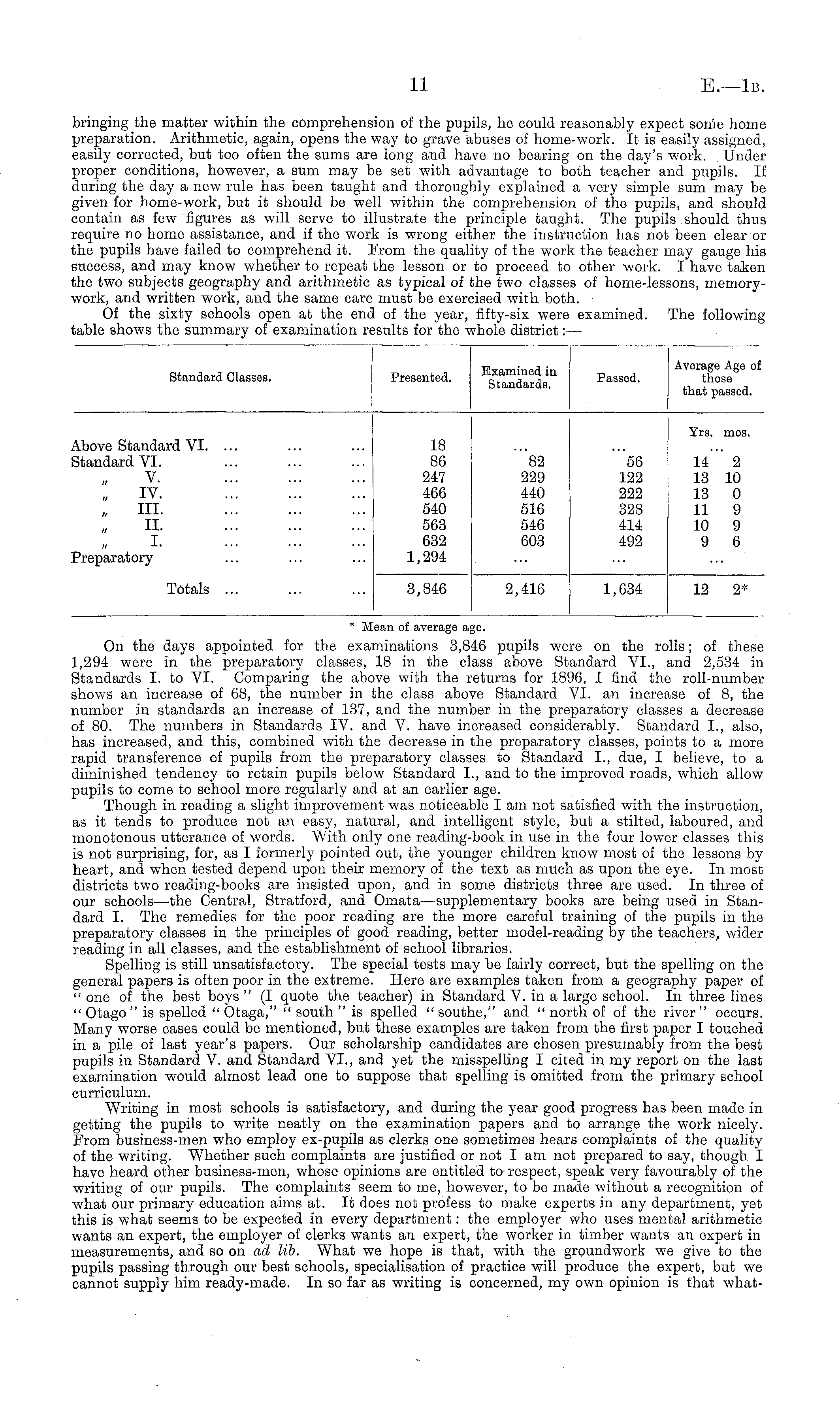 bringing the matter within the comprehension of the pupils, he could reasonably expect sonic home preparation. Arithmetic, again, opens the way to grave abuses of home-work. It is easily assigned, easily corrected, but too often the sums are long and have no bearing on the day's work. Under proper conditions, however, a sum may be set with advantage to both teacher and pupils. If during the day a new rule has been taught and thoroughly explained a very simple sum may be given for home-work, but it should be well within the comprehension of the pupils, and should contain as few figures as will serve to illustrate the principle taught. The pupils should thus require no home assistance, and if the work is wrong either the instruction has not been clear or the pupils have failed to comprehend it. Prom the quality of the work the teacher may gauge his success, and may know whether to repeat the lesson or to proceed to other work. I have taken the two subjects geography and arithmetic as typical of the two classes of home-lessons, memorywork, and written work, and the same care must be exercised with both. Of the sixty schools open at the end of the year, fifty-six were examined. The following table shows the summary of examination results for the whole district: —
