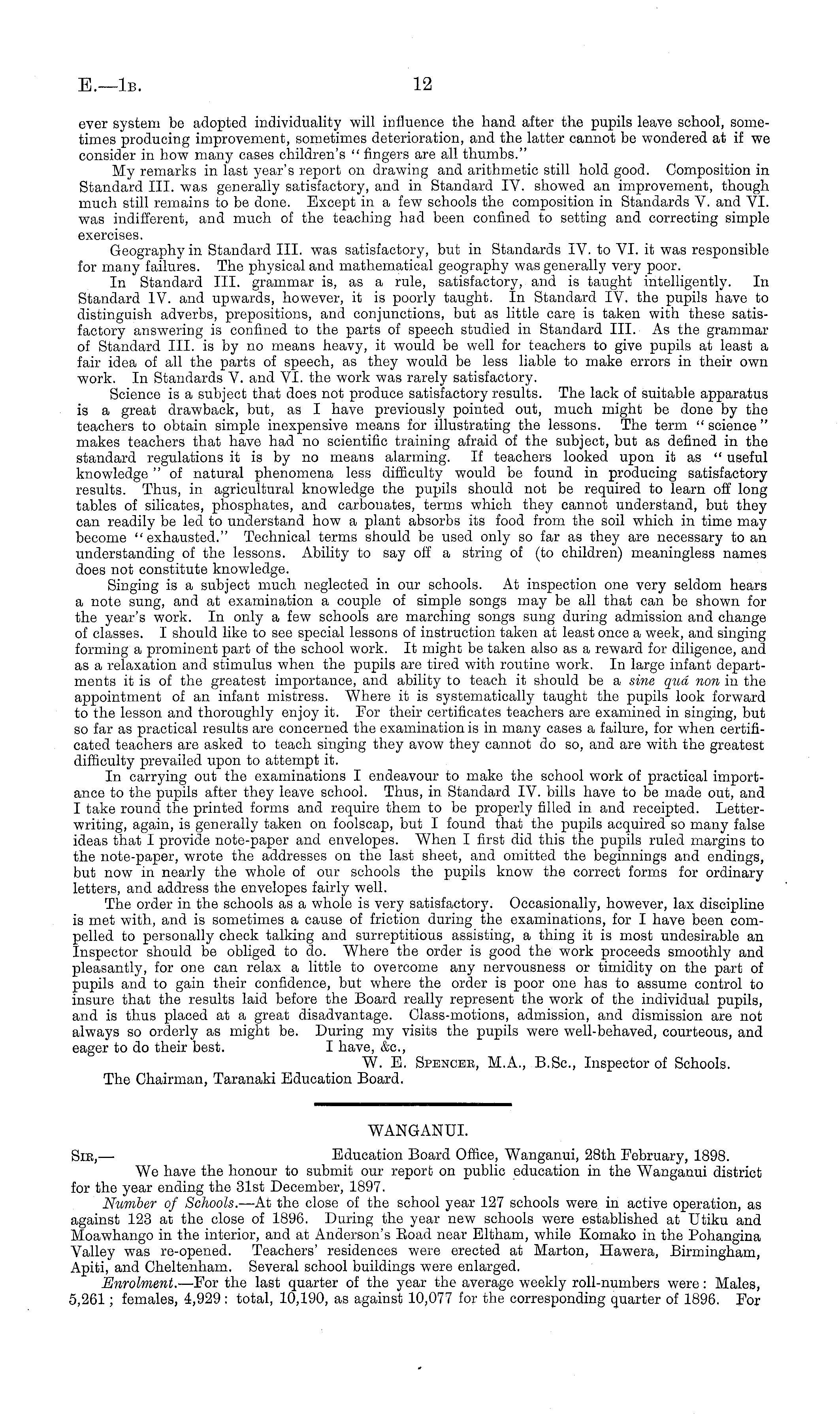 WANGANUI. Sib, — Education Board Office, Wanganui, 28th February, 1898. We have the honour to submit our report on public education in the Wanganui district for the year ending the 31st December, 1897. Number of Schools. —At the close of the school year 127 schools were in active operation, as against 123 at the close of 1896. During the year new schools were established at Utiku and Moawhango in the interior, and at Anderson's Eoad near Eltham, while Komako in the Pohangina Valley was re-opened. Teachers' residences were erected at Marton, Hawera, Birmingham, Apiti, and Cheltenham. Several school buildings were enlarged. Enrolment. —For the last quarter of the year the average weekly roll-numbers were: Males, 5,261; females, 4,929 : total, 10,190, as against 10,077 for the corresponding quarter of 1896. For