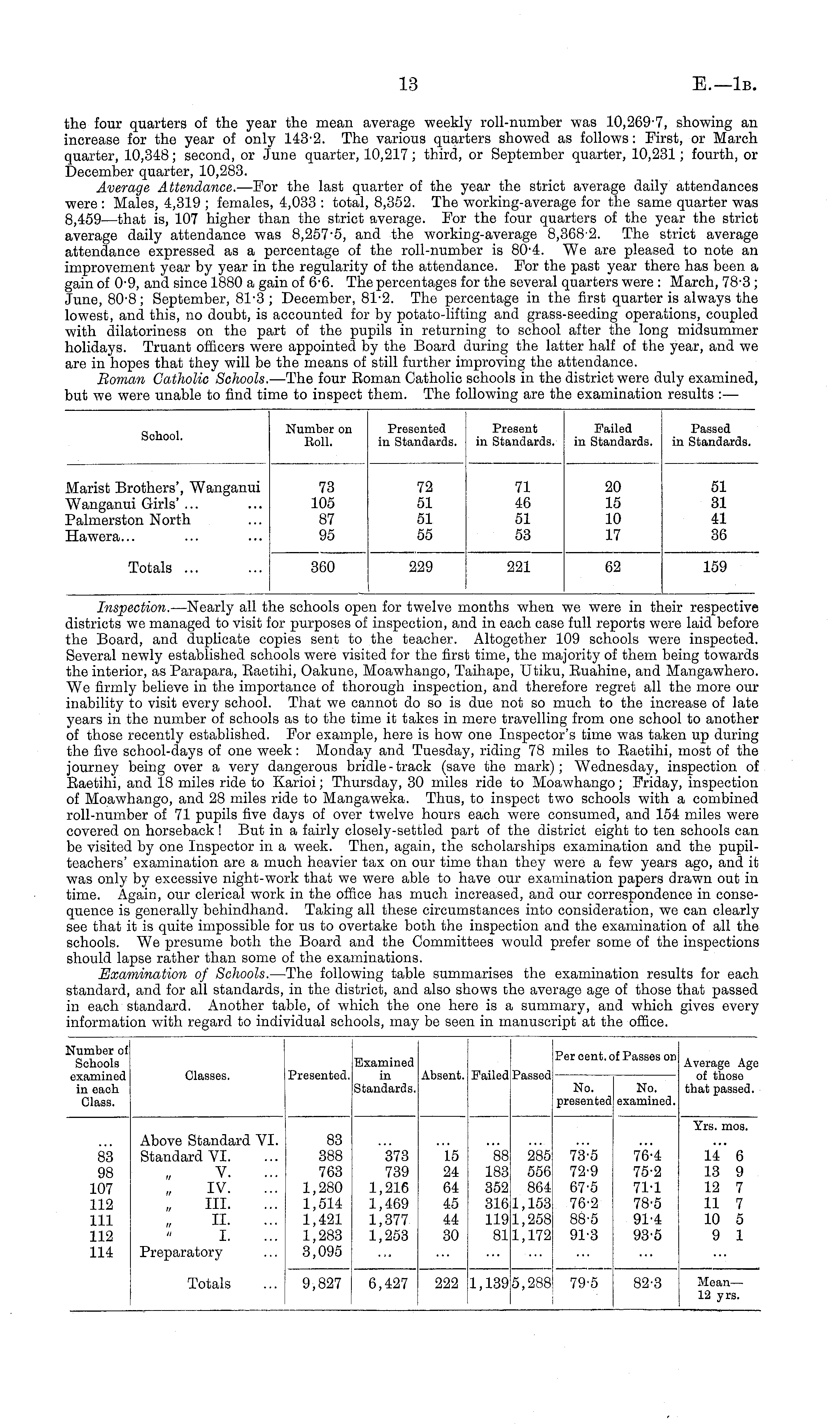 Inspection. —Nearly all the schools open for twelve months when we were in their respective districts we managed to visit for purposes of inspection, and in each case full reports were laid before the Board, and duplicate copies sent to the teacher. Altogether 109 schools were inspected. Several newly established schools were visited for the first time, the majority of them being towards the interior, as Parapara, Raetihi, Oakune, Moawhango, Taihape, Utiku, Euahine, and Mangawhero. We firmly believe in the importance of thorough inspection, and therefore regret all the more our inability to visit every school. That we cannot do so is due not so much to the increase of late years in the number of schools as to the time it takes in mere travelling from one school to another of those recently established. For example, here is how one Inspector's time was taken up during the five school-days of one week: Monday and Tuesday, riding 78 miles to Eaetihi, most of the journey being over a very dangerous bridle-track (save the mark); Wednesday, inspection of Eaetihi, and 18 miles ride to Karioi; Thursday, 30 miles ride to Moawhango; Friday, inspection of Moawhango, and 28 miles ride to Mangaweka. Thus, to inspect two schools with a combined roll-number of 71 pupils five days of over twelve hours each were consumed, and 154 miles were covered on horseback ! But in a fairly closely-settled part of the district eight to ten schools can be visited by one Inspector in a week. Then, again, the scholarships examination and the pupilteachers' examination are a much heavier tax on our time than they were a few years ago, and it was only by excessive night-work that we were able to have our examination papers drawn out in time. Again, our clerical work in the office has much increased, and our correspondence in consequence is generally behindhand. Taking all these circumstances into consideration, we can clearly see that it is quite impossible for us to overtake both the inspection and the examination of all the schools. We presume both the Board and the Committees would prefer some of the inspections should lapse rather than some of the examinations. Examination of Schools. —The following table summarises the examination results for each standard, and for all standards, in the district, and also shows che average age of those that passed in each standard. Another table, of which the one here is a summary, and which gives every information with regard to individual schools, may be seen in manuscript at the office.