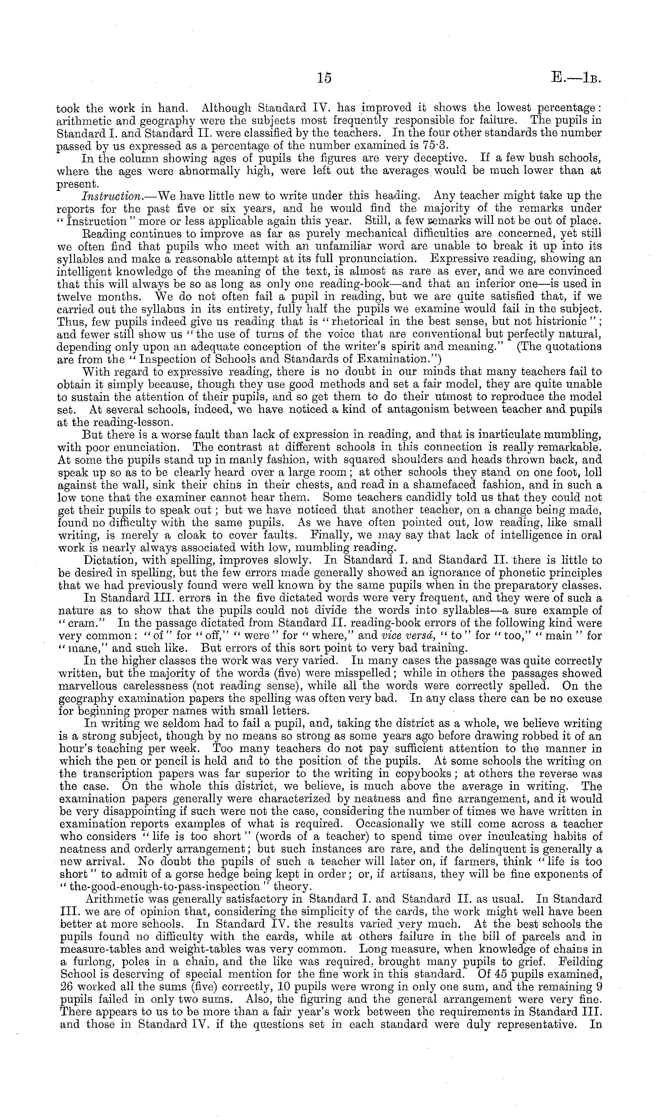 took the work in hand. Although Standard IV. has improved it shows the lowest percentage: arithmetic and geography were the subjects most frequently responsible for failure. The pupils in Standard I. and Standard 11. were classified by the teachers. In the four other standards the number passed by us expressed as a percentage of the number examined is 75-3. In the column showing ages of pupils the figures are very deceptive. If a few bush schools, where the ages were abnormally high, were left out the averages would be much lower than at present. Instruction. —We have little new to write under this heading. Any teacher might take up the reports for the past five or six years, and he would find the majority of the remarks under " Instruction " more or less applicable again this year. Still, a few remarks will not be out of place. Beading continues to improve as far as purely mechanical difficulties are concerned, yet still we often find that pupils who meet with an unfamiliar word are unable to break it up into its syllables and make a reasonable attempt at its full pronunciation. Expressive reading, showing an intelligent knowledge of the meaning of the text, is almost as rare as ever, and we are convinced that this will always be so as long as only one reading-book—and that an inferior one—is used in twelve months. We do not often fail a pupil in reading, but we are quite satisfied that, if we carried out the syllabus in its entirety, fully half the pupils we examine would fail in the subject. Thus, few pupils indeed give us reading that is " rhetorical in the best sense, but not histrionic " ; and fewer still show us "the use of turns of the voice that are conventional but perfectly natural, depending only upon an adequate conception of the writer's spirit and meaning." (The quotations are from the " Inspection of Schools and Standards of Examination.") With regard to expressive reading, there is no doubt in our minds that many teachers fail to obtain it simply because, though they use good methods and set a fair model, they are quite unable to sustain the attention of their pupils, and so get them to do their utmost to reproduce the model set. At several schools, indeed, we have noticed a kind of antagonism between teacher and pupils at the reading-lesson. But there is a worse fault than lack of expression in reading, and that is inarticulate mumbling, with poor enunciation. The contrast at different schools in this connection is really remarkable. At some the pupils stand up in manly fashion, with squared shoulders and heads thrown back, and speak up so as to be clearly heard over a large room; at other schools they stand on one foot, 101 l against the wall, sink their chins in their chests, and read in a shamefaced fashion, and in such a low tone that the examiner cannot hear them. Some teachers candidly told us that they could not get their pupils to speak out ; but we have noticed that another teacher, on a change being made, found no difficulty with the same pupils. As we have often pointed out, low reading, like small writing, is merely a cloak to cover faults. Finally, we may say that lack of intelligence in oral work is nearly always associated with low, mumbling reading. Dictation, with spelling, improves slowly. In Standard I. and Standard 11. there is little to be desired in spelling, but the few errors made generally showed an ignorance of phonetic principles that we had previously found were well known by the same pupils when in the preparatory classes. In Standard 111. errors in the five dictated words were very frequent, and they were of such a nature as to show that the pupils could not divide the words into syllables —a sure example of " cram." In the passage dictated from Standard 11. reading-book errors of the following kind were very common : " of" for " off," " were " for " where," and vice versa, "to " for " too," " main " for " mane," and such like. But errors of this sort point to very bad training. In the higher classes the work was very varied. In many cases the passage was quite correctly written, but the majority of the words (five) were misspelled; while in others the passages showed marvellous carelessness (not reading sense), while all the words were correctly spelled. On the geography examination papers the spelling was often very bad. In any class there can be no excuse for beginning proper names with small letters. In writing we seldom had to fail a pupil, and, taking the district as a whole, we believe writing is a strong subject, though by no means so strong as some years ago before drawing robbed it of an hour's teaching per week. Too many teachers do not pay sufficient attention to the manner in which the pen or pencil is held and to the position of the pupils. At some schools the writing on the transcription papers was far superior to the writing in copybooks; at others the reverse was the case. On the whole this district, we believe, is much above the average in writing. The examination papers generally were characterized by neatness and fine arrangement, and it would be very disappointing if such were not the case, considering the number of times we have written in examination reports examples of what is required. Occasionally we still come across a teacher who considers " life is too short " (words of a teacher) to spend time over inculcating habits of neatness and orderly arrangement; but such instances are rare, and the delinquent is generally a new arrival. No doubt the pupils of such a teacher will later on, if farmers, think "life is too short " to admit of a gorse hedge being kept in order; or, if artisans, they will be fine exponents of " the-good-enough-to-pass-inspection " theory. Arithmetic was generally satisfactory in Standard I. and Standard 11. as usual. In Standard 111. we are of opinion that, considering the simplicity of the cards, the work might well have been better at more schools. In Standard IV. the results varied