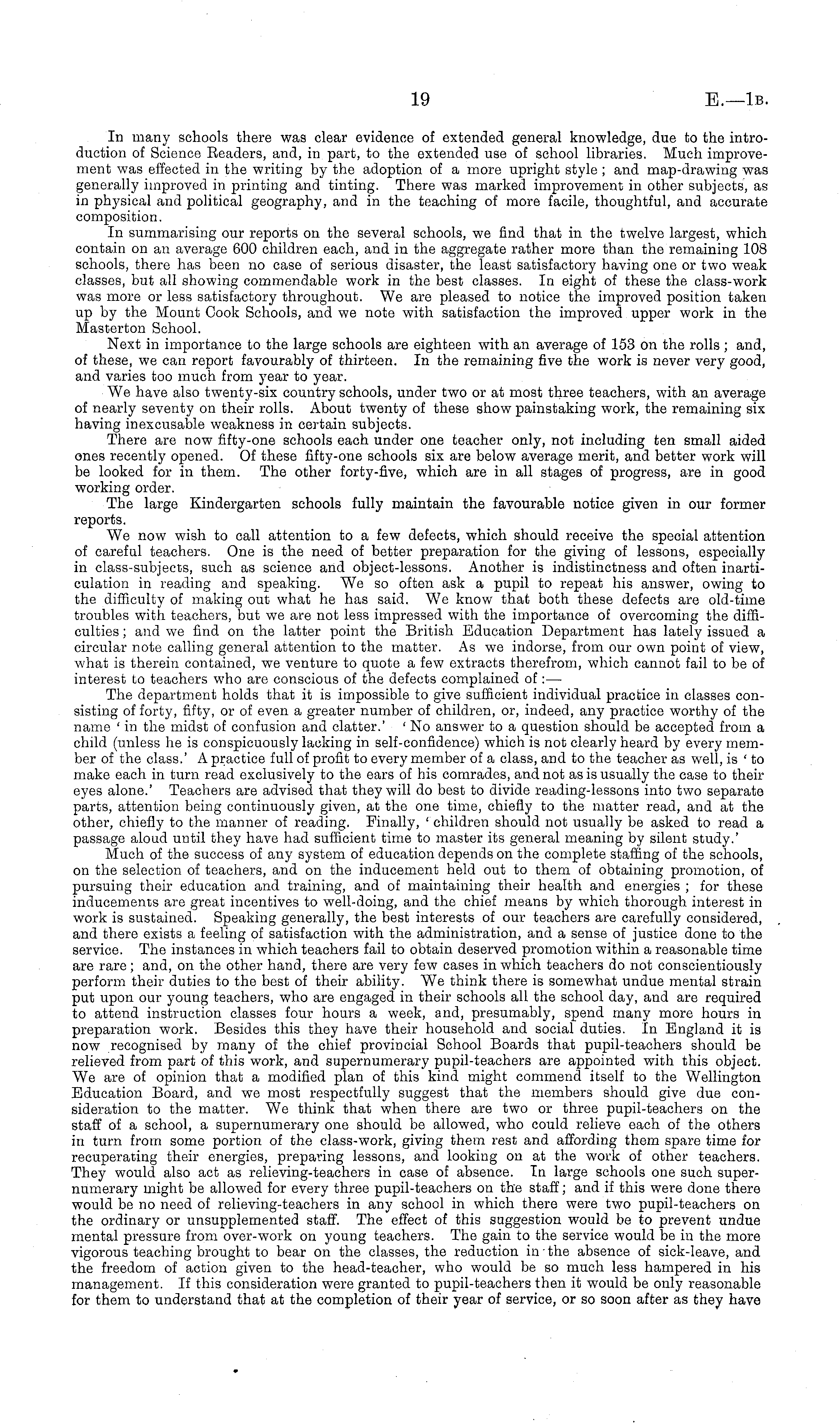 In many schools there was clear evidence of extended general knowledge, due to the introduction of Science Eeaders, and, in part, to the extended use of school libraries. Much improvement was effected in the writing by the adoption of a more upright style ; and map-drawing was generally improved in printing and tinting. There was marked improvement in other subjects, as in physical and political geography, and in the teaching of more facile, thoughtful, and accurate composition. In summarising our reports on the several schools, we find that in the twelve largest, which contain on an average 600 children each, and in the aggregate rather more than the remaining 108 schools, there has been no case of serious disaster, the least satisfactory having one or two weak classes, but all showing commendable work in the best classes. In eight of these the class-work was more or less satisfactory throughout. We are pleased to notice the improved position taken up by the Mount Cook Schools, and we note with satisfaction the improved upper work in the Masterton School. Next in importance to the large schools are eighteen with an average of 153 on the rolls ; and, of these, we can report favourably of thirteen. In the remaining five the work is never very good, and varies too much from year to year. We have also twenty-six country schools, under two or at most three teachers, with an average of nearly seventy on their rolls. About twenty of these show painstaking work, the remaining six having inexcusable weakness in certain subjects. There are now fifty-one schools each under one teacher only, not including ten small aided ones recently opened. Of these fifty-one schools six are below average merit, and better work will be looked for in them. The other forty-five, which are in all stages of progress, are in good working order. The large Kindergarten schools fully maintain the favourable notice given in our former reports. We now wish to call attention to a few defects, which should receive the special attention of careful teachers. One is the need of better preparation for the giving of lessons, especially in class-subjects, such as science and object-lessons. Another is indistinctness and often inarticulation in reading and speaking. We so often ask a pupil to repeat his answer, owing to the difficulty of making out what he has said. We know that both these defects are old-time troubles with teachers, but we are not less impressed with the importance of overcoming the difficulties ; and we find on the latter point the British Education Department has lately issued a circular note calling general attention to the matter. As we indorse, from our own point of view, what is therein contained, we venture to quote a few extracts therefrom, which cannot fail to be of interest to teachers who are conscious of the defects complained of: — The department holds that it is impossible to give sufficient individual practice in classes consisting of forty, fifty, or of even a greater number of children, or, indeed, any practice worthy of the name ' in the midst of confusion and clatter.' ' No answer to a question should be accepted from a child (unless he is conspicuously lacking in self-confidence) which is not clearly heard by every member of the class.' A practice full of profit to every member of a class, and to the teacher as well, is ' to make each in turn read exclusively to the ears of his comrades, and not as is usually the case to their eyes alone.' Teachers are advised that they will do best to divide reading-lessons into two separate parts, attention being continuously given, at the one time, chiefly to the matter read, and at the other, chiefly to the manner of reading. Finally, ' children should not usually be asked to read a passage aloud until they have had sufficient time to master its general meaning by silent study.' Much of the success of any system of education depends on the complete staffing of the schools, on the selection of teachers, and on the inducement held out to them of obtaining promotion, of pursuing their education and training, and of maintaining their health and energies ; for these inducements are great incentives to well-doing, and the chief means by which thorough interest in work is sustained. Speaking generally, the best interests of our teachers are carefully considered, and there exists a feeling of satisfaction with the administration, and a sense of justice done to the service. The instances in which teachers fail to obtain deserved promotion within a reasonable time are rare; and, on the other hand, there are very few cases in which teachers do not conscientiously perform their duties to the best of their ability. We think there is somewhat undue mental strain put upon our young teachers, who are engaged in their schools all the school day, and are required to attend instruction classes four hours a week, and, presumably, spend many more hours in preparation work. Besides this they have their household and social duties. In England it is now recognised by many of the chief provincial School Boards that pupil-teachers should be relieved from part of this work, and supernumerary pupil-teachers are appointed with this object. We are of opinion that a modified plan of this kind might commend itself to the Wellington Education Board, and we most respectfully suggest that the members should give due consideration to the matter. We think that when there are two or three pupil-teachers on the staff of a school, a supernumerary one should be allowed, who could relieve each of the others in turn from some portion of the class-work, giving them rest and affording them spare time for recuperating their energies, preparing lessons, and looking on at the work of other teachers. They would also act as relieving-teachers in case of absence. In large schools one such supernumerary might be allowed for every three pupil-teachers on the staff; and if this were done there would be no ne