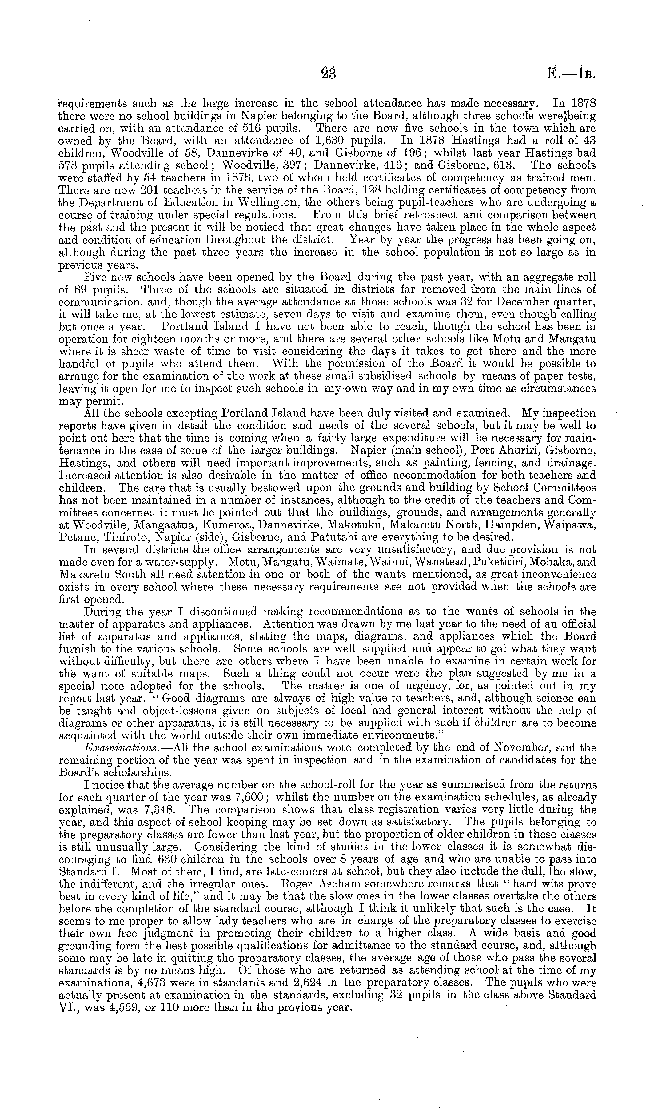 requirements such as the large increase in the school attendance has made necessary. In 1878 there were no school buildings in Napier belonging to the Board, although three schools were|being carried on, with an attendance of 516 pupils. There are now five schools in the town which are owned by the Board, with an attendance of 1,630 pupils. In 1878 Hastings had a roll of 43 children, Woodvilie of 58, Damievirke of 40, and Gisborne of 196; whilst last year Hastings had 578 pupils attending school; Woodvilie, 397 ; Dannevirke, 416 ; and Gisborne, 613. The schools were staffed by 54 teachers in 1878, two of whom held certificates of competency as trained men. There are now 201 teachers in the service of the Board, 128 holding certificates of competency from the Department of Education in Wellington, the others being pupil-teachers who are undergoing a course of training under special regulations. From this brief retrospect and comparison between the past and the present it will be noticed that great changes have taken place in the whole aspect and condition of education throughout the district. Year by year the progress has been going on, although during the past three years the increase in the school population is not so large as in previous years. Five new schools have been opened by the Board during the past year, with an aggregate roll of 89 pupils. Three of the schools are situated in districts far removed from the main lines of communication, and, though the average attendance at those schools was 32 for December quarter, it will take me, at the lowest estimate, seven days to visit and examine them, even though calling but once a year. Portland Island I have not been able to reach, though the school has been in operation for eighteen months or more, and there are several other schools like Motu and Mangatu where it is sheer waste of time to visit considering the days it takes to get there and the mere handful of pupils who attend them. With the permission of the Board it would be possible to arrange for the examination of the work at these small subsidised schools by means of paper tests, leaving it open for me to inspect such schools in my own way and in my own time as circumstances may permit. All the schools excepting Portland Island have been duly visited and examined. My inspection reports have given in detail the condition and needs of the several schools, but it may be well to point out here that the time is coming when a fairly large expenditure will be necessary for maintenance in the case of some of the larger buildings. Napier (main school), Port Ahuriri, Gisborne, Hastings, and others will need important improvements, such as painting, fencing, and drainage. Increased attention is also desirable in the matter of office accommodation for both teachers and children. The care that is usually bestowed upon the grounds and building by School Committees has not been maintained in a number of instances, although to the credit of the teachers and Committees concerned it must be pointed out that the buildings, grounds, and arrangements generally at Woodvilie, Mangaatua, Kumeroa, Dannevirke, Makotuku, Makaretu North, Hampden, Waipawa, Petane, Tiniroto, Napier (side), Gisborne, and Patutahi are everything to be desired. In several districts the office arrangements are very unsatisfactory, and due provision is not made even for a water-supply. Motu, Mangatu, Waimate, Wainui, Wanstead, Puketitiri, Mohaka, and Makaretu South all need attention in one or both of the wants mentioned, as great inconvenience exists in every school where these necessary requirements are not provided when the schools are first opened. During the year I discontinued making recommendations as to the wants of schools in the matter of apparatus and appliances. Attention was drawn by me last year to the need of an official list of apparatus and appliances, stating the maps, diagrams, and appliances which the Board furnish to the various schools. Some schools are well supplied and appear to get what they want without difficulty, but there are others where 1 have been unable to examine in certain work for the want of suitable maps. Such a thing could not occur were the plan suggested by me in a special note adopted for the schools. The matter is one of urgency, for, as pointed out in my report last year, " Good diagrams are always of high value to teachers, and, although science can be taught and object-lessons given on subjects of local and general interest without the help of diagrams or other apparatus, it is still necessary to be .supplied with such if children are to become acquainted with the world outside their own immediate environments." Examinations. —All the school examinations were completed by the end of November, and the remaining portion of the year was spent in inspection and in the examination of candidates for the Board's scholarships. I notice that the average number on the school-roll for the year as summarised from the returns for each quarter of the year was 7,600; whilst the number on the examination schedules, as already explained, was 7,348. The comparison shows that class registration varies very little during the year, and this aspect of school-keeping may be set down as satisfactory. The pupils belonging to the preparatory classes are fewer than last year, but the proportion of older children in these classes is still unusually large. Considering the kind of studies in the lower classes it is somewhat discouraging to find 630 children in the schools over 8 years of age and who are unable to pass into Standard I. Most of them, I find, are late-comers at school, but they also include the dull, the slow, the indifferent, and the irregular ones. Soger Ascham somewhere remarks that "hard wits prove best in every kind of life," and it may be that the slow ones in the lower classes overtake the others before the completion of the standard course, although I think it unlikely that such is the c