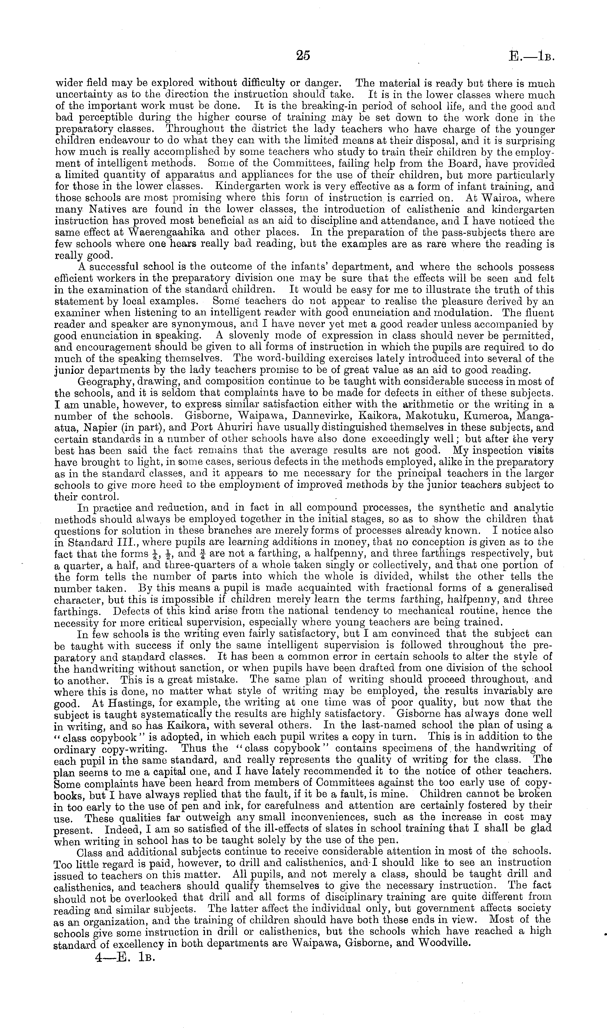 wider field may be explored without difficulty or danger. The material is ready but there is much uncertainty as to the direction the instruction should take. It is in the lower classes where much of the important work must be done. It is the breaking-in period of school life, and the good and bad perceptible during the higher course of training may be set down to the work done in the preparatory classes. Throughout the district the lady teachers who have charge of the younger children endeavour to do what they can with the limited means at their disposal, and it is surprising how much is really accomplished by some teachers who study to train their children by the employment of intelligent methods. Some of the Committees, failing help from the Board, have provided a limited quantity of apparatus and appliances for the use of their children, but more particularly for those in the lower classes. Kindergarten work is very effective as a form of infant training, and those schools are most promising where this form of instruction, is carried on. At Wairoa, where many Natives are found in the lower classes, the introduction of calisthenic and kindergarten instruction has proved most beneficial as an aid to discipline and attendance, and I have noticed the same effect at Waerengaahika and other places. In the preparation of the pass-subjects there are few schools where one hears really bad reading, but the examples are as rare where the reading is really good. A successful school is the outcome of the infants' department, and where the schools possess efficient workers in the preparatory division one may be sure that the effects will be seen and felt in the examination of the standard children. It would be easy for me to illustrate the truth of this statement by local examples. Some teachers do not appear to realise the pleasure derived by an examiner when listening to an intelligent reader with good enunciation and modulation. The fluent reader and speaker are synonymous, and I have never yet met a good reader unless accompanied by good enunciation in speaking. A slovenly mode of expression in class should never be permitted, and encouragement should be given to all forms of instruction in which the pupils are required to do much of the speaking themselves. The word-building exercises lately introduced into several of the junior departments by the lady teachers promise to be of great value as an aid to good reading. Geography, drawing, and composition continue to be taught with considerable success in most of the schools, and it is seldom that complaints have to be made for defects in either of these subjects. I am unable, however, to express similar satisfaction either with the arithmetic or the writing in a number of the schools. Gisborne, Waipawa, Dannevirke, Kaikora, Makotuku, Kumeroa, Mangaatua, Napier (in part), and Port Ahuriri have usually distinguished themselves in these subjects, and certain standards in a number of other schools have also done exceedingly well; but after the very best has been said the fact remains that the average results are not good. My inspection visits have brought to light, in some cases, serious defects in the methods employed, alike in the preparatory as in the standard classes, and it appears to me necessary for the principal teachers in the larger schools to give more heed to the employment of improved methods by the junior teachers subject to their control. In practice and reduction, and in fact in all compound processes, the synthetic and analytic methods should always be employed together in the initial stages, so as to show the children that questions for solution in these branches are merely forms of processes already known. I notice also in Standard 111., where pupils are learning additions in money, that no conception is given as to the fact that the forms J, -|, and f are not a farthing, a halfpenny, and three farthings respectively, but a quarter, a half, and three-quarters of a whole taken singly or collectively, and that one portion of the form tells the number of parts into which the whole is divided, whilst the other tells the number taken. By this means a pupil is made acquainted with fractional forms of a generalised character, but this is impossible if children merely learn the terms farthing, halfpenny, and three farthings. Defects of this kind arise from the national tendency to mechanical routine, hence the necessity for more critical supervision, especially where young teachers are being trained. In few schools is the writing even fairly satisfactory, but I am convinced that the subject can be taught with success if only the same intelligent supervision is followed throughout the preparatory and standard classes. It has been a common error in certain schools to alter the style of the handwriting without sanction, or when pupils have been drafted from one division of the school to another. This is a great mistake. The same plan of writing should proceed throughout, and where this is done, no matter what style of writing may be employed, the results invariably are good. At Hastings, for example, the writing at one time was of poor quality, but now that the subject is taught systematically the results are highly satisfactory. Gisborne has always done well in writing, and so has Kaikora, with several others. In the last-named school the plan of using a " class copybook "is adopted, in which each pupil writes a copy in turn. This is in addition to the ordinary copy-writing. Thus the "class copybook" contains specimens of. the handwriting of each pupil in the same standard, and really represents the quality of writing for the class. The plan seems to me a capital one, and I have lately recommended it to the notice of other teachers. Some complaints have been heard from members of Committees against the too early use of copybooks, but I have always replied that the fault, if it be a fault, is mine. Children cannot be broken in too early to t