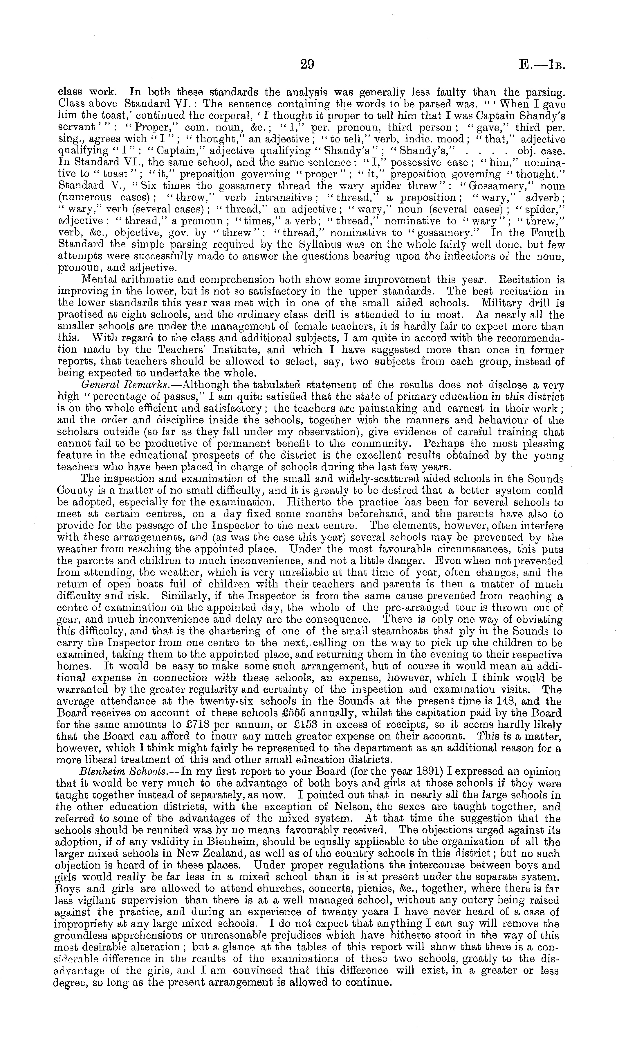 class work. In both these standards the analysis was generally less faulty than the parsing. Class above Standard VI. : The sentence containing the words to be parsed was, " ' When I gave him the toast,' continued the corporal, ' I thought it proper to tell him that I was Captain Shandy's servant'": "Proper," com. noun, &c.; "I," per. pronoun, third person; "gave," third per. sing., agrees with "I "; " thought," an adjective; "to tell," verb, indie, mood; "that," adjective qualifying "I "; " Captain," adjective qualifying " Shandy's "; "Shandy's," .... obj. case. In Standard VI., the same school, and the same sentence : " I," possessive case ; " him," nominative to " toast "; "it," preposition governing "proper"; "it," preposition governing "thought." Standard V., "Six times the gossamery thread the wary spider threw": "Gossamery," noun (numerous cases); "threw," verb intransitive; "thread," a preposition; "wary," adverb; " wary," verb (several cases) ; " thread," an adjective ; " wary," noun (several cases) ; " spider," adjective; " thread," a pronoun ; " times," a verb; "thread," nominative to "wary"; "threw," verb, &c, objective, gov. by "threw"; "thread," nominative to "gossamery." In the Fourth Standard the simple parsing required by the Syllabus was on the whole fairly well done, but few attempts were successfully made to answer the questions bearing upon the inflections of the noun, pronoun, and adjective. Mental arithmetic and comprehension both show some improvement this year. Recitation is improving in the lower, but is not so satisfactory in the upper standards. The best recitation in the lower standards this year was met with in one of the small aided schools. Military drill is practised at eight schools, and the ordinary class drill is attended to in most. As nearly all the smaller schools are under the management of female teachers, it is hardly fair to expect more than this. With regard to the class and additional subjects, lam quite in accord with the recommendation made by the Teachers' Institute, and which I have suggested more than once in former reports, that teachers should be allowed to select, say, two subjects from each group, instead of being expected to undertake the whole. General Bemarks. —Although the tabulated statement of the results does not disclose a very high " percentage of passes," I am quite satisfied that the state of primary education in this district is on the whole efficient and satisfactory ; the teachers are painstaking and earnest in their work ; and the order and discipline inside the schools, together with the manners and behaviour of the scholars outside (so far as they fall under my observation), give evidence of careful training that cannot fail to be productive of permanent benefit to the community. Perhaps the most pleasing feature in the educational prospects of the district is the excellent results obtained by the young teachers who have been placed in charge of schools during the last few years. The inspection and examination of the small and widely-scattered aided schools in the Sounds County is a matter of no small difficulty, and it is greatly to be desired that a better system could be adopted, especially for the examination. Hitherto the practice has been for several schools to meet at certain centres, on a day fixed some months beforehand, and the parents have also to provide for the passage of the Inspector to the next centre. The elements, however, often interfere with these arrangements, and (as was the case this year) several schools may be prevented by the weather from reaching the appointed place. Under the most favourable circumstances, this puts the parents and children to much inconvenience, and not a little danger. Even when not prevented from attending, the weather, which is very unreliable at that time of year, often changes, and the return of open boats full of children with their teachers and parents is then a matter of much difficulty and risk. Similarly, if the Inspector is from the same cause prevented from reaching a centre of examination on the appointed day, the whole of the pre-arranged tour is thrown out of gear, and much inconvenience and delay are the consequence. There is only one way of obviating this difficulty, and that is the chartering of one of the small steamboats that ply in the Sounds to carry the Inspector from one centre to the next,, calling on the way to pick up the children to be examined, taking them to the appointed place, and returning them in the evening to their respective homes. It would be easy to make some such arrangement, but of course it would mean an additional expense in connection with these schools, an expense, however, which I think would be warranted by the greater regularity and certainty of the inspection and examination visits. The average attendance at the twenty-six schools in the Sounds at the present time is 148, and the Board receives on account of these schools £555 annually, whilst the capitation paid by the Board for the same amounts to £718 per annum, or £153 in excess of receipts, so it seems hardly likely that the Board can afford to incur any much greater expense on their account. This is a matter, however, which 1 think might fairly be represented to the department as an additional reason for a more liberal treatment of this and other small education districts. Blenheim Schools. —ln my first report to your Board (for the year 1891) I expressed an opinion that it would be very much to the advantage of both boys and girls at those schools if they were taught together instead of separately, as now. I pointed out that in nearly all the large schools in the other education districts, with the exception of Nelson, the sexes are taught together, and referred to some of the advantages of the mixed system. At that time the suggestion that the schools should be reunited was by no means favourably received. The objections urged against its adoption, if of any v