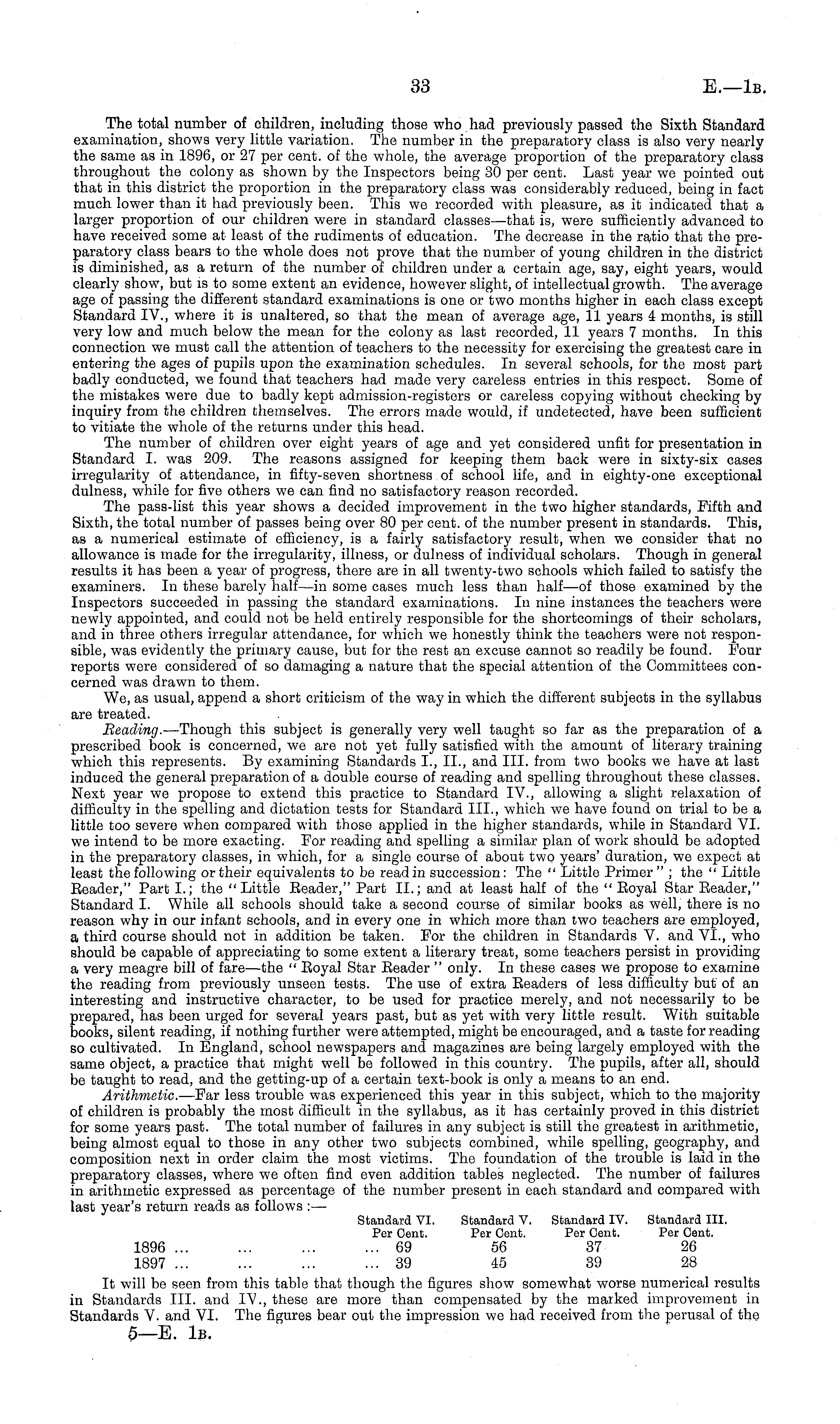 The total number of children, including those who had previously passed the Sixth Standard examination, shows very little variation. The number in the preparatory class is also very nearly the same as in 1896, or 27 per cent, of the whole, the average proportion of the preparatory class throughout the colony as shown by the Inspectors being 30 per cent. Last year we pointed out that in this district the proportion in the preparatory class was considerably reduced, being in fact much lower than it had previously been. This we recorded with pleasure, as it indicated that a larger proportion of our children were in standard classes—that is, were sufficiently advanced to have received some at least of the rudiments of education. The decrease in the ratio that the preparatory class bears to the whole does not prove that the number of young children in the district is diminished, as a return of the number of children under a certain age, say, eight years, would clearly show, but is to some extent an evidence, however slight, of intellectual growth. The average age of passing the different standard examinations is one or two months higher in each class except Standard IV., where it is unaltered, so that the mean of average age, 11 years 4 months, is still very low and much below the mean for the colony as last recorded, 11 years 7 months. In this connection we must call the attention of teachers to the necessity for exercising the greatest care in entering the ages of pupils upon the examination schedules. In several schools, for the most part badly conducted, we found that teachers had made very careless entries in this respect. Some of the mistakes were due to badly kept admission-registers or careless copying without checking by inquiry from the children themselves. The errors made would, if undetected, have been sufficient to vitiate the whole of the returns under this head. The number of children over eight years of age and yet considered unfit for presentation in Standard I. was 209. The reasons assigned for keeping them back were in sixty-six cases irregularity of attendance, in fifty-seven shortness of school life, and in eighty-one exceptional dulness, while for five others we can find no satisfactory reason recorded. The pass-list this year shows a decided improvement in the two higher standards, Fifth and Sixth, the total number of passes being over 80 per cent, of the number present in standards. This, as a numerical estimate of efficiency, is a fairly satisfactory result, when we consider that no allowance is made for the irregularity, illness, or dulness of individual scholars. Though in general results it has been a year of progress, there are in all twenty-two schools which failed to satisfy the examiners. In these barely half—in some cases much less than half—of those examined by the Inspectors succeeded in passing the standard examinations. In nine instances the teachers were newly appointed, and could not be held entirely responsible for the shortcomings of their scholars, and in three others irregular attendance, for which we honestly think the teachers were not responsible, was evidently the primary cause, but for the rest an excuse cannot so readily be found. Pour reports were considered of so damaging a nature that the special attention of the Committees concerned was drawn to them. We, as usual, append a short criticism of the way in which the different subjects in the syllabus are treated. Beading. —Though this subject is generally very well taught so far as the preparation of a prescribed book is concerned, we are not yet fully satisfied with the amount of literary training which this represents. By examining Standards 1., 11., and 111. from two books we have at last induced the general preparation of a double course of reading and spelling throughout these classes. Next year we propose to extend this practice to Standard IV., allowing a slight relaxation of difficulty in the spelling and dictation tests for Standard 111., which we have found on trial to be a little too severe when compared with those applied in the higher standards, while in Standard VI. we intend to be more exacting. For reading and spelling a similar plan of work should be adopted in the preparatory classes, in which, for a single course of about two years' duration, we expect at least the following or their equivalents to be read in succession: The " Little Primer " ; the " Little Eeader," Part I.; the "Little Eeader," Part II.; and at least half of the " Eoyal Star Eeader," Standard I. While all schools should take a second course of similar books as well, there is no reason why in our infant schools, and in every one in which more than two teachers are employed, a third course should not in addition be taken. For the children in Standards V. and VI., who should be capable of appreciating to some extent a literary treat, some teachers persist in providing a very meagre bill of fare—the " Eoyal Star Eeader " only. In these cases we propose to examine the reading from previously unseen tests. The use of extra Eeaders of less difficulty but of an interesting and instructive character, to be used for practice merely, and not necessarily to be prepared, has been urged for several years past, but as yet with very little result. With suitable books, silent reading, if nothing further were attempted, might be encouraged, and a taste for reading so cultivated. In England, school newspapers and magazines are being largely employed with the same object, a practice that might well be followed in this country. The pupils, after all, should be taught to read, and the getting-up of a certain text-book is only a means to an end. Arithmetic. —Far less trouble was experienced this year in this subject, which to the majority of children is probably the most difficult in the syllabus, as it has certainly proved in this district for some years past. The total number of failures in any subject is still the 