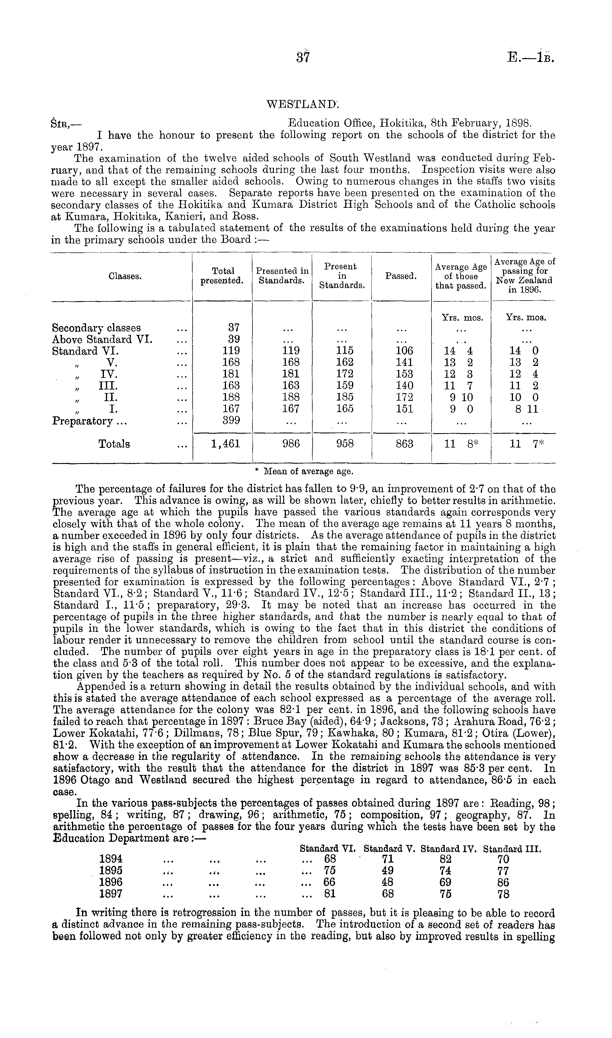 WESTLAND. SIE, — Education Office, Hokitika, Bth February, 1898. I have the honour to present the following report on the schools of the district for the year 1897. The examination of the twelve aided schools of South Westland was conducted during February, and that of the remaining schools during the last four months. Inspection visits were also made to all except the smaller aided schools. Owing to numerous changes in the staffs two visits were necessary in several cases. Separate reports have been presented on the examination of the secondary classes of the Hokitika and Kumara District High Schools and of the Catholic schools at Kumara, Hokitika, Kanieri, and Ross. The following is a tabulated statement of the results of the examinations held during the year in the primary schools under the Board : —