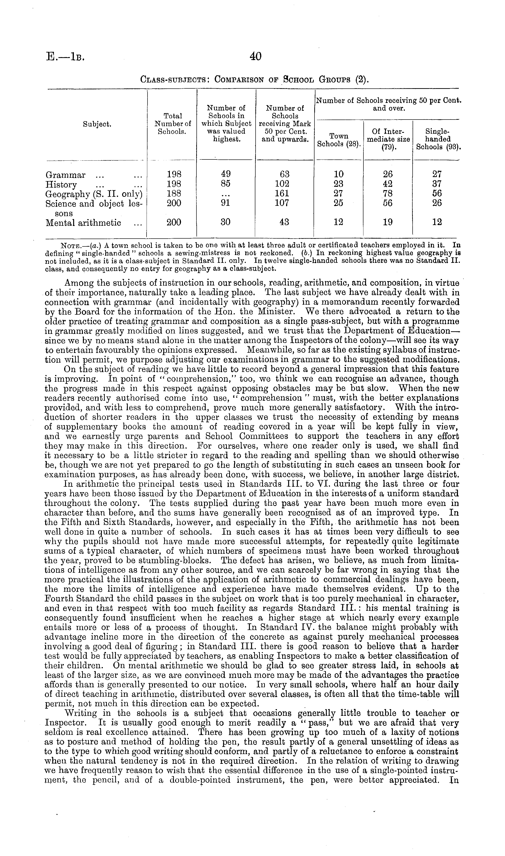 Note.—(a.) A town school is taken to be one with at least three adult or certificated teachers employed in it. In denning " single-handed " schools a sewing-mistress is not reckoned, (b.) In reckoning highest value geography is not included, as it is a class-subject in Standard 11. only. In twelve single-handed schools there was no Standard 11. class, and consequently no entry for geography as a class-subject. Among the subjects of instruction in our schools, reading, arithmetic, and composition, in virtue of their importance, naturally take a leading place. The last subject we have already dealt with in connection with grammar (and incidentally with geography) in a memorandum recently forwarded by the Board for the information of the Hon. the Minister. We there advocated a return to the older practice of treating grammar and composition as a single pass-subject, but with a programme in grammar greatly modified on lines suggested, and we trust that the Department of Education— since we by no means stand alone in the matter among the Inspectors of the colony—will see its way to entertain favourably the opinions expressed. Meanwhile, so far as the existing syllabus of instruction will permit, we purpose adjusting our examinations in grammar to the suggested modifications. On the subject of reading we have little to record beyond a general impression that this feature is improving. In point of "comprehension," too, we think we can recognise an advance, though the progress made in this respect against opposing obstacles may be but slow. When the new readers recently authorised come into use, " comprehension " must, with the better explanations provided, and with less to comprehend, prove much more generally satisfactory. With the introduction of shorter readers in the upper classes we trust the necessity of extending by means of supplementary books the amount of reading covered in a year will be kept fully in view, and we earnestly urge parents and School Committees to support the teachers in any effort they may make in this direction. For ourselves, where one reader only is used, we shall find it necessary to be a little stricter in regard to the reading and spelling than we should otherwise be, though we are not yet prepared to go the length of substituting in such cases an unseen book for examination purposes, as has already been done, with success, we believe, in another large district. In arithmetic the principal tests used in Standards 111. to VI. during the last three or four years have been those issued by the Department of Education in the interests of a uniform standard throughout the colony. The tests supplied during the past year have been much more even in character than before, and the sums have generally been recognised as of an improved type. In the Fifth and Sixth Standards, however, and especially in the Fifth, the arithmetic has not been well done in quite a number of schools. In such cases it has at times been very difficult to see why the pupils should not have made more successful attempts, for repeatedly quite legitimate sums of a typical character, of which numbers of specimens must have been worked throughout the year, proved to be stumbling-blocks. The defect has arisen, we believe, as much from limitations of intelligence as from any other source, and we can scarcely be far wrong in saying that the more practical the illustrations of the application of arithmetic to commercial dealings have been, the more the limits of intelligence and experience have made themselves evident. Up to the Fourth Standard the child passes in the subject on work that is too purely mechanical in character, and even in that respect with too much facility as regards Standard III.: his mental training is consequently found insufficient when he reaches a higher stage at which nearly every example entails more or less of a process of thought. In Standard IV. the balance might probably with advantage incline more in the direction of the concrete as against purely mechanical processes involving a good deal of figuring; in Standard 111. there is good reason to believe that a harder test would be fully appreciated by teachers, as enabling Inspectors to make a better classification of their children. On mental arithmetic we should be glad to see greater stress laid, in schools at least of the larger size, as we are convinced much more may be made of the advantages the practice affords than is generally presented to our notice. In very small schools, where half an hour daily of direct teaching in arithmetic, distributed over several classes, is often all that the time-table will permit, not much in this direction can be expected. Writing in the schools is a subject that occasions generally little trouble to teacher or Inspector. It is usually good enough to merit readily a " pass," but we are afraid that very seldom is real excellence attained. There has been growing up too much of a laxity of notions as to posture and method of holding the pen, the result partly of a general unsettling of ideas as to the type to which good writing should conform, and partly of a reluctance to enforce a constraint when the natural tendency is not in the required direction. In the relation of writing to drawing we have frequently reason to wish that the essential difference in the use of a single-pointed instrument, the pencil, and of a double-pointed instrument, the pen, were better appreciated. In