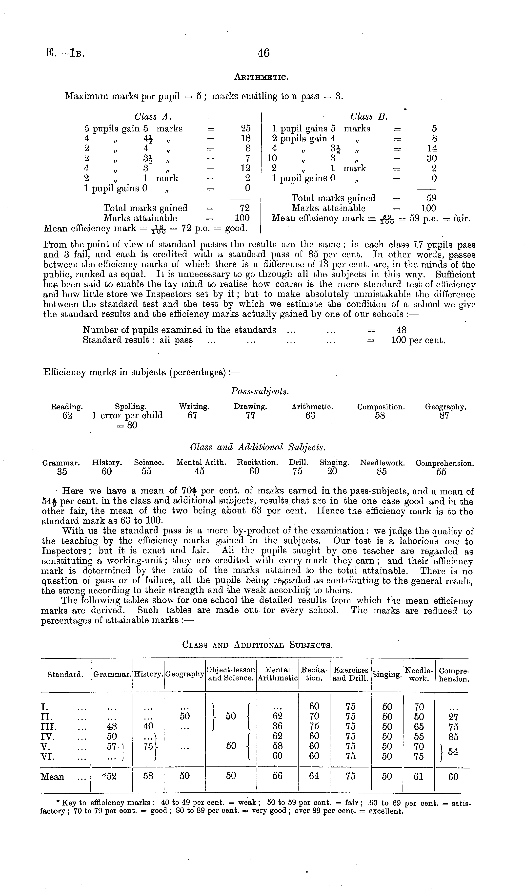 Aeithmetic. Maximum marks per pupil = 5 ; marks entitling to a pass = 3. Glass A. Glass B. 5 pupils gain 5 • marks = 25 1 pupil gains 5 marks = 5 4 „ 4i „ = 18 2 pupils gain 4 „ 8 2 „ 4 = 8 4 „ 3| „ =14 2 „ 3£ „ = 7 10 3 = 30 4 „ 3 = 12 2 „ 1 mark 2 2 „ 1 mark = 2 1 pupil gains 0 „ = 0 1 pupil gains 0 „ =0 Total marks gained = 59 Total marks gained = 72 Marks attainable = 100 Marks attainable = 100 Mean efficiency mark = T =59 p.c. = fair. Mean efficiency mark = = 72 p.c. = good. From the point of view of standard passes the results are the same : in each class 17 pupils pass and 3 fail, and each is credited with a standard pass of 85 per cent. In other words, passes between the efficiency marks of which there is a difference of 13 per cent, are, in the minds of the public, ranked as equal. It is unnecessary to go through all the subjects in this way. Sufficient has been said to enable the lay mind to realise how coarse is the mere standard test of efficiency and how little store we Inspectors set by it; but to make absolutely unmistakable the difference between the standard test and the test by which we estimate the condition of a school we give the standard results and the efficiency marks actually gained by one of our schools : — Number of pupils examined in the standards ... ... = 48 Standard result: all pass ... ... ... ... = 100 per cent. Efficiency marks in subjects (percentages):— Pass-subjects. Reading. Spelling. Writing. Drawing. Arithmetic. Composition. Geography. 62 1 error per child 67 77 63 58 87 = 80 Glass and Additional Subjects. Grammar. History. Science. Mental Arith. Recitation. Drill. Singing. Needlework. Comprehension. 35 60 55 45 60 75 20 85 55 - Here we have a mean of 70f per cent, of marks earned in the pass-subjects, and a mean of 54f- per cent, in the class and additional subjects, results that are in the one case good and in the other fair, the mean of the two being about 63 per cent. Hence the efficiency mark is to the standard mark as 63 to 100. With us the standard pass is a mere by-product of the examination: we judge the quality of the teaching by the efficiency marks gained in the subjects. Our test is a laborious one to Inspectors; but it is exact and fair. All the pupils taught by one teacher are regarded as constituting a working-unit; they are credited with every mark they earn ; and their efficiency mark is determined by the ratio of the marks attained to the total attainable. There is no question of pass or of failure, all the pupils being regarded as contributing to the general result, the strong according to their strength and the weak according to theirs. The following tables show for one school the detailed results from which the mean efficiency marks are derived. Such tables are made out for every school. The marks are reduced to percentages of attainable marks :■ —■