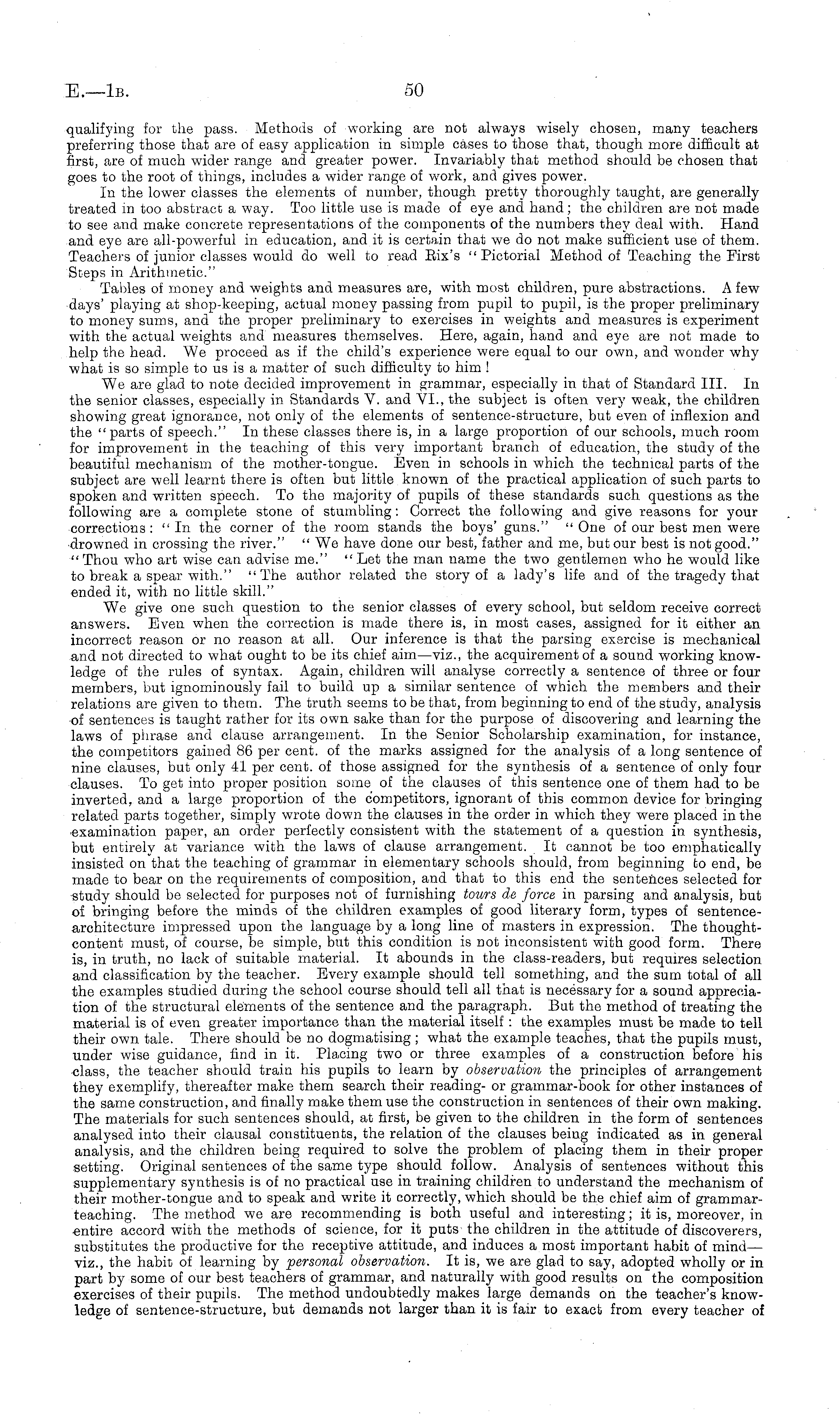 qualifying for the pass. Methods of working are not always wisely chosen, many teachers preferring those that are of easy application in simple cases to those that, though more difficult at first, are of much wider range and greater power. Invariably that method should be chosen that goes to the root of things, includes a wider range of work, and gives power. In the lower classes the elements of number, though pretty thoroughly taught, are generally treated in too abstract a way. Too little use is made of eye and hand; the children are not made to see and make concrete representations of the components of the numbers they deal with. Hand and eye are all-powerful in education, and it is certain that we do not make sufficient use of them. Teachers of junior classes would do well to read Eix's " Pictorial Method of Teaching the First Steps in Arithmetic." Tables of money and weights and measures are, with most children, pure abstractions. A few days' playing at shop-keeping, actual money passing from pupil to pupil, is the proper preliminary to money sums, and the proper preliminary to exercises in weights and measures is experiment with the actual weights and measures themselves. Here, again, hand and eye are not made to help the head. We proceed as if the child's experience were equal to our own, and wonder why what is so simple to us is a matter of such difficulty to him ! We are glad to note decided improvement in grammar, especially in that of Standard 111. In the senior classes, especially in Standards V. and VI., the subject is often very weak, the children showing great ignorance, not only of the elements of sentence-structure, but even of inflexion and the "parts of speech." In these classes there is, in a large proportion of our schools, much room for improvement in the teaching of this very important branch of education, the study of the beautiful mechanism of the mother-tongue. Even in schools in which the technical parts of the subject are well learnt there is often but little known of the practical application of such parts to spoken and written speech. To the majority of pupils of these standards such questions as the following are a complete stone of stumbling: Correct the following and give reasons for your corrections: "In the corner of the room stands the boys' guns." "One of our best men were drowned in crossing the river." "We have done our best, father and me, but our best is not good." "Thou who art wise can advise me." "Let the man name the two gentlemen who he would like to break a spear with." "The author related the story of a lady's life and of the tragedy that ended it, with no little skill." We give one such question to the senior classes of every school, but seldom receive correct answers. Even when the correction is made there is, in most cases, assigned for it either an incorrect reason or no reason at all. Our inference is that the parsing exercise is mechanical and not directed to what ought to be its chief aim—viz., the acquirement of a sound working knowledge of the rules of syntax. Again, children will analyse correctly a sentence of three or four members, but ignominously fail to build up a similar sentence of which the members and their relations are given to them. The truth seems to be that, from beginning to end of the study, analysis •of sentences is taught rather for its own sake than for the purpose of discovering and learning the laws of phrase and clause arrangement. In the Senior Scholarship examination, for instance, the competitors gained 86 per cent, of the marks assigned for the analysis of a long sentence of nine clauses, but only 41 per cent, of those assigned for the synthesis of a sentence of only four clauses. To get into proper position some of the clauses of this sentence one of them had to be inverted, and a large proportion of the competitors, ignorant of this common device for bringing related parts together, simply wrote down the clauses in the order in which they were placed in the examination paper, an order perfectly consistent with the statement of a question in synthesis, but entirely at variance with the laws of clause arrangement. It cannot be too emphatically insisted on that the teaching of grammar in elementary schools should, from beginning to end, be made to bear on the requirements of composition, and that to this end the sentences selected for study should be selected for purposes not of furnishing tours de force in parsing and analysis, but of bringing before the minds of the children examples of good literary form, types of sentencearchitecture impressed upon the language by a long line of masters in expression. The thoughtcontent must, of course, be simple, but this condition is not inconsistent with good form. There is, in truth, no lack of suitable material. It abounds in the class-readers, but requires selection and classification by the teacher. Every example should tell something, and the sum total of all the examples studied during the school course should tell all that is necessary for a sound appreciation of the structural elements of the sentence and the paragraph. But the method of treating the material is of even greater importance than the material itself : the examples must be made to tell their own tale. There should be no dogmatising ; what the example teaches, that the pupils must, under wise guidance, find in it. Placing two or three examples of a construction before his class, the teacher should train his pupils to learn by observation the principles of arrangement they exemplify, thereafter make them search their reading- or grammar-book for other instances of the same construction, and finally make them use the construction in sentences of their own making. The materials for such sentences should, at first, be given to the children in the form of sentences analysed into their clausal constituents, the relation of the clauses being indicated as in general analysis, and the children being r