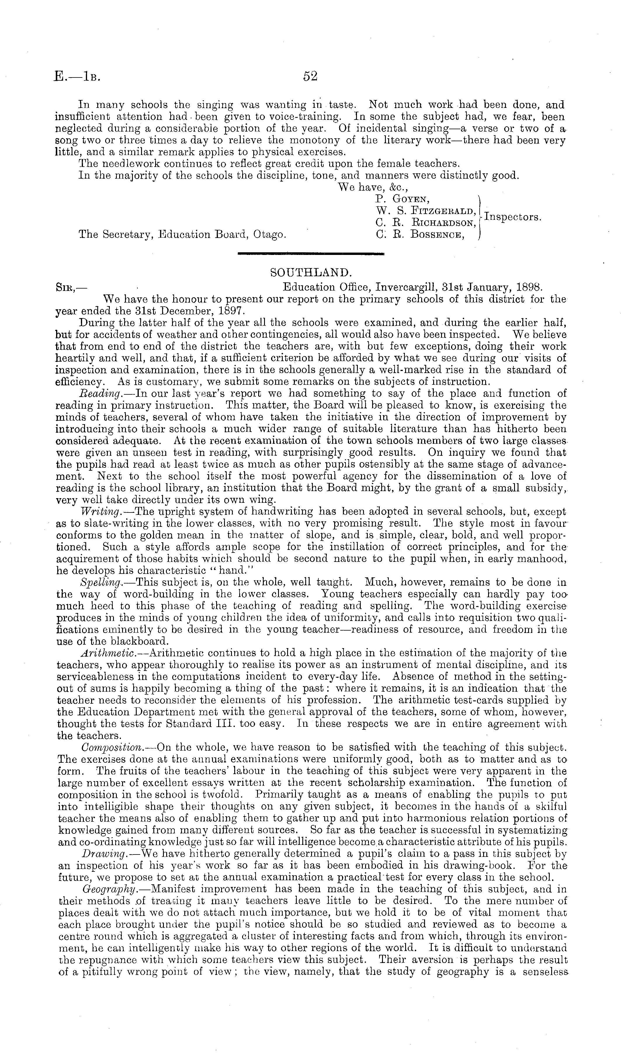 SOUTHLAND. Sik, — Education Office, Invercargill, 31st January, 1898. We have the honour to present our report on the primary schools of this district for the year ended the 31st December, 1897. During the latter half of the year all the schools were examined, and during the earlier half, but for accidents of weather and other contingencies, all would also have been inspected. We believe that from end to end of the district the teachers are, with but few exceptions, doing their work heartily and well, and that, if a sufficient criterion be afforded by what we see during our visits of inspection and examination, there is in the schools generally a well-marked rise in the standard of efficiency. As is customary, we submit some remarks on the subjects of instruction. Beading. —ln our last year's report we had something to say of the place and function of reading in primary instruction. This matter, the Board will be pleased to know, is exercising the minds of teachers, several of whom have taken the initiative in the direction of improvement by introducing into their schools a much wider range of suitable literature than has hitherto been considered adequate. At the recent examination of the town schools members of two large classes were given an unseen test in reading, with surprisingly good results. On inquiry we found that the pupils had read at least twice as much as other pupils ostensibly at the same stage of advancement. Next to the school itself the most powerful agency for the dissemination of a love of reading is the school library, an institution that the Board might, by the grant of a small subsidy, very well take directly under its own wing. Writing. —The upright system of handwriting has been adopted in several schools, but, except as to slate-writing in the lower classes, with no very promising result. The style most in favour conforms to the golden mean in the matter of slope, and is simple, clear, bold, and well proportioned. Such a style affords ample scope for the instillation of correct principles, and for theacquirement of those habits which should be second nature to the pupil when, in early manhood, he develops his characteristic "hand." Spelling. —This subject is, on the whole, well taught. Much, however, remains to be done in the way of word-building in the lower classes. Young teachers especially can hardly pay toomuch heed to this phase of the teaching of reading and spelling. The word-building exercise produces in the minds of young children the idea of uniformity, and calls into requisition two qualifications eminently to be desired in the young teacher—readiness of resource, and freedom in the use of the blackboard. Arithmetic. —Arithmetic continues to hold a high place in the estimation of the majority of the teachers, who appear thoroughly to realise its power as an instrument of mental discipline, and its serviceableness in the computations incident to every-day life. Absence of method in the settingout of sums is happily becoming a thing of the past: where it remains, it is an indication that the teacher needs to reconsider the elements of his profession. The arithmetic test-cards supplied by the Education Department met with the general approval of the teachers, some of whom, however,, thought the tests for Standard 111. too easy. In these respects we are in entire agreement with the teachers. Composition. —On the whole, we have reason to be satisfied with the teaching of this subject. The exercises done at the annual examinations were uniformly good, both as to matter and as to form. The fruits of the teachers' labour in the teaching of this subject were very apparent in the large number of excellent essays written at the recent scholarship examination. The function of composition in the school is twofold. Primarily taught as a means of enabling the pupils to put into intelligible shape their thoughts on any given subject, it becomes in the hands of a skilful teacher the means also of enabling them to gather up and put into harmonious relation portious of knowledge gained from many different sources. So far as the teacher is successful in systematizing and co-ordinating knowledge just so far will intelligence become a characteristic attribute of his pupils. Drawing. —We have hitherto generally determined a pupil's claim to a pass in this subject by an inspection of his year's work so far as it has been embodied in his drawing-book. For the future, we propose to set at the annual examination a practical test for every class in the school. Geography. —Manifest improvement has been made in the teaching of this subject, and in their methods of treating it many teachers leave little to be desired. To the mere number of places dealt with we do not attach much importance, but we hold it to be of vital moment that each place brought under the pupil's notice should be so studied and reviewed as to become a centre round which is aggregated a cluster of interesting facts and from which, through its environment, he can intelligently make his way to other regions of the world. It is difficult to understand the repugnance with which some teachers view this subject. Their aversion is perhaps the result of a pitifully wrong point of view ; the view, namely, that the study of geography is a senseless-