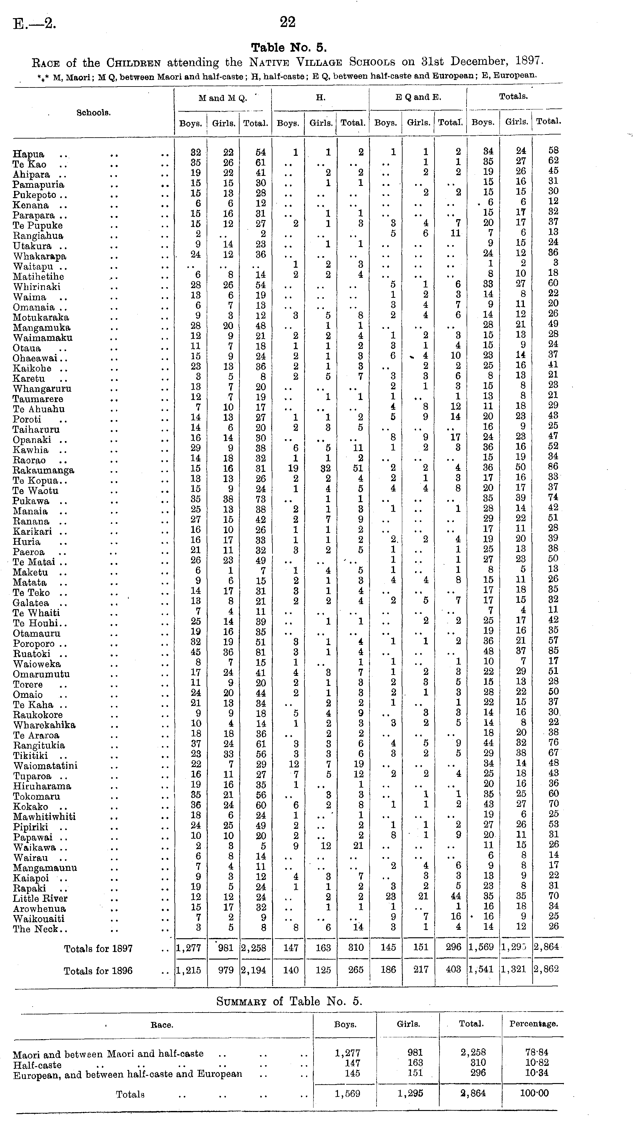 Table No. 5. Race of the Children attending the Native Village Schools on 31st December, 1897. M, Maori; M Q, between Maori and half-caste; H, half-caste; E Q, between half-caste and European; E, European.