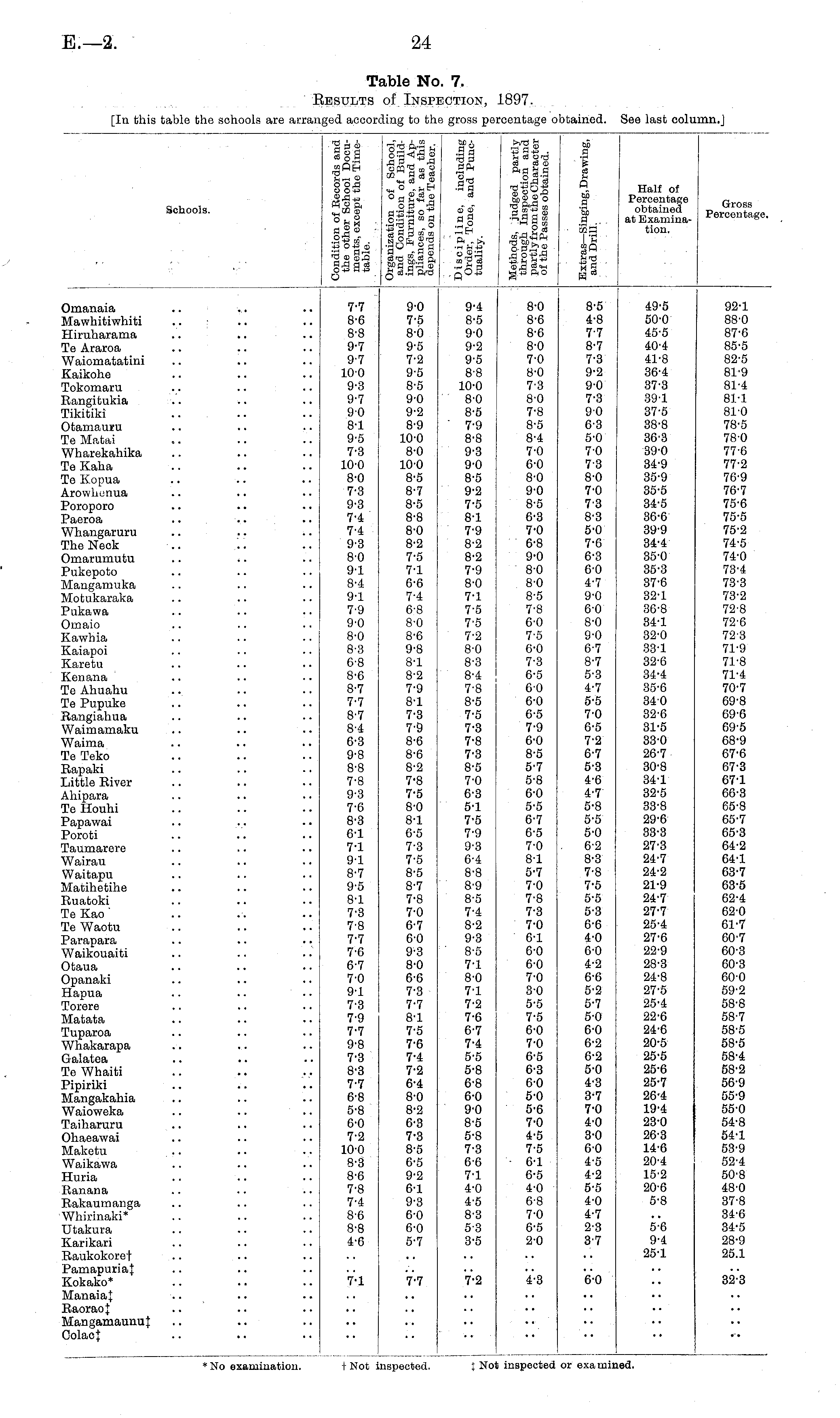 Table No. 7. Results of Inspection, 1897. [In this table the schools are arranged according to the gross percentage obtained. See last column.]