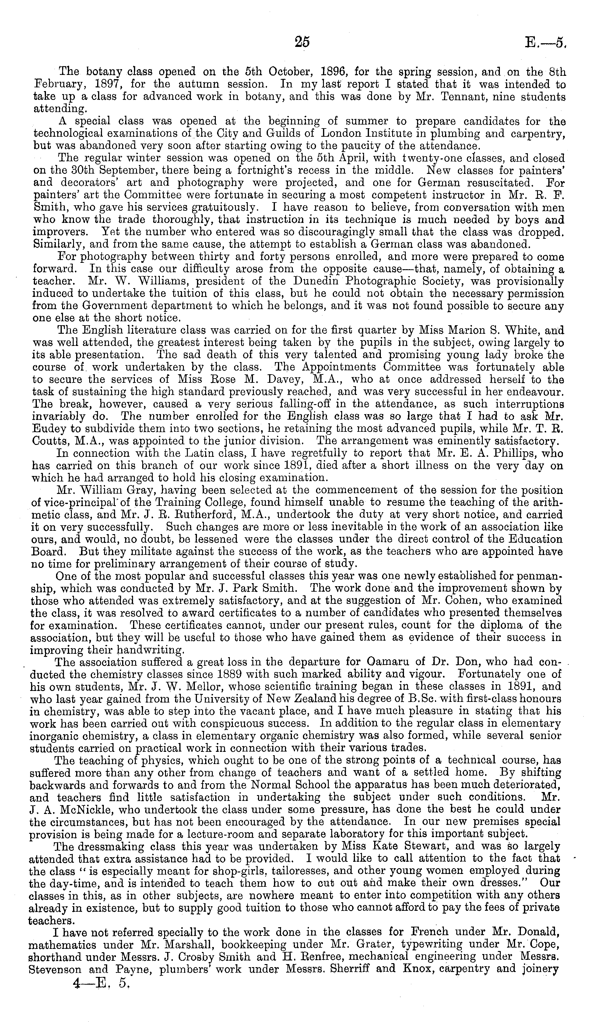 The botany class opened on the sth October, 1896, for the spring session, and on the Bth February, 1897, for the autumn session. In my last report I stated that it was intended to take up a class for advanced work in botany, and this was done by Mr. Tennant, nine students attending. A special class was opened at the beginning of summer to prepare candidates for the technological examinations of the City and Guilds of London Institute in plumbing and carpentry, but was abandoned very soon after starting owing to the paucity of the attendance. The regular winter session was opened on the sth April, with twenty-one classes, and closed on the 30th September, there being a fortnight's recess in the middle. New classes for painters' and decorators' art and photography were projected, and one for German resuscitated. For painters' art the Committee were fortunate in securing a most competent instructor in Mr. R. F. Smith, who gave his services gratuitously. I have reason to believe, from conversation with men who know the trade thoroughly, that instruction in its technique is much needed by boys and improvers. Yet the number who entered was so discouragingly small that the class was dropped. Similarly, and from the same cause, the attempt to establish a German class was abandoned. For photography between thirty and forty persons enrolled, and more were prepared to come forward. In this case our difficulty arose from the opposite cause—that, namely, of obtaining a teacher. Mr. W. Williams, president of the Dunedin Photographic Society, was provisionally induced to undertake the tuition of this class, but he could not obtain the necessary permission from the Government department to which he belongs, and it was not found possible to secure any one else at the short notice. The English literature class was carried on for the first quarter by Miss Marion S. White, and was well attended, the greatest interest being taken by the pupils in the subject, owing largely to its able presentation. The sad death of this very talented and promising young lady broke the course of work undertaken by the class. The Appointments Committee was fortunately able to secure the services of Miss Rose M. Davey, M.A., who at once addressed herself to the task of sustaining the high standard previously reached, and was very successful in her endeavour. The break, however, caused a very serious falling-off in the attendance, as such interruptions invariably do. The number enrolled for the English class was so large that I had to ask Mr. Eudey to subdivide them into two sections, he retaining the most advanced pupils, while Mr. T. E. Coutts, M.A., was appointed to the junior division. The arrangement was eminently satisfactory. In connection with the Latin class, I have regretfully to report that Mr. E. A. Phillips, who has carried on this branch of our work since 1891, died after a short illness on the very day on which he had arranged to hold his closing examination. Mr. William Gray, having been selected at the commencement of the session for the position of vice-principal of the Training College, found himself unable to resume the teaching of the arithmetic class, and Mr. J. E. Rutherford, M.A., undertook the duty at very short notice, and carried it on very successfully. Such changes are more or less inevitable in the work of an association like ours, and would, no doubt, be lessened were the classes under the direct control of the Education Board. But they militate against the success of the work, as the teachers who are appointed have no time for preliminary arrangement of their course of study. One of the most popular and successful classes this year was one newly established for penmanship, which was conducted by Mr. J. Park Smith. The work done and the improvement shown by those who attended was extremely satisfactory, and at the suggestion of Mr. Cohen, who examined the class, it was resolved to award certificates to a number of candidates who presented themselves for examination. These certificates cannot, under our present rules, count for the diploma of the association, but they will be useful to those who have gained them as evidence of their success in improving their handwriting. The association suffered a great loss in the departure for Oamaru of Dr. Don, who had conducted the chemistry classes since 1889 with such marked ability and vigour. Fortunately one of his own students, Mr. J. W. Mellor, whose scientific training began in these classes in 1891, and who last year gained from the University of New Zealand his degree of B.Sc. with first-class honours in chemistry, was able to step into the vacant place, and I have much pleasure in stating that his work has been carried out with conspicuous success. In addition to the regular class in elementary inorganic chemistry, a class in elementary organic chemistry was also formed, while several senior students carried on practical work in connection with their various trades. The teaching of physics, which ought to be one of the strong points of a technical course, has suffered more than any other from change of teachers and want of a settled home. By shifting backwards and forwards to and from the Normal School the apparatus has been much deteriorated, and teachers find little satisfaction in undertaking the subject under such conditions. Mr. J. A. McNickle, who undertook the class under some pressure, has done the best he could under the circumstances, but has not been encouraged by the attendance. In our new premises special provision is being made for a lecture-room and separate laboratory for this important subject. The dressmaking class this year was undertaken by Miss Kate Stewart, and was so largely attended that extra assistance had to be provided. I would like to call attention to the fact that the class " is especially meant for shop-girls, tailoresses, and other young women employed during the day-time, and is intended to teach them how to cut out