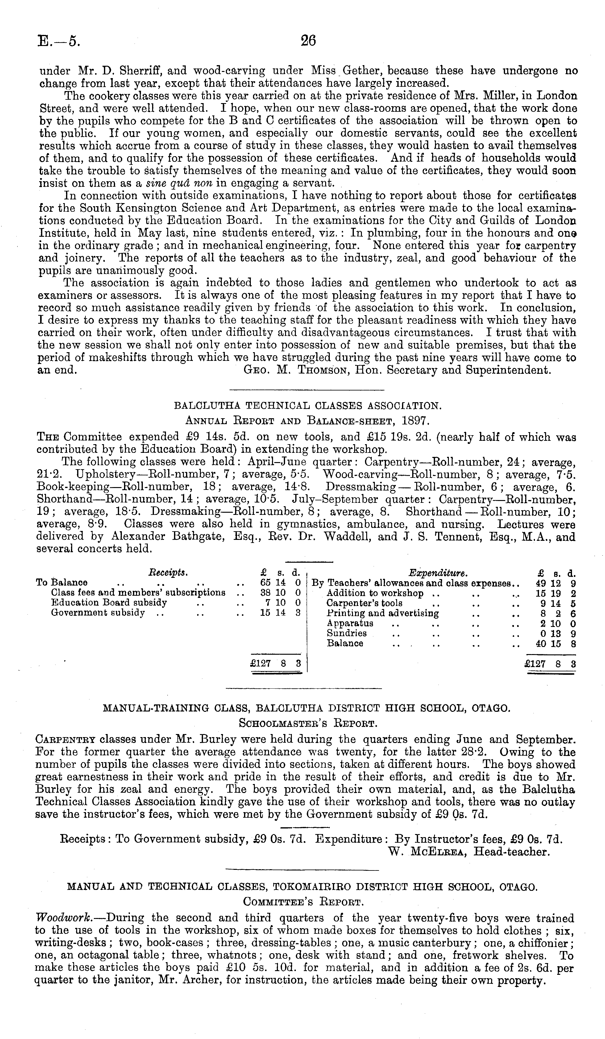 under Mr. D. Sherriff, and wood-carving under Miss Gether, because these have undergone no change from last year, except that their attendances have largely increased. The cookery classes were this year carried on at the private residence of Mrs. Miller, in London Street, and were well attended. I hope, when our new class-rooms are opened, that the work done by the pupils who compete for the B and C certificates of the association will be thrown open to the public. If our young women, and especially our domestic servants, could see the excellent results which accrue from a course of study in these classes, they would hasten to avail themselves of them, and to qualify for the possession of these certificates. And if heads of households would take the trouble to satisfy themselves of the meaning and value of the certificates, they would soon insist on them as a sine qua non in engaging a servant. In connection with outside examinations, I have nothing to report about those for certificates for the South Kensington Science and Art Department, as entries were made to the local examinations conducted by the Education Board. In the examinations for the City and Guilds of London Institute, held in May last, nine students entered, viz. : In plumbing, four in the honours and one in the ordinary grade ; and in mechanical engineering, four. None entered this year for carpentry and joinery. The reports of all the teachers as to the industry, zeal, and good behaviour of the pupils are unanimously good. The association is again indebted to those ladies and gentlemen who undertook to act as examiners or assessors. It is always one of the most pleasing features in my report that I have to record so much assistance readily given by friends of the association to this work. In conclusion, I desire to express my thanks to the teaching staff for the pleasant readiness with which they have carried on their work, often under difficulty and disadvantageous circumstances. I trust that with the new session we shall not only enter into possession of new and suitable premises, but that the period of makeshifts through which we have struggled during the past nine years will have come to an end. Geo. M. Thomson, Hon. Secretary and Superintendent.