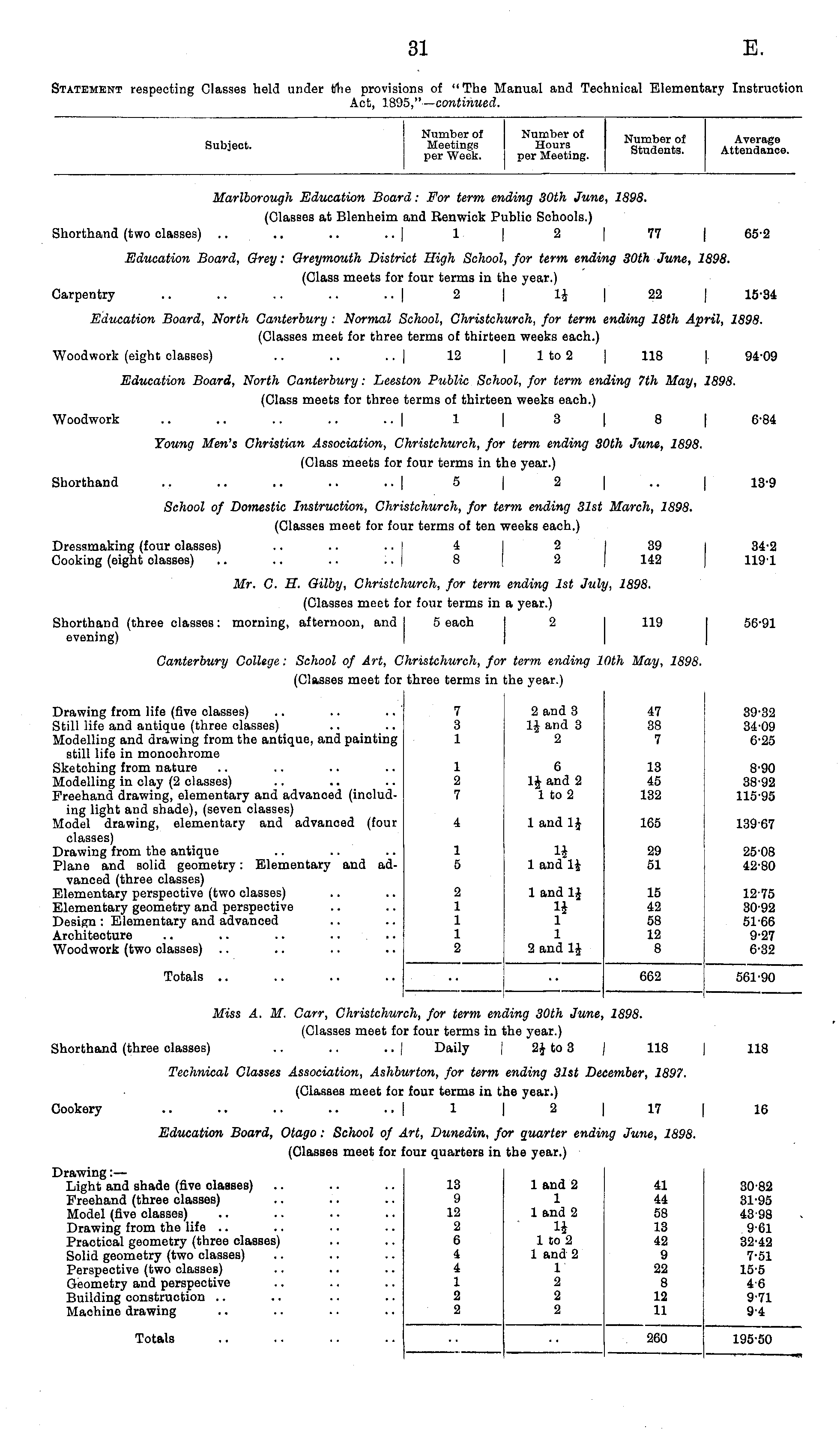 Subject. Number of Meetings per Week. Number ol Hours per Meeting. Number of Students. Average Attendance. Marlboroiigh Education Board: For term ending 30th June, 1898. (Classes at Blenheim and Renwick Public Schools.) Shorthand (two classes) .... .. .. | 1 | 2 | 77 | 65-2 Education Board, Grey: Qreymouth District High School, for term ending 30th June, 1898. (Class meets for four terms in the year.) Carpentry .. .. .. .. .. | 2 | 1J | 22 | 15-34 Education Board, North Canterbury: Normal School, Christchurch, for term ending 18th April, 1898. (Classes meet for three terms of thirteen weeks each.) Woodwork (eight classes) .. .. .. | 12 | 1 to 2 | 118 |. 94-09 Education Board, North Canterbury: Leeston Public School, for term ending 7th May, 1898. (Class meets for three terms of thirteen weeks each.) Woodwork .. .. .. .. ..| 1 | 3 | 8 | 6-84 Young Men's Christian Association, Christchurch, for term ending 30th June, 1898. (Class meets for four terms in the year.) Shorthand .. .. .. .. .. | 5 | 2 | .. | 13-9 School of Domestic Instruction, Christchurch, for term ending 31st March, 1898. (Classes meet for four terms of ten weeks each.) Dressmaking (four classes) ...... 4 2 39 I 34-2 Cooking (eight olasses) .. .. .. .. 8 2 142 119-1 Mr. C. H. Gilby, Christchurch, for term ending 1st July, 1898. (Classes meet for four terms in a year.) Shorthand (three classes: morning, afternoon, and I 5 each 2 119 56-91 evening) Canterbury College: School of Art, Christchurch, for term ending 10th May, 1898. (Classes meet for three terms in the year.) Drawing from life (five classes) .. .. .. 7 2 and 3 47 39-32 Still life and antique (three classes) .. .. 3 1J and 3 38 34-09 Modelling and drawing from the antique, and painting 12 7 6-25 still life in monochrome Sketching from nature .. .. .. .. 1 6 13 8-90 Modelling in clay (2 classes) .. .. .. 2 1 J and 2 45 38-92 Freehand drawing, elementary and advanced (includ- 7 1 to 2 132 115'95 ing light and shade), (seven classes) Model drawing, elementary and advanced (four 4 1 and 1J 165 13967 classes) Drawing from the antique .. .. .. 1 1J 29 25-08 Plane and solid geometry: Elementary and ad- 5 1 and 1£ 51 42-80 vanced (three classes) Elementary perspective (two classes) .. .. 2 1 and 1J 15 12-75 Elementary geometry and perspective .... 1 1J 42 30-92 Design: Elementary and advanced .... 1 1 58 51-66 Architecture .. .. .. .... 1 1 12 927 Woodwork (two classes) .. .. .. .. 2 2 and 1J 8 6-32 Totals .. .. .. .. .. .. 662 561-90 662 561-90 i Miss A. M. Carr, Christchurch, for term ending 30th June, 1898. (Classes meet for four terms in the year.) ■ch, for term ending 30th June, 1898. >r four terms in the year.) I Daily | 2£ to 3 | 118 118 Shorthand (three classes) .. .. .. | Daily | 2£ to 3 | 118 | 118 Technical Classes Association, Ashburton, for term ending 31st December, 1897. (Classes meet for four terms in the year.) urton, for term ending 31st December, 1897. : lour terms in the year.) I 1 I 2 I 17 I 16 Cookery .. .. .. .. .. | 1 | 2 | 17 | 16 Education Board, Otago: School of Art, Dunedin, for quarter ending June, 1898. (Classes meet for four quarters in the year.) Art, Dunedin, for quarter ending June, 1898. four quarters in the year.) Drawing:— Light and shade (five olaeses) .. .. .. 13 1 and 2 41 3082 Freehand (three classes) ...... 9 1 44 31-95 Model (five classes) .. .. .. .. 12 1 and 2 58 4398 Drawing from the life .. .. .. .. 2 1J 13 9-61 Practical geometry (three olasBes) .. .. 6 1 to 2 42 32-42 Solid geometry (two classes) .. .. .. 4 1 and 2 9 7-51 Perspective (two classes) ...... 4 1 22 15-5 Geometry and perspective ...... 1 2 8 4-6 Building construction .. .. .. .. 2 2 12 9-71 Machine drawing ........ 2 2 11 9-4 13 1 and 2 41 9 1 44 12 1 and 2 58 2 1J 13 6 1 to 2 42 4 1 and 2 9 4 1 22 12 8 2 2 12 2 2 11 30-82 31-95 4398 9-61 32-42 7-51 15-5 4-6 9-71 9-4 Totals .. .. .. .. .. .. 260 19550 260 195-50