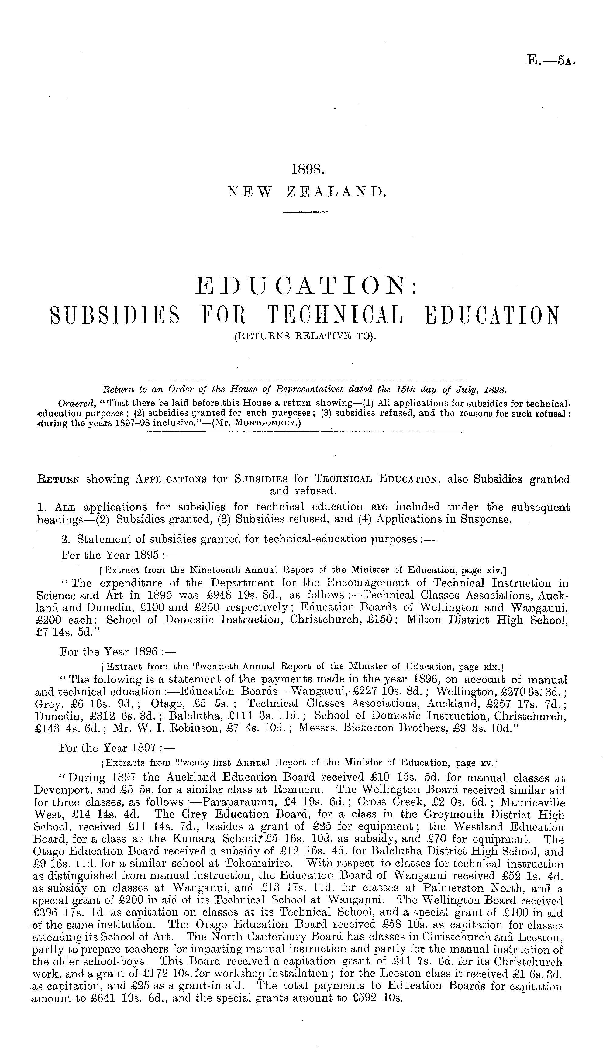 Return to an Order of the House of Representatives dated the 15th day of July, 1898. Ordered, " That there be laid before this House a return showing—(l) All applications for subsidies for technicaleducation purposes; (2) subsidies granted for such purposes; (3) subsidies refused, and the reasons for such refusal: during the years 1897-98 inclusive."—(Mr. Montgomery.)