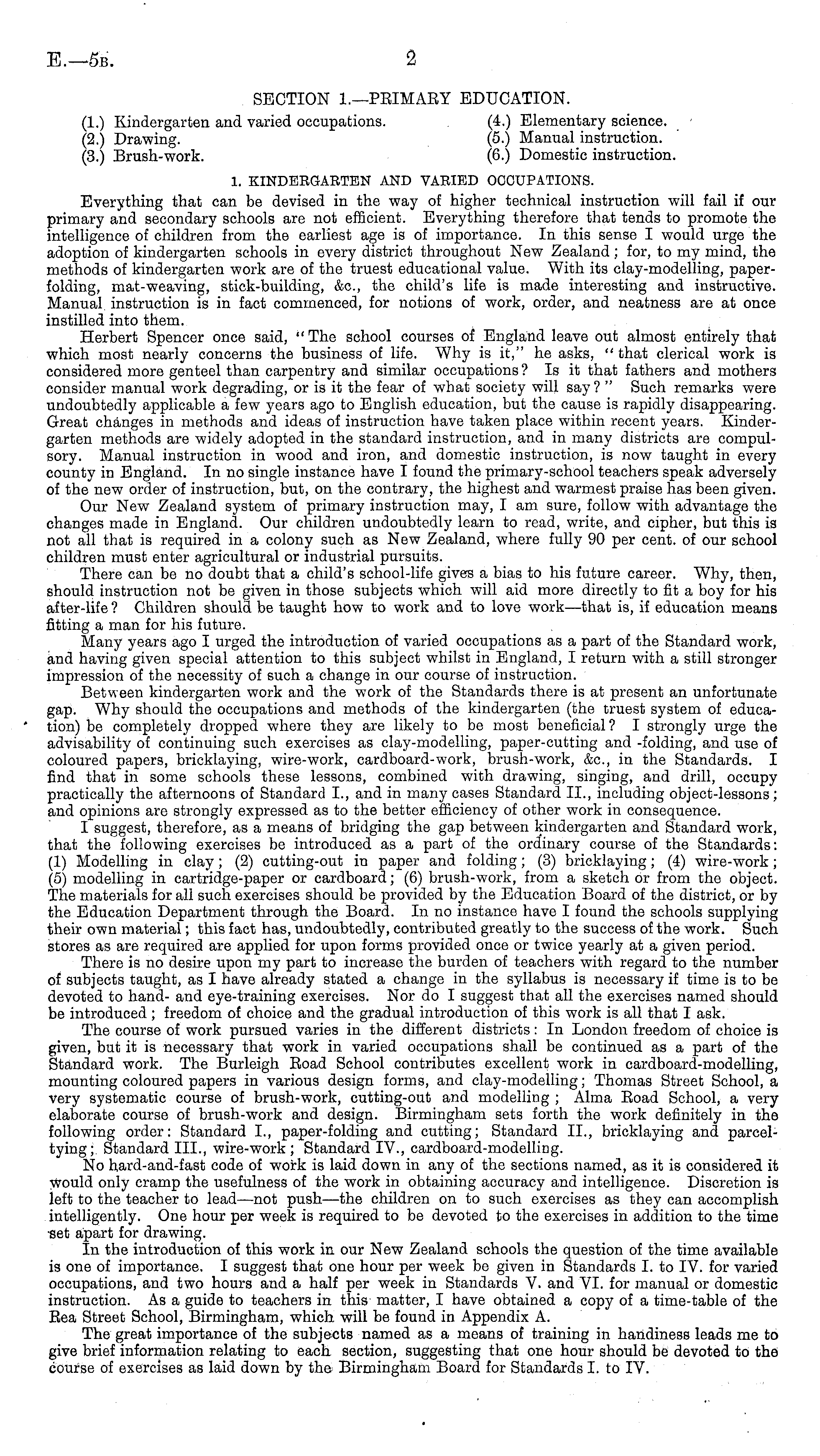 SECTION I.—PEIMAEY EDUCATION. (1.) Kindergarten and varied occupations. (4.) Elementary science. (2.) Drawing. (5.) Manual instruction. (3.) Brush-work. (6.) Domestic instruction. 1. KINDERGARTEN AND VARIED OCCUPATIONS. Everything that can be devised in the way of higher technical instruction will fail if our primary and secondary schools are not efficient. Everything therefore that tends to promote the intelligence of children from the earliest age is of importance. In this sense I would urge the adoption of kindergarten schools in every district throughout New Zealand ; for, to my mind, the methods of kindergarten work are of the truest educational value. With its clay-modelling, paperfolding, mat-weaving, stick-building, &c, the child's life is made interesting and instructive. Manual instruction is in fact commenced, for notions of work, order, and neatness are at once instilled into them. Herbert Spencer once said, "The school courses of England leave out almost entirely that which most nearly concerns the business of life. Why is it," he asks, " that clerical work is considered more genteel than carpentry and similar occupations? Is it that fathers and mothers consider manual work degrading, or is it the fear of what society will say? " Such remarks were undoubtedly applicable a few years ago to English education, but the cause is rapidly disappearing. Great changes in methods and ideas of instruction have taken place within recent years. Kindergarten methods are widely adopted in the standard instruction, and in many districts are compulsory. Manual instruction in wood and iron, and domestic instruction, is now taught in every county in England. In no single instance have I found the primary-school teachers speak adversely of the new order of instruction, but, on the contrary, the highest and warmest praise has been given. Our New Zealand system of primary instruction may, I am sure, follow with advantage the changes made in England. Our children undoubtedly learn to read, write, and cipher, but this is not all that is required in a colony such as New Zealand, where fully 90 per cent, of our school children must enter agricultural or industrial pursuits. There can be no doubt that a child's school-life gives a bias to his future career. Why, then, should instruction not be given in those subjects which will aid more directly to fit a boy for his after-life ? Children should be taught how to work and to love work—that is, if education means fitting a man for his future. Many years ago I urged the introduction of varied occupations as a part of the Standard work, and having given special attention to this subject whilst in England, I return with a still stronger impression of the necessity of such a change in our course of instruction. Between kindergarten work and the work of the Standards there is at present an unfortunate gap. Why should the occupations and methods of the kindergarten (the truest system of education) be completely dropped where they are likely to be most beneficial? I strongly urge the advisability of continuing such exercises as clay-modelling, paper-cutting and -folding, and use of coloured papers, bricklaying, wire-work, cardboard-work, brush-work, &c, in the Standards. I find that in some schools these lessons, combined with drawing, singing, and drill, occupy practically the afternoons of Standard 1., and in many cases Standard 11., including object-lessons; and opinions are strongly expressed as to the better efficiency of other work in consequence. I suggest, therefore, as a means of bridging the gap between kindergarten and Standard work, that the following exercises be introduced as a part of the ordinary course of the Standards: (1) Modelling in clay ; (2) cutting-out in paper and folding ; (3) bricklaying; (4) wire-work ; (5) modelling in cartridge-paper or cardboard; (6) brush-work, from a sketch or from the object. The materials for all such exercises should be provided by the Education Board of the district, or by the Education Department through the Board. In no instance have I found the schools supplying their own material; this fact has, undoubtedly, contributed greatly to the success of the work. Such stores as are required are applied for upon forms provided once or twice yearly at a given period. There is no desire upon my part to increase the burden of teachers with regard to the number of subjects taught, as I have already stated a change in the syllabus is necessary if time is to be devoted to hand- and eye-training exercises. Nor do I suggest that all the exercises named should be introduced ; freedom of choice and the gradual introduction of this work is all that I ask. The course of work pursued varies in the different districts: In London freedom of choice is given, but it is necessary that work in varied occupations shall be continued as a part of the Standard work. The Burleigh Eoad School contributes excellent work in cardboard-modelling, mounting coloured papers in various design forms, and clay-modelling; Thomas Street School, a very systematic course of brush-work, cutting-out and modelling ; Alma Eoad School, a very elaborate course of brush-work and design. Birmingham sets forth the work definitely in the following order: Standard 1., paper-folding and cutting; Standard 11., bricklaying and parceltying; Standard 111., wire-work ; Standard IV., cardboard-modelling. No hard-and-fast code of work is laid down in any of the sections named, as it is considered it would only cramp the usefulness of the work in obtaining accuracy and intelligence. Discretion is left to the teacher to lead—not push—the children on to such exercises as they can accomplish intelligently. One hour per week is required to be devoted to the exercises in addition to the time set apart for drawing. In the introduction of this work in our New Zealand schools the question of the time available is one of importance. I suggest that one hour per week be giv