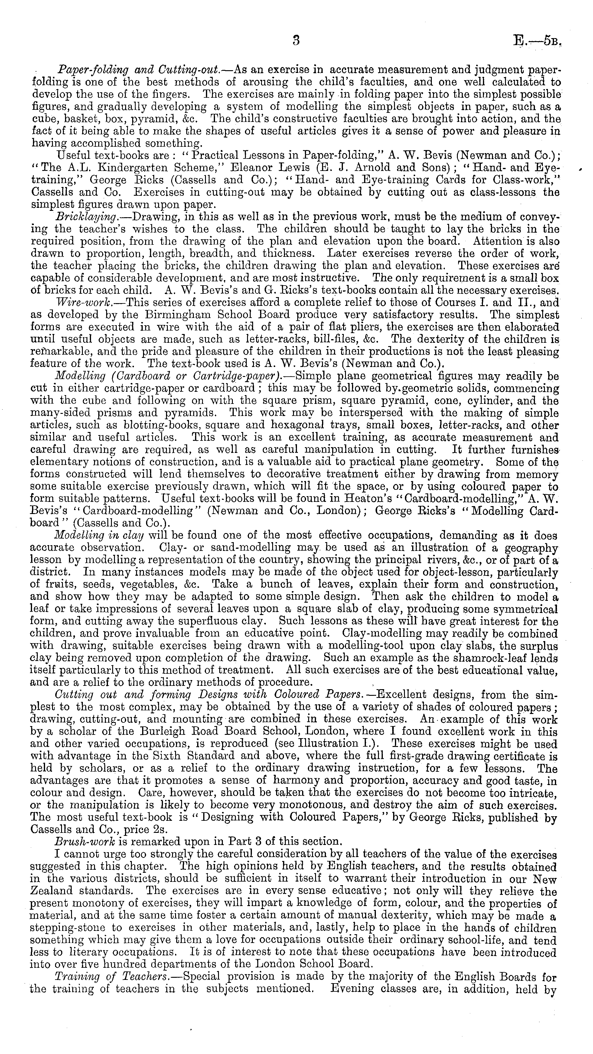 Paper-folding and Cutting-out. —As an exercise in accurate measurement and judgment paperfolding is one of the best methods of arousing the child's faculties, and one well calculated to develop the use of the fingers. The exercises are mainly in folding paper into the simplest possible figures, and gradually developing a system of modelling the simplest objects in paper, such as a cube, basket, box, pyramid, &c. The child's constructive faculties are brought into action, and the fact of it being able to make the shapes of useful articles gives it a sense of power and pleasure in having accomplished something. Useful text-books are : " Practical Lessons in Paper-folding," A. W. Bevis (Newman and Co.); "The A.L. Kindergarten Scheme," Eleanor Lewis (E. J. Arnold and Sons); "Hand- and Eyetraining," George Bicks (Cassells and Co.); "Hand- and Eye-training Cards for Class-work," Cassells and Co. Exercises in cutting-out may be obtained by cutting out as class-lessons the simplest figures drawn upon paper. Bricklaying. —Drawing, in this as well as in the previous work, must be the medium of conveying the teacher's wishes to the class. The children should be taught to lay the bricks in the required position, from the drawing of the plan and elevation upon the board. Attention is also drawn to proportion, length, breadth, and thickness. Later exercises reverse the order of work, the teacher placing the bricks, the children drawing the plan and elevation. These exercises are capable of considerable development, and are most instructive. The only requirement is a small box of bricks for each child. A. W. Bevis's and G. Eicks's text-books contain all the necessary exercises. Wire-ivork. —This series of exercises afford a complete relief to those of Courses I. and 11., and as developed by the Birmingham School Board produce very satisfactory results. The simplest forms are executed in wire with the aid of a pair of flat pliers, the exercises are then elaborated until useful objects are made, such as letter-racks, bill-files, &c. The dexterity of the children is remarkable, and the pride and pleasure of the children in their productions is not the least pleasing feature of the work. The text-book used is A. W. Bevis's (Newman and Co.). Modelling (Cardboard or Cartridge-paper). —Simple plane geometrical figures may readily be cut in either cartridge-paper or cardboard ; this may be followed by. geometric solids, commencing with the cube and following on with the square prism, square pyramid, cone, cylinder, and the many-sided prisms and pyramids. This work may be interspersed with the making of simple articles, such as blotting-books, square and hexagonal trays, small boxes, letter-racks, and other similar and useful articles. This work is an excellent training, as accurate measurement and careful drawing are required, as well as careful manipulation in cutting. It further furnishes elementary notions of construction, and is a valuable aid to practical plane geometry. Some of the forms constructed will lend themselves to decorative treatment either by drawing from memory some suitable exercise previously drawn, which will fit the space, or by using coloured paper to form suitable patterns. Useful text-books will be found in Heaton's "Cardboard-modelling," A. W. Bevis's "Cardboard-modelling" (Newman and Co., London); George Eicks's "Modelling Cardboard" (Cassells and Co.). Modelling in clay will be found one of the most effective occupations, demanding as it does accurate observation. Clay- or sand-modelling may, be used as an illustration of a geography lesson by modelling a representation of the country, showing the principal rivers, &c, or of part of a district. In many instances models may be made of the object used for object-lesson, particularly of fruits, seeds, vegetables, &c. Take a bunch of leaves, explain their form and construction, and show how they may be adapted to some simple design. Then ask the children to model a leaf or take impressions of several leaves upon a square slab of clay, producing some symmetrical form, and cutting away the superfluous clay. Such lessons as these will have great interest for the children, and prove invaluable from an educative point. Clay-modelling may readily be combined with drawing, suitable exercises being drawn with a modelling-tool upon clay slabs, the surplus clay being removed upon completion of the drawing. Such an example as the shamrock-leaf lends itself particularly to this method of treatment. All such exercises are of the best educational value, and are a relief to the ordinary methods of procedure. Cutting out and forming Designs with Coloured Papers. —Excellent designs, from the simplest to the most complex, may be obtained by the use of a variety of shades of coloured papers ; drawing, cutting-out, and mounting are combined in these exercises. An example of this work by a scholar of the Burleigh Eoad Board School, London, where I found excellent work in this and other varied occupations, is reproduced (see Illustration I.). These exercises might be used with advantage in the Sixth Standard and above, where the full first-grade drawing certificate is held by scholars, or as a relief to the ordinary drawing instruction, for a few lessons. The advantages are that it promotes a sense of harmony and proportion, accuracy and good taste, in colour and design. Care, however, should be taken that the exercises do not become too intricate, or the manipulation is likely to become very monotonous, and destroy the aim of such exercises. The most useful text-book is " Designing with Coloured Papers," by George Eicks, published by Cassells and Co., price 2s. Brush-work is remarked upon in Part 3 of this section. I cannot urge too strongly the careful consideration by all teachers of the value of the exercises suggested in this chapter. The high opinions held by English teachers, and the results obtained in the various districts, should be suffi