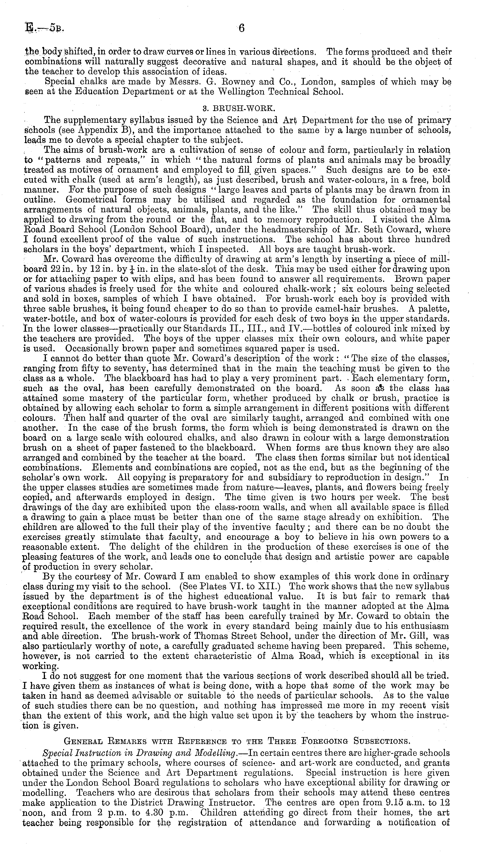 the body shifted, in order to draw curves or lines in various directions. The forms produced and their combinations will naturally suggest decorative and natural shapes, and it should be the object of the teacher to develop this association of ideas. Special chalks are made by Messrs. G. Eowney and Co., London, samples of which may be seen at the Education Department or at the Wellington Technical School. 3. BRUSH-WORK. The supplementary syllabus issued by the Science and Art Department for the use of primary schools (see Appendix B), and the importance attached to the same by a large number of schools, leads me to devote a special chapter to the subject. The aims of brush-work are a cultivation of sense of colour and form, particularly in relation to "patterns and repeats," in which "the natural forms of plants and animals may be broadly treated as motives of ornament and employed to fill given spaces." Such designs are to be executed with chalk (used at arm's length), as just described, brush and water-colours, in a free, bold manner. For the purpose of such designs " large leaves and parts of plants may be drawn from in outline. Geometrical forms may be utilised and regarded as the foundation for ornamental arrangements of natural objects, animals, plants, and the like." The skill thus obtained may be applied to drawing from the round or the fiat, and to memory reproduction. I visited the Alma Eoad Board School (London School Board), under the headmastership of Mr. Seth Coward, where I found excellent proof of the value of such instructions. The school has about three hundred scholars in the boys' department, which I inspected. All boys are taught brush-work. Mr. Coward has overcome the difficulty of drawing at arm's length by inserting a piece of millboard 22 in. by 12 in. by -J- in. in the slate-slot of the desk. This may be used either for drawing upon or for attaching paper to with clips, and has been found to answer all requirements. Brown paper of various shades is freely used for the white and coloured chalk-work ; six colours being selected and sold in boxes, samples of which I have obtained. For brush-work each boy is provided with three sable brushes, it being found cheaper to do so than to provide camel-hair brushes. A palette, water-bottle, and box of water-colours is provided for each desk of two boys in the upper standards. In the lower classes—practically our Standards 11., 111., and IV.—bottles of coloured ink mixed by the teachers are provided. The boys of the upper classes mix their own colours, and white paper is used. Occasionally brown paper and sometimes squared paper is used. I cannot do better than quote Mr. Coward's description of the work : " The size of the classes, ranging from fifty to seventy, has determined that in the main the teaching must be given to the class as a whole. The blackboard has had to play a very prominent part. Each elementary form, such as the oval, has been carefully demonstrated on the board. As soon a% the class has attained some mastery of the particular form, whether produced by chalk or brush, practice is obtained by allowing each scholar to form a simple arrangement in different positions with different colours. Then half and quarter of the oval are similarly taught, arranged and combined with one another. In the case of the brush forms, the form which is being demonstrated is drawn on the board on a large scale with coloured chalks, and also drawn in colour with a large demonstration brush on a sheet of paper fastened to the blackboard. When forms are thus known they are also arranged and combined by the teacher at the board. The class then forms similar but not identical combinations. Elements and combinations are copied, not as the end, but as the beginning of the scholar's own work. All copying is preparatory for and subsidiary to reproduction in design." In the upper classes studies are sometimes made from nature—leaves, plants, and flowers being freely copied, and afterwards employed in design. The time given is two hours per week. The best drawings of the day are exhibited upon the class-room walls, and when all available space is filled a drawing to gain a place must be better than one of the same stage already on exhibition. The children are allowed to the full their play of the inventive faculty ; and there can be no doubt the exercises greatly stimulate that faculty, and encourage a boy to believe in his own powers to a reasonable extent. The delight of the children in the production of these exercises is one of the pleasing features of the work, and leads one to conclude that design and artistic power are capable of production in every scholar. By the courtesy of Mr. Coward I am enabled to show examples of this work done in ordinary class during my visit to the school. (See Plates VI. to XII.) The work shows that the new syllabus issued by the department is of the highest educational value. It is but fair to remark that exceptional conditions are required to have brush-work taught in the manner adopted at the Alma Eoad School. Each member of the staff has been carefully trained by Mr. Coward to obtain the required result, the excellence of the work in every standard being mainly due to his enthusiasm and able direction. The brush-work of Thomas Street School, under the direction of Mr. Gill, was also particularly worthy of note, a carefully graduated scheme having been prepared. This scheme, however, is not carried to the extent characteristic of Alma Eoad, which is exceptional in its working. I do not suggest for one moment that the various sections of work described should all be tried. I have given them as instances of what is being done, with a hope that some of the work may be taken in hand as deemed advisable or suitable to the needs of particular schools. As to the value of such studies there can be no question, and nothing has impressed me more in my recent visit than the extent of this work, and the hig