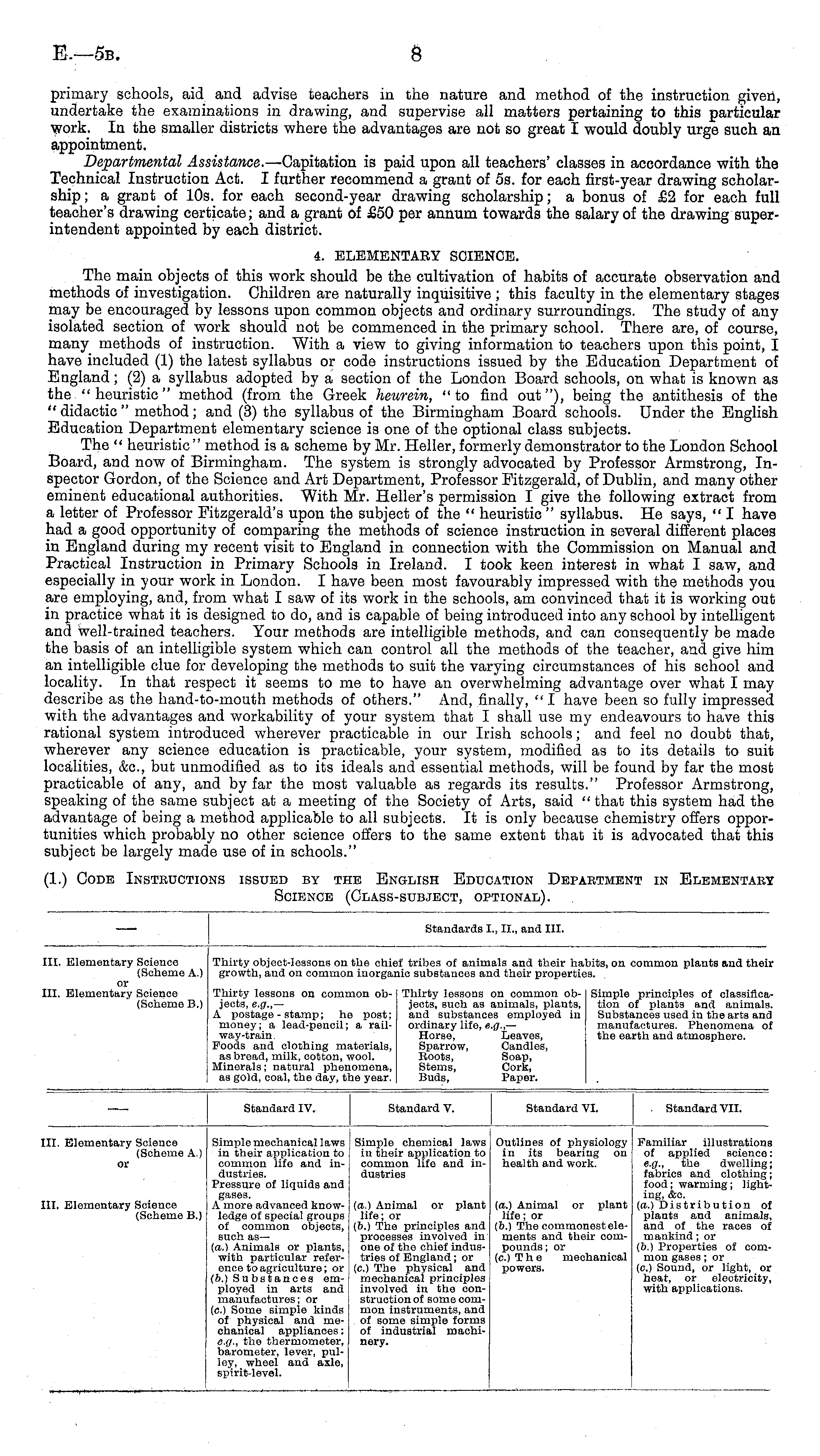 primary schools, aid and advise teachers in the nature and method of the instruction given, undertake the examinations in drawing, and supervise all matters pertaining to this particular work. In the smaller districts where the advantages are not so great I would doubly urge such an appointment. Departmental Assistance. —Capitation is paid upon all teachers' classes in accordance with the Technical Instruction Act. I further recommend a grant of ss. for each first-year drawing scholarship ; a grant of 10s. for each second-year drawing scholarship; a bonus of £2 for each full teacher's drawing corticate; and a grant of £50 per annum towards the salary of the drawing superintendent appointed by each district. 4. ELEMENTARY SCIENCE. The main objects of this work should be the cultivation of habits of accurate observation and methods of investigation. Children are naturally inquisitive ; this faculty in the elementary stages may be encouraged by lessons upon common objects and ordinary surroundings. The study of any isolated section of work should not be commenced in the primary school. There are, of course, many methods of instruction. With a view to giving information to teachers upon this point, I have included (1) the latest syllabus or code instructions issued by the Education Department of England; (2) a syllabus adopted by a section of the London Board schools, on what is known as the " heuristic" method (from the Greek heurein, "to find out"), being the antithesis of the " didactic " method; and (3) the syllabus of the Birmingham Board schools. Under the English Education Department elementary science is one of the optional class subjects. The " heuristic " method is a scheme by Mr. Heller, formerly demonstrator to the London School Board, and now of Birmingham. The system is strongly advocated by Professor Armstrong, Inspector Gordon, of the Science and Art Department, Professor Fitzgerald, of Dublin, and many other eminent educational authorities. With Mr. Heller's permission I give the following extract from a letter of Professor Fitzgerald's upon the subject of the " heuristic " syllabus. He says, " I have had a good opportunity of comparing the methods of science instruction in several different places in England during my recent visit to England in connection with the Commission on Manual and Practical Instruction in Primary Schools in Ireland. I took keen interest in what I saw, and especially in your work in London. I have been most favourably impressed with the methods you are employing, and, from what I saw of its work in the schools, am convinced that it is working out in practice what it is designed to do, and is capable of being introduced into any school by intelligent and well-trained teachers. Your methods are intelligible methods, and can consequently be made the basis of an intelligible system which can control all the methods of the teacher, and give him an intelligible clue for developing the methods to suit the varying circumstances of his school and locality. In that respect it seems to me to have an overwhelming advantage over what I may describe as the hand-to-mouth methods of others." And, finally, " I have been so fully impressed with the advantages and workability of your system that I shall use my endeavours to have this rational system introduced wherever practicable in our Irish schools; and feel no doubt that, wherever any science education is practicable, your system, modified as to its details to suit localities, &c, but unmodified as to its ideals and essential methods, will be found by far the most practicable of any, and by far the most valuable as regards its results." Professor Armstrong, speaking of the same subject at a meeting of the Society of Arts, said " that this system had the advantage of being a method applicable to all subjects. It is only because chemistry offers opportunities which probably no other science offers to the same extent that it is advocated that this subject be largely made use of in schools."