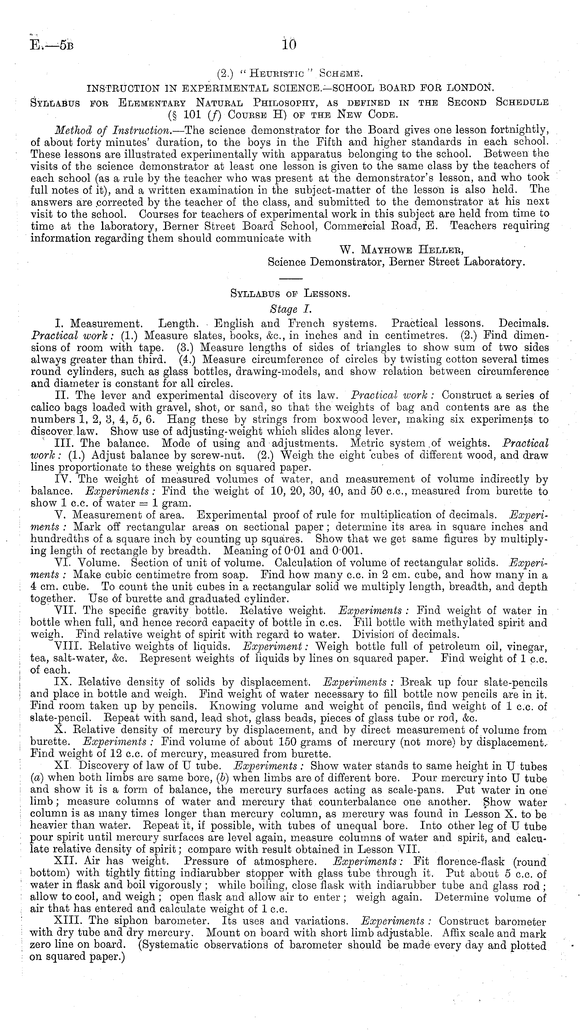 (2.) " Heuristic " Scheme. INSTRUCTION IN EXPERIMENTAL SCIENCE.—SCHOOL BOARD FOR LONDON. Syllabus fob Elementary Natural Philosophy, as defined in the Second Schedule (§ 101 (/) Course H) of the New Code. Method of Instruction. —The science demonstrator for the Board gives one lesson fortnightly, of about forty minutes' duration, to the boys in the Fifth and higher standards in each school. These lessons are illustrated experimentally with apparatus belonging to the school. Between the visits of the science demonstrator at least one lesson is given to the same class by the teachers of each school (as a rule by the teacher who was present at the demonstrator's lesson, and who took full notes of it), and a written examination in the subject-matter of the lesson is also held. The answers are .corrected by the teacher of the class, and submitted to the demonstrator at his next visit to the school. Courses for teachers of experimental work in this subject are held from time to time at the laboratory, Berner Street Board School, Commercial Boad, E. Teachers requiring information regarding them should communicate with W. Mayhowe Heller, Science Demonstrator, Berner Street Laboratory.