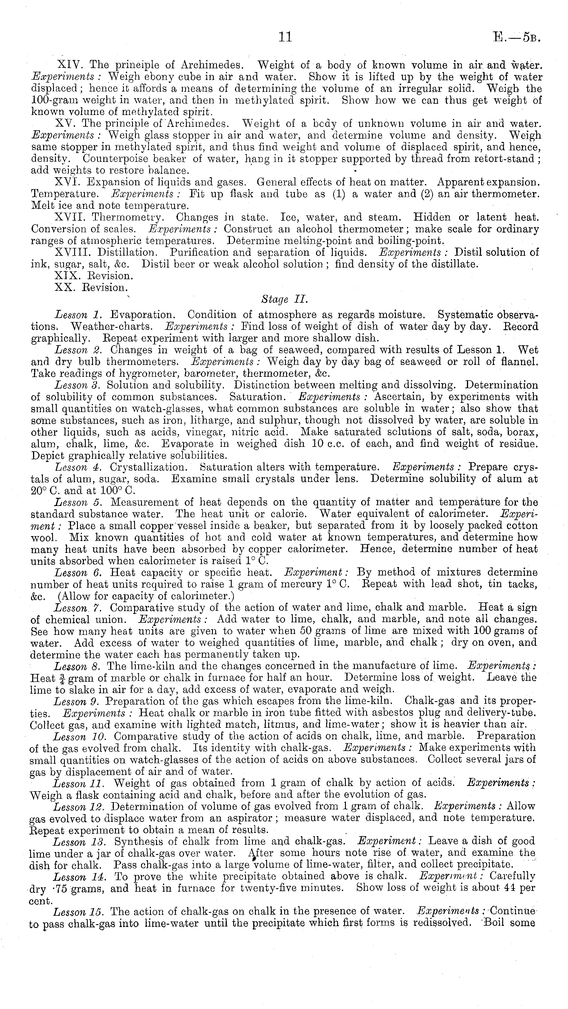 XIV. The principle of Archimedes. Weight of a body of known volume in air and water. Experiments : Weigh ebony cube in air and water. Show it is lifted up by the weight of water displaced ; hence it affords a means of determining the volume of an irregular solid. Weigh the 100-gram weight in water, and then in methylated spirit. Show how we can thus get weight of known volume of methylated spirit. XV. The principle of Archimedes. Weight of a body of unknown volume in air and water. Experiments : Weigh glass stopper in air and water, and determine volume and density. Weigh same stopper in methylated spirit, and thus find weight and volume of displaced spirit, and hence, density. Counterpoise beaker of water, hang in it stopper supported by thread from retort-stand ; add weights to restore balance. XVI. Expansion of liquids and gases. General effects of heat on matter. Apparent expansion. Temperature. Experiments : Fit up flask and tube as (1) a water and (2) an air thermometer. Melt ice and note temperature. XVII. Thermometry. Changes in state. Ice, water, and steam. Hidden or latent heat. Conversion of scales. Experiments : Construct an alcohol thermometer; make scale for ordinary ranges of atmospheric temperatures. Determine melting-point and boiling-point. XVIII. Distillation. Purification and separation of liquids. Experiments : Distil solution of ink, sugar, salt, &c. Distil beer or weak alcohol solution; find density of the distillate. XIX. Bevision. XX. Bevision. Stage 11. Lesson 1. Evaporation. Condition of atmosphere as regards moisture. Systematic observations. Weather-charts. Experiments : Find loss of weight of dish of water day by day. Becord graphically. Bepeat experiment with larger and more shallow dish. Lesson 2. Changes in weight of a bag of seaweed, compared with results of Lesson 1. Wet and drj' bulb thermometers. Experiments : Weigh day by day bag of seaweed or roll of flannel. Take readings of hygrometer, barometer, thermometer, &c Lesson 3. Solution and solubility. Distinction between melting and dissolving. Determination of solubility of common substances. Saturation. Experiments : Ascertain, by experiments with small quantities on watch-glasses, what common substances are soluble in water; also show that some substances, such as iron, litharge, and sulphur, though not dissolved by water, are soluble in other liquids, such as acids, vinegar, nitric acid. Make saturated solutions of salt, soda, borax, alum, chalk, lime, &c Evaporate in weighed dish 10 cc. of each, and find weight of residue. Depict graphically relative solubilities. Lesson 4. Crystallization. Saturation alters with temperature. Experiments : Prepare crystals of alum, sugar, soda. Examine small crystals under lens. Determine solubility of alum at 20° C. and at 100° C. Lesson 5. Measurement of heat depends on the quantity of matter and temperature for the standard substance water. The heat unit or calorie. Water equivalent of calorimeter. Experiment : Place a small copper vessel inside a beaker, but separated from it by loosely packed cotton wool. Mix known quantities of hot and cold water at known temperatures, and determine how many heat units have been absorbed by copper calorimeter. Hence, determine number of heat units absorbed when calorimeter is raised 1° C. Lesson 6. Heat capacity or specific heat. Experiment: By method of mixtures determine number of heat units required to raise 1 gram of mercury 1° C. Bepeat with lead shot, tin tacks, &c. (Allow for capacity of calorimeter.) Lesson. 7. Comparative study of the action of water and lime, chalk and marble. Heat a sign of chemical union. Experiments : Add water to lime, chalk, and marble, and note all changes. See how many heat units are given to water when 50 grams of lime are mixed with 100 grams of water. Add excess of water to weighed quantities of lime, marble, and chalk ; dry on oven, and determine the water each has permanently taken up. Lesson 8. The lime-kiln and the changes concerned in the manufacture of lime. Experiments : Heat f gram of marble or chalk in furnace for half an hour. Determine loss of weight. Leave the lime to slake in air for a day, add excess of water, evaporate and weigh. Lesson 9. Preparation of the gas which escapes from the lime-kiln. Chalk-gas and its properties. Experiments : Heat chalk or marble in iron tube fitted with asbestos plug and delivery-tube. Collect gas, and examine with lighted match, litmus, and lime-water; show it is heavier than air. Lesson 10. Comparative study of the action of acids on chalk, lime, and marble. Preparation of the gas evolved from chalk. Its identity with chalk-gas. Experiments : Make experiments with small quantities on watch-glasses of the action of acids on above substances. Collect several jars of gas by displacement of air and of water. Lesson 11. Weight of gas obtained from 1 gram of chalk by action of acids. Experiments : Weigh a flask containing acid and chalk, before and after the evolution of gas. Lesson 12. Determination of volume of gas evolved from 1 gram of chalk. Experiments : Allow gas evolved to displace water from an aspirator ; measure water displaced, and note temperature. Bepeat experiment to obtain a mean of results. Lesson 13. Synthesis of chalk from lime and chalk-gas. Experiment: Leave a dish of good lime under a jar of chalk-gas over water. After some hours note rise of water, and examine the dish for chalk. Pass chalk-gas into a large volume of lime-water, filter, and collect precipitate. Lesson 14. To prove the white precipitate obtained above is chalk. Experiment: Carefully dry -75 grams, and heat in furnace for twenty-five minutes. Show loss of weight is about 41 per cent. Lesson 15. The action of chalk-gas on chalk in the presence of water. Experiments : Continue to pass chalk-gas into lime-water until the precipitate which first forms is redissolved. Boil some