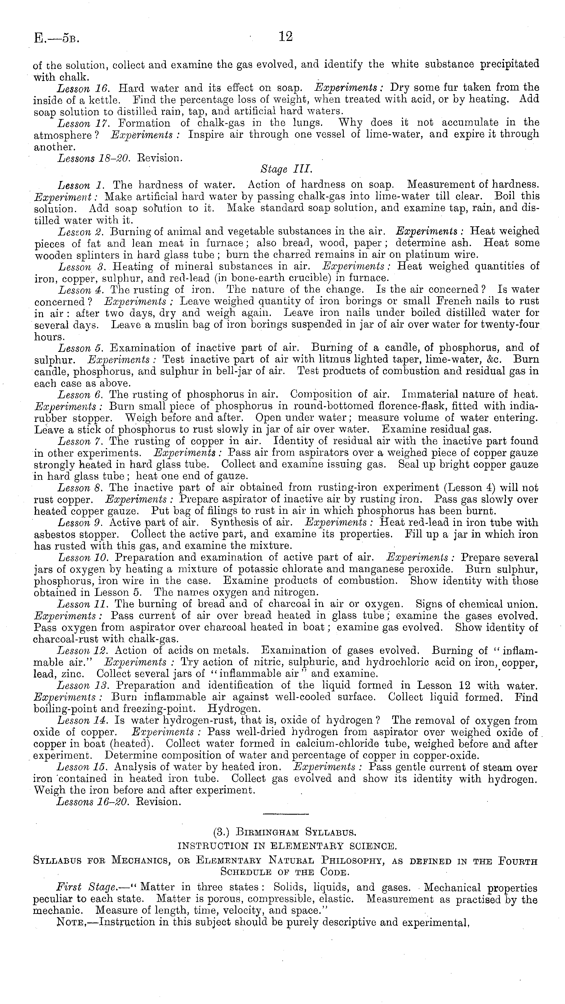 (3.) Birmingham Syllabus. INSTRUCTION IN ELEMENTARY SCIENCE. Syllabus for Mechanics, or Elementary Natural Philosophy, as defined in the Fourth Schedule of the Code. First Stage. —" Matter in three states : Solids, liquids, and gases. Mechanical properties peculiar to each state. Matter is porous, compressible, elastic. Measurement as practised by the mechanic. Measure of length, time, velocity, and space." Note. —Instruction in this subject should be purely descriptive and experimental.