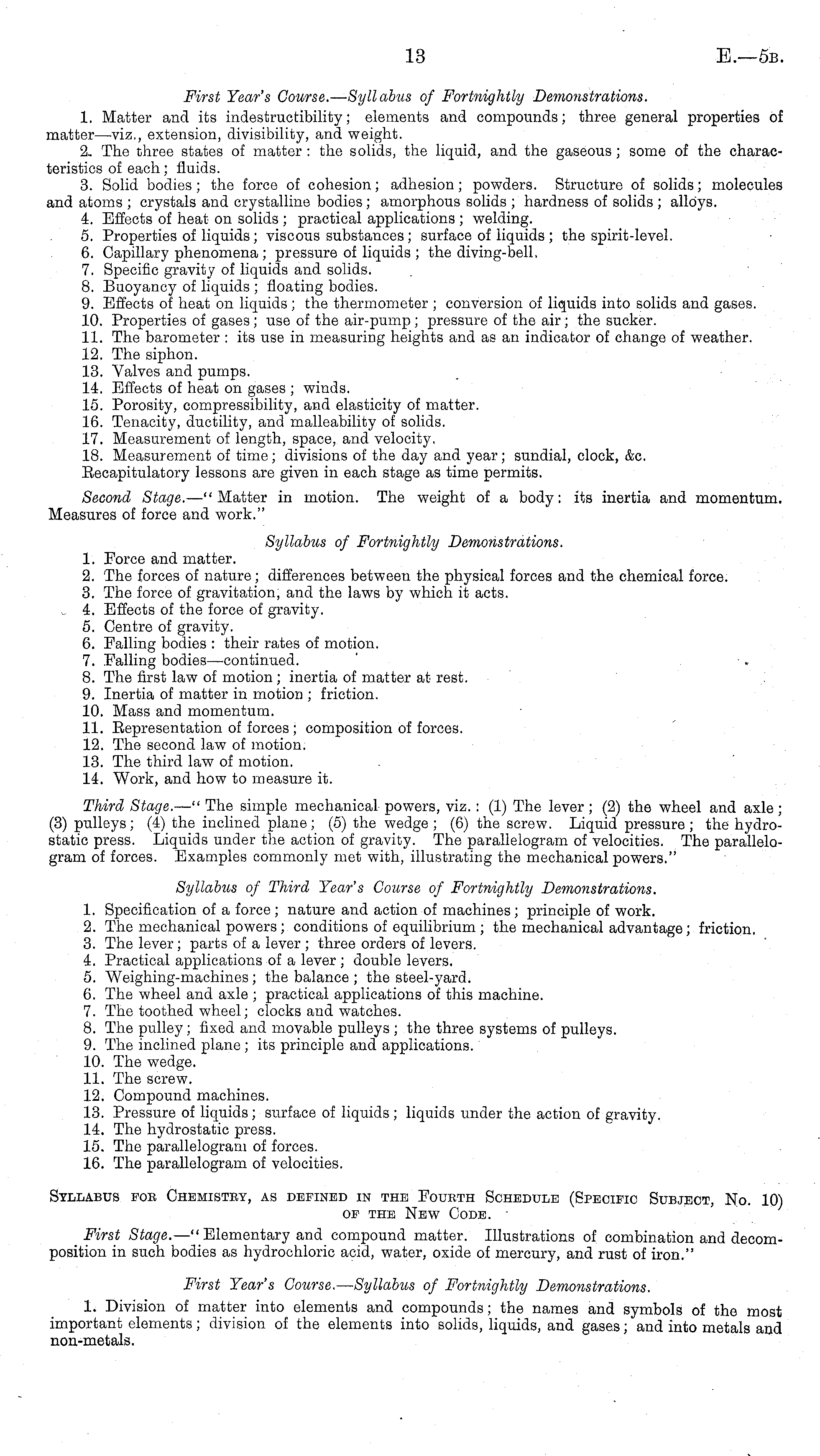 First Year's Course. — Syllabus of Fortnightly Demonstrations. 1. Matter and its indestructibility; elements and compounds; three general properties of matter—viz., extension, divisibility, and weight. 2. The three states of matter : the solids, the liquid, and the gaseous; some of the characteristics of each; fluids. 3. Solid bodies; the force of cohesion; adhesion; powders. Structure of solids; molecules and atoms ; crystals and crystalline bodies; amorphous solids ; hardness of solids ; alloys. 4. Effects of heat on solids ; practical applications ; welding. 5. Properties of liquids; viscous substances; surface of liquids ; the spirit-level. 6. Capillary phenomena ; pressure of liquids ; the diving-bell. 7. Specific gravity of liquids and solids. 8. Buoyancy of liquids ; floating bodies. 9. Effects of heat on liquids; the thermometer ; conversion of liquids into solids and gases. 10. Properties of gases ; use of the air-pump ; pressure of the air; the sucker. 11. The barometer : its use in measuring heights and as an indicator of change of weather. 12. The siphon. 13. Valves and pumps. 14. Effects of heat on gases ; winds. 15. Porosity, compressibility, and elasticity of matter. 16. Tenacity, ductility, and malleability of solids. 17. Measurement of length, space, and velocity. 18. Measurement of time; divisions of the day and year; sundial, clock, &c Becapitulatory lessons are given in each stage as time permits. Second Stage. —"Matter in motion. The weight of a body: its inertia and momentum. Measures of force and work." Syllabus of Fortnightly Demonstrations. 1. Force and matter. 2. The forces of nature; differences between the physical forces and the chemical force. 3. The force of gravitation, and the laws by which it acts. ~ 4. Effects of the force of gravity. 5. Centre of gravity. 6. Falling bodies : their rates of motion. 7. Falling bodies —continued. 8. The first law of motion; inertia of matter at rest. 9. Inertia of matter in motion ; friction. 10. Mass and momentum. 11. Bepresentation of forces ; composition of forces. 12. The second law of motion. 13. The third law of motion. 14. Work, and how to measure it. Third Stage.—" The simple mechanical powers, viz. : (1) The lever; (2) the wheel and axle; (3) pulleys; (4) the inclined plane; (5) the wedge; (6) the screw. Liquid pressure; the hydrostatic press. Liquids under the action of gravity. The parallelogram of velocities. The parallelogram of forces. Examples commonly met with, illustrating the mechanical powers." Syllabus of Third Year's Course of Fortnightly Demonstrations. 1. Specification of a force ; nature and action of machines ; principle of work. 2. The mechanical powers ; conditions of equilibrium ; the mechanical advantage; friction. 3. The lever; parts of a lever ; three orders of levers. 4. Practical applications of a lever ; double levers. 5. Weighing-machines ; the balance ; the steel-yard. 6. The wheel and axle ; practical applications of this machine. 7. The toothed wheel; clocks and watches. 8. The pulley; fixed and movable pulleys ; the three systems of pulleys. 9. The inclined plane ; its principle and applications. 10. The wedge. 11. The screw. 12. Compound machines. 13. Pressure of liquids; surface of liquids; liquids under the action of gravity. 14. The hydrostatic press. 15. The parallelogram of forces. 16. The parallelogram of velocities. Syllabus for Chemistry, as defined in the Fourth Schedule (Specific Subject, No. 10) of the New Code. - First Stage. —" Elementary and compound matter. Illustrations of combination and decomposition in such bodies as hydrochloric acid, water, oxide of mercury, and rust of iron." First Year's Course. — Syllabus of Fortnightly Demonstrations. 1. Division of matter into elements and compounds; the names and symbols of the most important elements; division of the elements into solids, liquids, and gases; and into metals and non-metals.