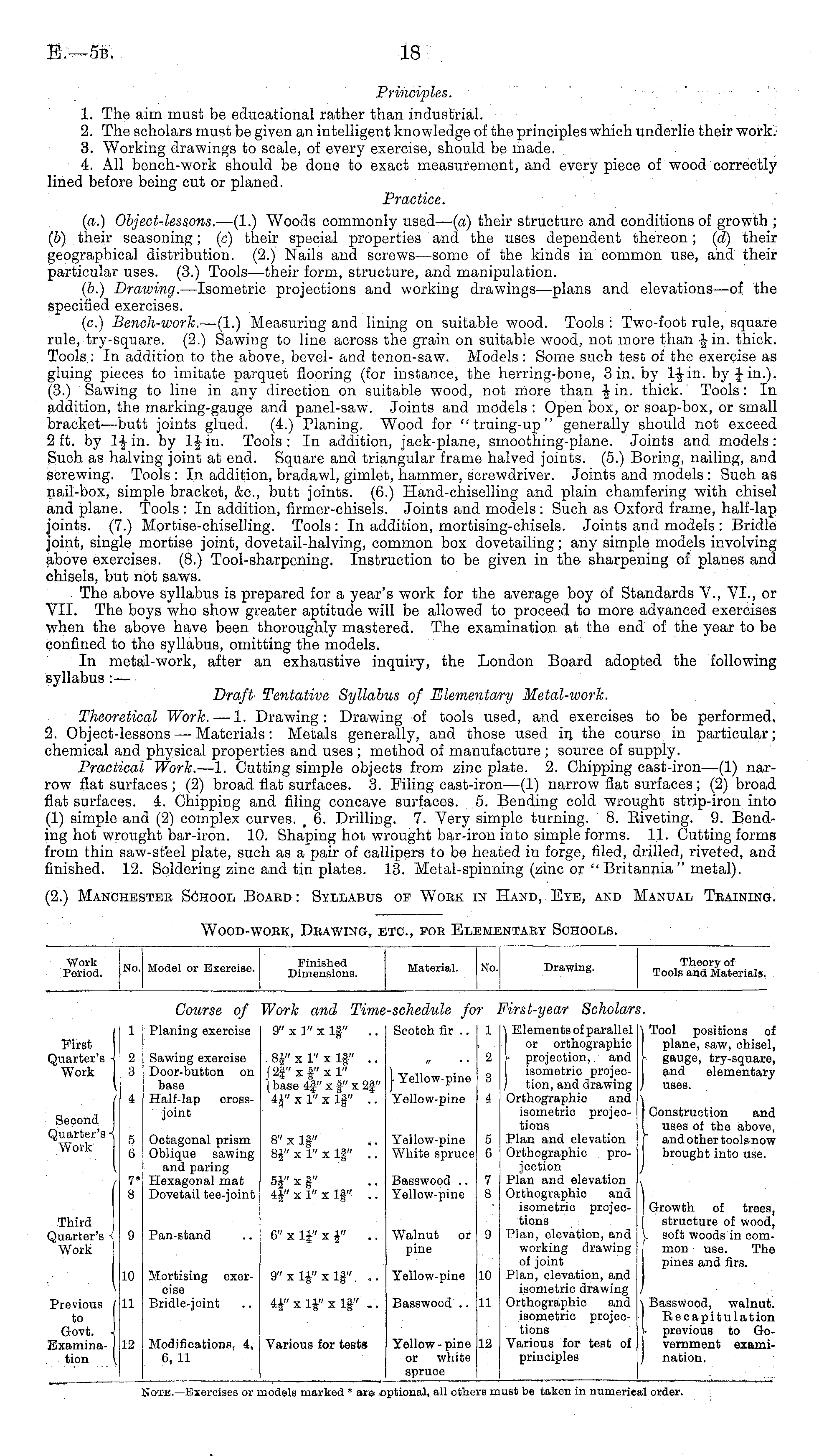 Principles. 1. The aim must be educational rather than industrial. 2. The scholars must be given an intelligent knowledge of the principles which underlie their work. 3. Working drawings to scale, of every exercise, should be made. 4. All bench-work should be done to exact measurement, and every piece of wood correctly lined before being cut or planed. Practice. (a.) Object-lessons. —(l.) Woods commonly used— (a) their structure and conditions of growth ; (b) their seasoning; (c) their special properties and the uses dependent thereon; (d) their geographical distribution. (2.) Nails and screws—some of the kinds in common use, and their particular uses. (3.) Tools—their form, structure, and manipulation. (b.) Drawing. —lsometric projections and working drawings—plans and elevations—of the specified exercises. (c.) Bench-work. —(l.) Measuring and lining on suitable wood. Tools : Two-foot rule, square rule, try-square. (2.) Sawing to line across the grain on suitable w r ood, not more than -Jin. thick. Tools :In addition to the above, bevel- and tenon-saw. Models : Some such test of the exercise as gluing pieces to imitate parquet flooring (for instance, the herring-bone, 3 in. by ljin. by Jin.). (3.) Sawing to line in any direction on suitable wood, not more than \ in. thick. Tools :In addition, the marking-gauge and panel-saw. Joints and models : Open box, or soap-box, or small bracket—butt joints glued. (4.) Planing. Wood for " truing-up " generally should not exceed 2 ft. by 1-J in. by Tools: In addition, jack-plane, smoothing-plane. Joints and models: Such as halving joint at end. Square and triangular frame halved joints. (5.) Boring, nailing, and screwing. Tools :In addition, bradawl, gimlet, hammer, screwdriver. Joints and models : Such as nail-box, simple bracket, &c, butt joints. (6.) Hand-chiselling and plain chamfering with chisel and plane. Tools :In addition, firmer-chisels. Joints and models : Such as Oxford frame, half-lap joints. (7.) Mortise-chiselling. Tools :In addition, mortising-chisels. Joints and models : Bridle joint, single mortise joint, dovetail-halving, common box dovetailing; any simple models involving above exercises. (8.) Tool-sharpening. Instruction to be given in the sharpening of planes and chisels, but not saws. The above syllabus is prepared for a year's work for the average boy of Standards V., VI., or VII. The boys who show greater aptitude will be allowed to proceed to more advanced exercises when the above have been thoroughly mastered. The examination at the end of the year to be confined to the syllabus, omitting the models. In metal-work, after an exhaustive inquiry, the London Board adopted the following syllabus :— Draft Tentative Syllabus of Elementary Metal-work. Theoretical Work. —1. Drawing: Drawing of tools used, and exercises to be performed. 2. Object-lessons — Materials: Metals generally, and those used in. the course in particular; chemical and physical properties and uses ; method of manufacture; source of supply. Practical Work. —l. Cutting simple objects from zinc plate. 2. Chipping cast-iron—(l) narrow flat surfaces ; (2) broad flat surfaces. 3. Filing cast-iron —(1) narrow flat surfaces; (2) broad flat surfaces. 4. Chipping and filing concave surfaces. 5. Bending cold wrought strip-iron into (1) simple and (2) complex curves. _6. Drilling. 7. Very simple turning. 8. Biveting. 9. Bending hot wrought bar-iron. 10. Shaping hot wrought bar-iron into simple forms. 11. Cutting forms from thin saw-steel plate, such as a pair of callipers to be heated in forge, filed, drilled, riveted, and finished. 12. Soldering zinc and tin plates. 13. Metal-spinning (zinc or "Britannia" metal). (2.) Manchester School Board : Syllabus of Work in Hand, Eye, and Manual Training.