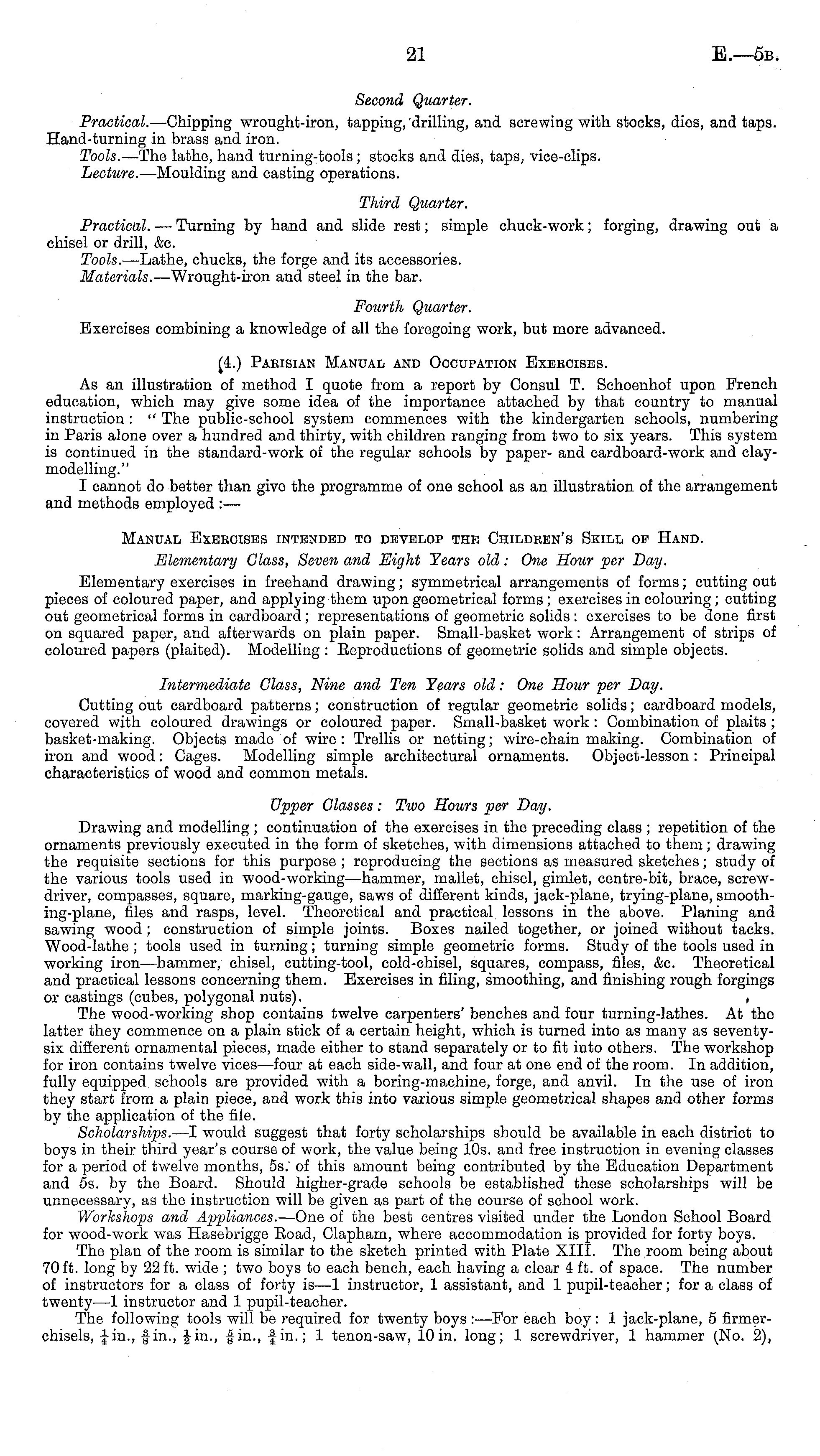 Second Quarter. Practical. —Chipping wrought-iron, tapping, drilling, and screwing with stocks, dies, and taps. Hand-turning in brass and iron. Tools. —The lathe, hand turning-tools; stocks and dies, taps, vice-clips. Lecture. —Moulding and casting operations. Third Quarter. Practical. — Turning by hand and slide rest; simple chuck-work; forging, drawing out a chisel or drill, &c. Tools. —Lathe, chucks, the forge and its accessories. Materials. —Wrought-iron and steel in the bar. Fourth Quarter. Exercises combining a knowledge of all the foregoing work, but more advanced. £4.) Parisian Manual and Occupation Exercises. As an illustration of method I quote from a report by Consul T. Schoenhof upon French education, which may give some idea of the importance attached by that country to manual instruction : " The public-school system commences with the kindergarten schools, numbering in Paris alone over a hundred and thirty, with children ranging from two to six years. This system is continued in the standard-work of the regular schools by paper- and cardboard-work and claymodelling." I cannot do better than give the programme of one school as an illustration of the arrangement and methods employed : — Manual Exercises intended to develop the Children's Skill of Hand. Elementary Class, Seven and Eight Years old: One Hour per Day. Elementary exercises in freehand drawing; symmetrical arrangements of forms; cutting out pieces of coloured paper, and applying them upon geometrical forms ; exercises in colouring; cutting out geometrical forms in cardboard ; representations of geometric solids : exercises to be done first on squared paper, and afterwards on plain paper. Small-basket work: Arrangement of strips of coloured papers (plaited). Modelling : Beproductions of geometric solids and simple objects. Intermediate Class, Nine and Ten Years old: One Hour per Day. Cutting out cardboard patterns; construction of regular geometric solids; cardboard models, covered with coloured drawings or coloured paper. Small-basket work : Combination of plaits; basket-making. Objects made of wire : Trellis or netting; wire-chain making. Combination of iron and wood: Cages. Modelling simple architectural ornaments. Object-lesson : Principal characteristics of wood and common metals. Upper Glasses: Two Hours per Day. Drawing and modelling ; continuation of the exercises in the preceding class ; repetition of the ornaments previously executed in the form of sketches, with dimensions attached to them; drawing the requisite sections for this purpose ; reproducing the sections as measured sketches; study of the various tools used in wood-working—hammer, mallet, chisel, gimlet, centre-bit, brace, screwdriver, compasses, square, marking-gauge, saws of different kinds, jack-plane, trying-plane, smooth-ing-plane, files and rasps, level. Theoretical and practical lessons in the above. Planing and sawing wood; construction of simple joints. Boxes nailed together, or joined without tacks. Wood-lathe ; tools used in turning; turning simple geometric forms. Study of the tools used in working iron—hammer, chisel, cutting-tool, cold-chisel, squares, compass, files, &c. Theoretical and practical lessons concerning them. Exercises in filing, smoothing, and finishing rough forgings or castings (cubes, polygonal nuts). , The wood-working shop contains twelve carpenters' benches and four turning-lathes. At the latter they commence on a plain stick of a certain height, which is turned into as many as seventysix different ornamental pieces, made either to stand separately or to fit into others. The workshop for iron contains twelve vices—four at each side-wall, and four at one end of the room. In addition, fully equipped schools are provided with a boring-machine, forge, and anvil. In the use of iron they start from a plain piece, and work this into various simple geometrical shapes and other forms by the application of the file. Scholarships. —l would suggest that forty scholarships should be available in each district to boys in their third year's course of work, the value being 10s. and free instruction in evening classes for a period of twelve months, ss.' of this amount being contributed by the Education Department and ss. by the Board. Should higher-grade schools be established these scholarships will be unnecessary, as the instruction will be given as part of the course of school work. Workshops and Appliances. —One of the best centres visited under the London School Board for wood-work was Hasebrigge Boad, Clapham, where accommodation is provided for forty boys. The plan of the room is similar to the sketch printed with Plate XIII. The room being about 70 ft. long by 22 ft. wide ; two boys to each bench, each having a clear 4 ft. of space. The number of instructors for a class of forty is—l instructor, 1 assistant, and 1 pupil-teacher; for a class of twenty —1 instructor and 1 pupil-teacher. The following tools will be required for twenty boys : —For each boy: 1 jack-plane, 5 firmerchisels, Jin., fin., Jin., fin., fin.; 1 tenon-saw, 10in. long; 1 screwdriver, 1 hammer (No. 2),