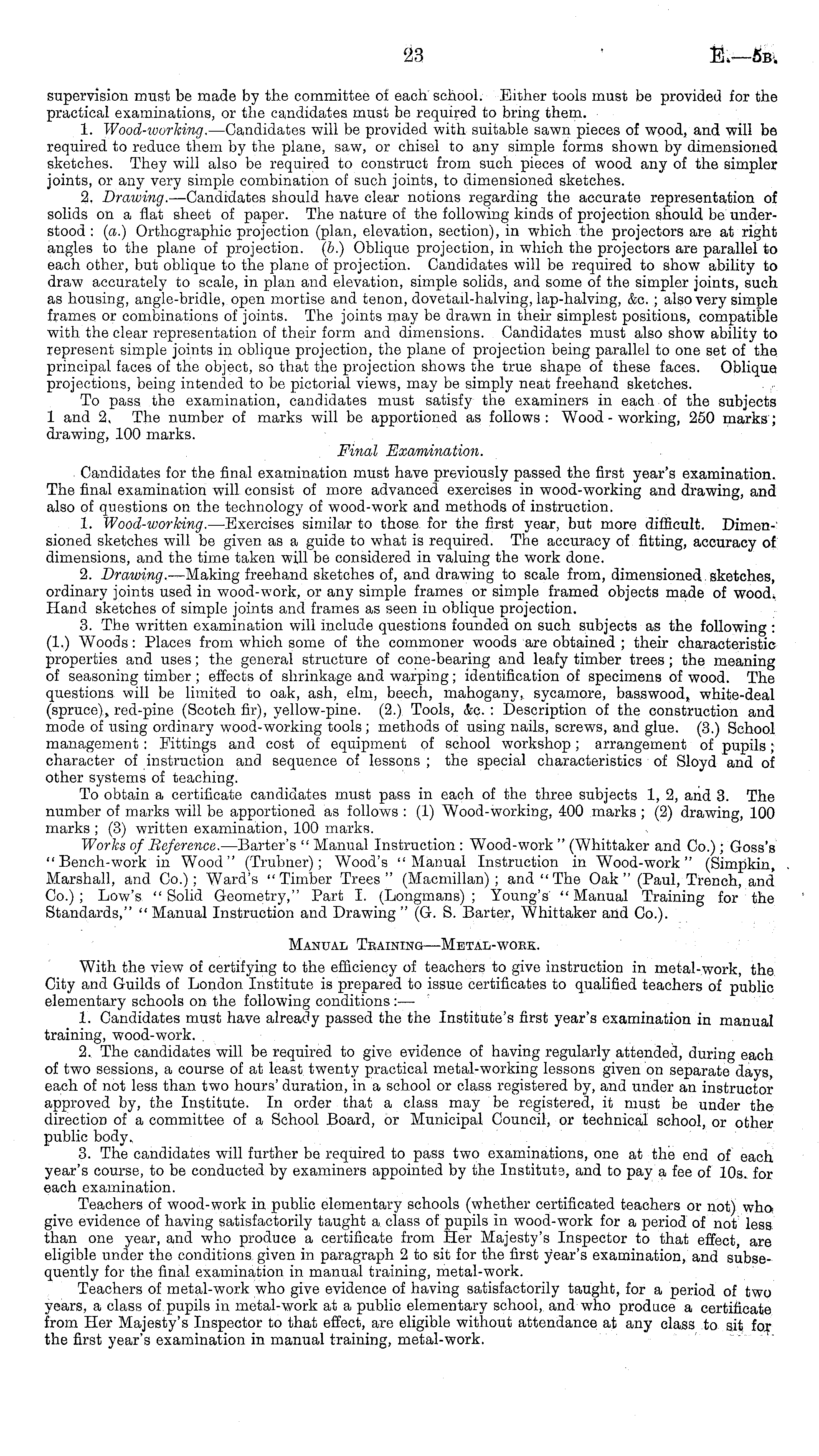 supervision must be made by the committee of each school. Either tools must be provided for the practical examinations, or the candidates must be required to bring them. 1. Wood-working. —Candidates will be provided with suitable sawn pieces of wood, and will be required to reduce them by the plane, saw, or chisel to any simple forms shown by dimensioned sketches. They will also be required to construct from such pieces of wood any of the simpler joints, or any very simple combination of such joints, to dimensioned sketches. 2. Drawing. —Candidates should have clear notions regarding the accurate representation of solids on a flat sheet of paper. The nature of the following kinds of projection should be understood : (a.) Orthographic projection (plan, elevation, section), in which the projectors are at right angles to the plane of projection, (b.) Oblique projection, in which the projectors are parallel to each other, but oblique to the plane of projection. Candidates will be required to show ability to draw accurately to scale, in plan and elevation, simple solids, and some of the simpler joints, such as housing, angle-bridle, open mortise and tenon, dovetail-halving, lap-halving, &c. ; also very simple frames or combinations of joints. The joints may be drawn in their simplest positions, compatible with the clear representation of their form and dimensions. Candidates must also show ability to represent simple joints in oblique projection, the plane of projection being parallel to one set of the principal faces of the object, so that the projection shows the true shape of these faces. Oblique projections, being intended to be pictorial views, may be simply neat freehand sketches. To pass the examination, candidates must satisfy the examiners in each of the subjects 1 and 2, The number of marks will be apportioned as follows : Wood - working, 250 marks; drawing, 100 marks. Final Examination. Candidates for the final examination must have previously passed the first year's examination. The final examination will consist of more advanced exercises in wood-working and drawing, and also of questions on the technology of wood-work and methods of instruction. 1. Wood-working. —Exercises similar to those for the first year, but more difficult. Dimensioned sketches will be given as a guide to what is required. The accuracy of fitting, accuracy of dimensions, and the time taken will be considered in valuing the work done. 2. Drawing. —Making freehand sketches of, and drawing to scale from, dimensioned sketches, ordinary joints used in wood-work, or any simple frames or simple framed objects made of wood. Hand sketches of simple joints and frames as seen in oblique projection. 3. The written examination will include questions founded on such subjects as the following : (1.) Woods: Places from which some of the commoner woods are obtained ; their characteristic properties and uses; the general structure of cone-bearing and leafy timber trees ; the meaning of seasoning timber ; effects of shrinkage and warping; identification of specimens of wood. The questions will be limited to oak, ash, elm, beech, mahogany, sycamore, basswood, white-deal (spruce), red-pine (Scotch fir), yellow-pine. (2.) Tools, &o. : Description of the construction and mode of using ordinary wood-working tools; methods of using nails, screws, and glue. (3.) School management : Fittings and cost of equipment of school workshop; arrangement of pupils; character of instruction and sequence of lessons ; the special characteristics of Sloyd and of other systems of teaching. To obtain a certificate candidates must pass in each of the three subjects 1, 2, and 3. The number of marks will be apportioned as follows : (1) Wood-working, 400 marks ; (2) drawing, 100 marks ; (3) written examination, 100 marks. Works of Reference. —Barter's " Manual Instruction : Wood-work " (Whittaker and Co.); Goss's " Bench-work in Wood" (Trubner); Wood's "Manual Instruction in Wood-work" (Simpkin, Marshall, and Co.); Ward's "Timber Trees" (Macmillan) ; and " The Oak" (Paul, Trench, and Co.); Low's "Solid Geometry," Part I. (Longmans); Young's "Manual Training for the Standards," "Manual Instruction and Drawing" (G. S. Barter, Whittaker and Co.). Manual Training—Metal-work. With the view of certifying to the efficiency of teachers to give instruction in metal-work, the City and Guilds of London Institute is prepared to issue certificates to qualified teachers of public elementary schools on the following conditions : — 1. Candidates must have already passed the the Institute's first year's examination in manual training, wood-work. 2. The candidates will be required to give evidence of having regularly attended, during each of two sessions, a course of at least twenty practical metal-working lessons given on separate days, each of not less than two hours' duration, in a school or class registered by, and under an instructor approved by, the Institute. In order that a class may be registered, it must be under the direction of a committee of a School Board, or Municipal Council, or technical school, or other public body., 3. The candidates will further be required to pass two examinations, one at the end of each year's course, to be conducted by examiners appointed by the Institute, and to pay a fee of 10s. for each examination. Teachers of wood-work in public elementary schools (whether certificated teachers or not) who? give evidence of having satisfactorily taught a class of pupils in wood-work for a period of not less than one year, and who produce a certificate from Her Majesty's Inspector to that effect are eligible under the conditions given in paragraph 2 to sit for the first year's examination, and subsequently for the final examination in manual training, metal-work. Teachers of metal-work who give evidence of having satisfactorily taught, for a period of two years, a class of pupils in metal-work at a public elementary school, and wh