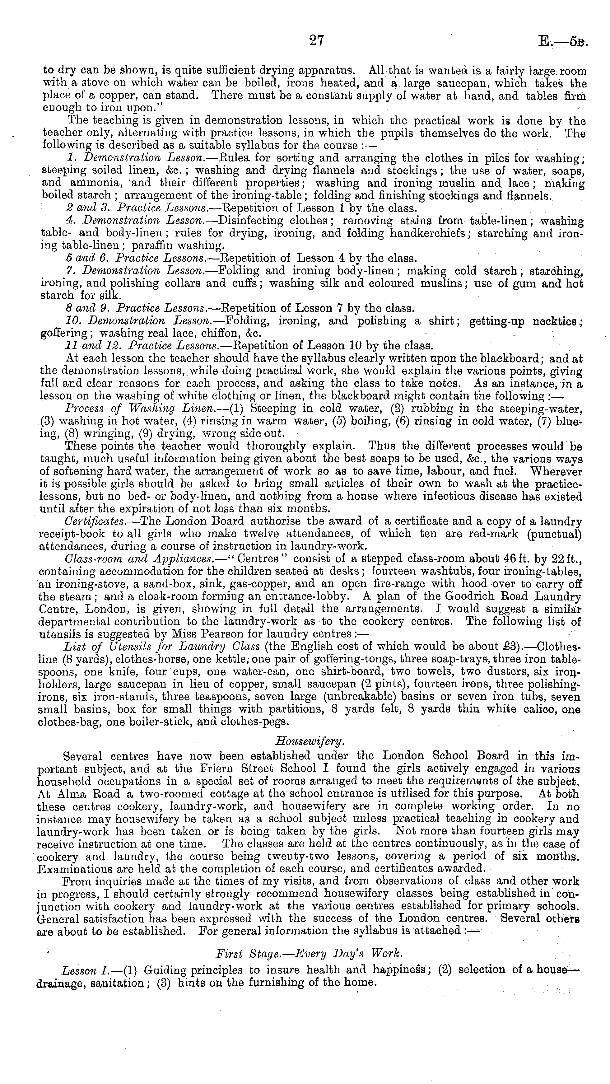 to dry can be shown, is quite sufficient drying apparatus. All that is wanted is a fairly large room with a stove on which water can be boiled, irons heated, and a large saucepan, which takes the place of a copper, can stand. There must be a constant supply of water at hand, and tables firm enough to iron upon." The teaching is given in demonstration lessons, in which the practical work is done by the teacher only, alternating with practice lessons, in which the pupils themselves do the work. The following is described as a suitable syllabus for the course :— 1. Demonstration Lesson. —Bules for sorting and arranging the clothes in piles for washing; steeping soiled linen, &c. ; washing and drying flannels and stockings ; the use of water, soaps, and ammonia, and their different properties; washing and ironing muslin and lace; making boiled starch ; arrangement of the ironing-table; folding and finishing stockings and flannels.. 2 and 3. Practice Lessons. —Bepetition of Lesson 1 by the class. 4. Demonstration Lesson. —Disinfecting clothes; removing stains from table-linen; washing table- and body-linen ; rules for drying, ironing, and folding handkerchiefs; starching and ironing table-linen; paraffin washing. 5 and 6. Practice Lessons. —Bepetition of Lesson 4 by the class. 7. Demonstration Lesson. —Folding and ironing body-linen; making cold starch; starching, ironing, and polishing collars and cuffs; washing silk and coloured muslins; use of gum and hot starch for silk. 8 and 9. Practice Lessons. —Bepetition of Lesson 7 by the class. 10. Demonstration Lesson. —Folding, ironing, and polishing a shirt; getting-up neckties; goffering; washing real lace, chiffon, &c. 11 and 12. Practice Lessons. —-Bepetition of Lesson 10 by the class. At each lesson the teacher should have the syllabus clearly written upon the blackboard; and at the demonstration lessons, while doing practical work, she would explain the various points, giving full and clear reasons for each process, and asking the class to take notes. As an instance, in a lesson on the washing of white clothing or linen, the blackboard might contain the following :— Process of Washing Linen. —(l) Steeping in cold water, (2) rubbing in the steeping-water, (3) washing in hot water, (4) rinsing in warm water, (5) boiling, (6) rinsing in cold water, (7) blueing, (8) wringing, (9) drying, wrong side out. These points the teacher would thoroughly explain. Thus the different processes would be taught, much useful information being given about the best soaps to be used, &c, the various ways of softening hard water, the arrangement of work so as to save time, labour, and fuel. Wherever it is possible girls should be asked to bring small articles of their own to wash at the practicelessons, but no bed- or body-linen, and nothing from a house where infectious disease has existed until after the expiration of not less than six months. Certificates. —The London Board authorise the award of a certificate and a copy of a laundry receipt-book to all girls who make twelve attendances, of which ten are red-mark (punctual) attendances, during a course of instruction in laundry-work. Class-room and Appliances. —"Centres" consist of a stepped class-room about 46ft. by 22ft., containing accommodation for the children seated at desks ; fourteen washtubs, four ironing-tables, an ironing-stove, a sand-box, sink, gas-copper, and an open fire-range with hood over to carry off the steam ; and a cloak-room forming an entrance-lobby. A plan of the Goodrich Boad Laundry Centre, London, is given, showing in full detail the arrangements. I would suggest a similar departmental contribution to the laundry-work as to the cookery centres. The following list of utensils is suggested by Miss Pearson for laundry centres: — List of Utensils for Laundry Class (the English cost of which would be about £3). —Clothesline (8 yards), clothes-horse, one kettle, one pair of goffering-tongs, three soap-trays, three iron tablespoons, one knife, four cups, one water-can, one shirt-board, two towels, two dusters, six ironholders, large saucepan in lieu of copper, small saucepan (2 pints), fourteen irons, three polishingirons, six iron-stands, three teaspoons, seven large (unbreakable) basins or seven iron tubs, seven small basins, box for small things with partitions, 8 yards felt, 8 yards thin white calico, one clothes-bag, one boiler-stick, and clothes-pegs. Housewifery. Several centres have now been established under the London School Board in this important subject, and at the Friern Street School I found the girls actively engaged in various household occupations in a special set of rooms arranged to meet the requirements of the subject. At Alma Boad a two-roomed cottage at the school entrance is utilised for this purpose. At both these centres cookery, laundry-work, and housewifery are in complete working order. In no instance may housewifery be taken as a school subject unless practical teaching in cookery and laundry-work has been taken or is being taken by the girls. Not more than fourteen girls may receive instruction at one time. The classes are held at the centres continuously, as in the case of cookery and laundry, the course being twenty-two lessons, covering a period of six months. Examinations are held at the completion of each course, and certificates awarded. From inquiries made at the times of my visits, and from observations of class and other work in progress, I should certainly strongly recommend housewifery classes being established in conjunction with cookery and laundry-work at the various centres established for primary schools. General satisfaction has been expressed with the success of the London centres. Several others are about to be established. For general information the syllabus is attached:— First Stage. — Every Day's Work. Lesson I. —(1) Guiding principles to insure health and happiness; (2) selection of a house— drain