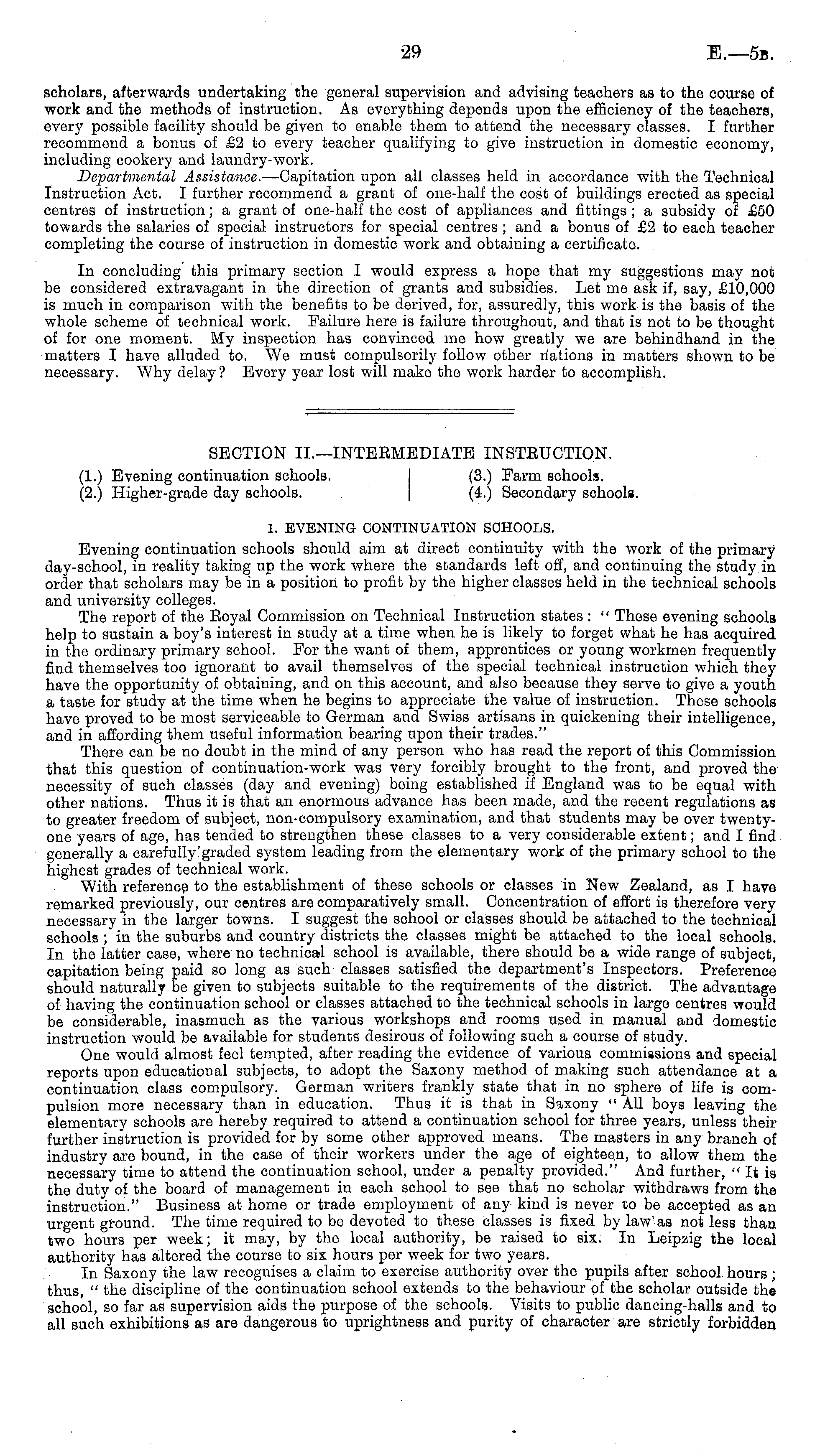 SECTION IL—INTEBMEDIATE INSTRUCTION. (1.) Evening continuation schools. (3.) Farm schools. (2.) Higher-grade day schools. (4.) Secondary schools. 1. EVENING CONTINUATION SCHOOLS. Evening continuation schools should aim at direct continuity with the work of the primary day-school, in reality taking up the work where the standards left off, and continuing the study in order that scholars may be in a position to profit by the higher classes held in the technical schools and university colleges. The report of the Boyal Commission on Technical Instruction states : " These evening schools help to sustain a boy's interest in study at a time when he is likely to forget what he has acquired in the ordinary primary school. For the want of them, apprentices or young workmen frequently find themselves too ignorant to avail themselves of the special technical instruction which they have the opportunity of obtaining, and on this account, and also because they serve to give a youth a taste for study at the time when he begins to appreciate the value of instruction. These schools have proved to be most serviceable to German and Swiss artisans in quickening their intelligence, and in affording them useful information bearing upon their trades." There can be no doubt in the mind of any person who has read the report of this Commission that this question of continuation-work was very forcibly brought to the front, and proved the necessity of such classes (day and evening) being established if England was to be equal with other nations. Thus it is that an enormous advance has been made, and the recent regulations as to greater freedom of subject, non-compulsory examination, and that students may be over twentyone years of age, has tended to strengthen these classes to a very considerable extent; and I find generally a carefully "graded system leading from the elementary work of the primary school to the highest grades of technical work. With reference to the establishment of these schools or classes in New Zealand, as I have remarked previously, our centres are comparatively small. Concentration of effort is therefore very necessary in the larger towns. I suggest the school or classes should be attached to the technical schools; in the suburbs and country districts the classes might be attached to the local schools. In the latter case, where no technical school is available, there should be a wide range of subject, capitation being paid so long as such classes satisfied the department's Inspectors. Preference should naturally be given to subjects suitable to the requirements of the district. The advantage of having the continuation school or classes attached to the technical schools in large centres would be considerable, inasmuch as the various workshops and rooms used in manual and domestic instruction would be available for students desirous of following such a course of study. One would almost feel tempted, after reading the evidence of various commissions and special reports upon educational subjects, to adopt the Saxony method of making such attendance at a continuation class compulsory. German writers frankly state that in no sphere of life is compulsion more necessary than in education. Thus it is that in Saxony " All boys leaving the elementary schools are hereby required to attend a continuation school for three years, unless their further instruction is provided for by some other approved means. The masters in any branch of industry are bound, in the case of their workers under the age of eighteen, to allow them the necessary time to attend the continuation school, under a penalty provided." And further, "It is the duty of the board of management in each school to see that no scholar withdraws from the instruction." Business at home or trade employment of any kind is never to be accepted as an urgent ground. The time required to be devoted to these classes is fixed by law'as not less than two hours per week; it may, by the local authority, be raised to six. In Leipzig the local authority has altered the course to six hours per week for two years. In Saxony the law recognises a claim to exercise authority over the pupils after school hours ; thus, " the discipline of the continuation school extends to the behaviour of the scholar outside the school, so far as supervision aids the purpose of the schools. Visits to public dancing-halls and to all such exhibitions as are dangerous to uprightness and purity of character are strictly forbidden