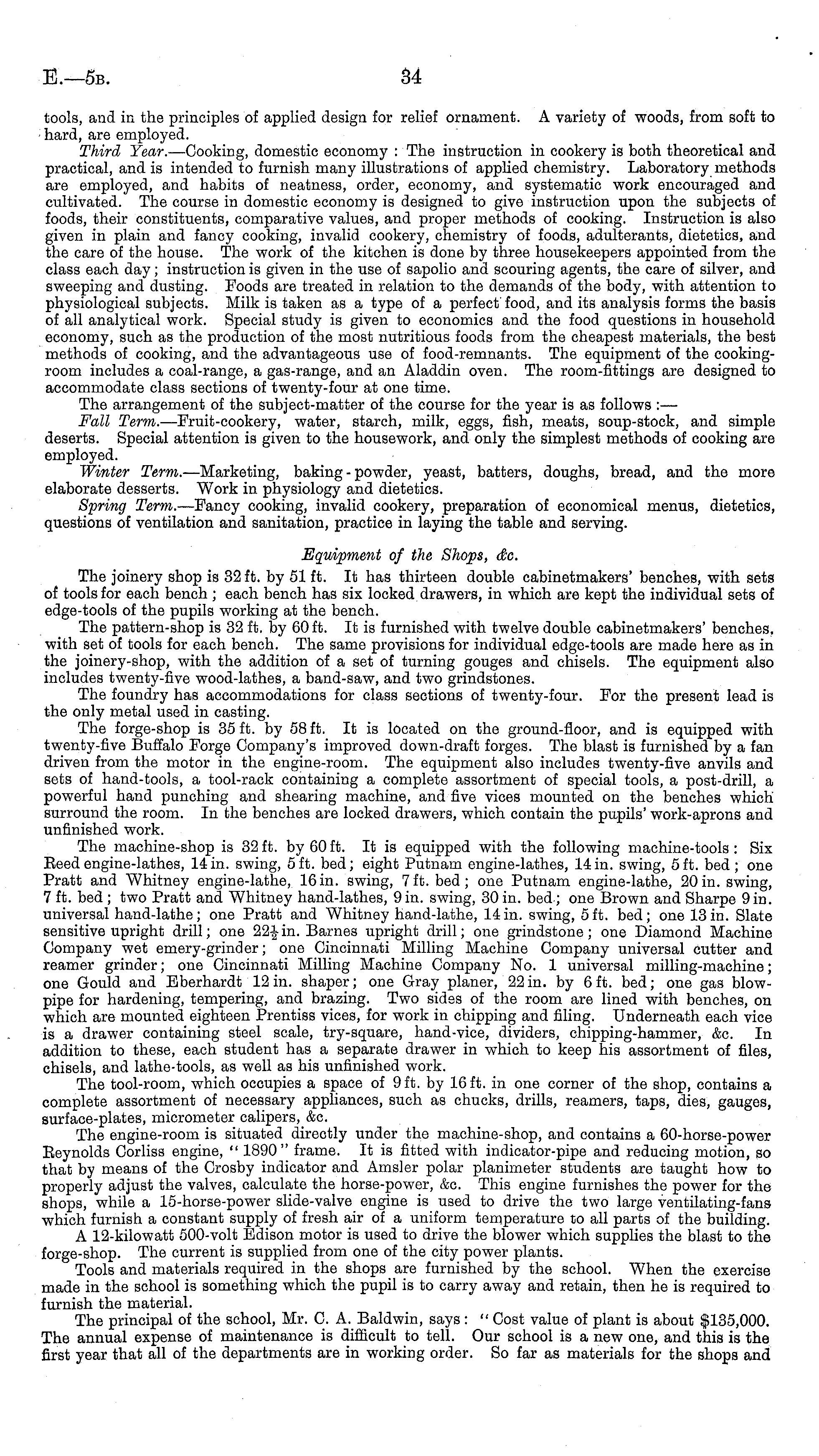 tools, and in the principles of applied design for relief ornament. A variety of woods, from soft to hard, are employed. Third Year. —Cooking, domestic economy : The instruction in cookery is both theoretical and practical, and is intended to furnish many illustrations of applied chemistry. Laboratory methods are employed, and habits of neatness, order, economy, and systematic work encouraged and cultivated. The course in domestic economy is designed to give instruction upon the subjects of foods, their constituents, comparative values, and proper methods of cooking. Instruction is also given in plain and fancy cooking, invalid cookery, chemistry of foods, adulterants, dietetics, and the care of the house. The work of the kitchen is done by three housekeepers appointed from the class each day; instruction is given in the use of sapolio and scouring agents, the care of silver, and sweeping and dusting. Foods are treated in relation to the demands of the body, with attention to physiological subjects. Milk is taken as a type of a perfect food, and its analysis forms the basis of all analytical work. Special study is given to economics and the food questions in household economy, such as the production of the most nutritious foods from the cheapest materials, the best methods of cooking, and the advantageous use of food-remnants. The equipment of the cookingroom includes a coal-range, a gas-range, and an Aladdin oven. The room-fittings are designed to accommodate class sections of twenty-four at one time. The arrangement of the subject-matter of the course for the year is as follows : — Fall Term. —Fruit-cookery, water, starch, milk, eggs, fish, meats, soup-stock, and simple deserts. Special attention is given to the housework, and only the simplest methods of cooking are employed. Winter Term. —Marketing, baking-powder, yeast, batters, doughs, bread, and the more elaborate desserts. Work in physiology and dietetics. Spring Term.- —Fancy cooking, invalid cookery, preparation of economical menus, dietetics, questions of ventilation and sanitation, practice in laying the table and serving. Equipment of the Shops, &c. The joinery shop is 32 ft. by 51 ft. It has thirteen double cabinetmakers' benches, with sets of tools for each bench ; each bench has six locked drawers, in which are kept the individual sets of edge-tools of the pupils working at the bench. The pattern-shop is 32 ft. by 60 ft. It is furnished with twelve double cabinetmakers' benches, with set of tools for each bench. The same provisions for individual edge-tools are made here as in the joinery-shop, with the addition of a set of turning gouges and chisels. The equipment also includes twenty-five wood-lathes, a band-saw, and two grindstones. The foundry has accommodations for class sections of twenty-four. For the present lead is the only metal used in casting. The forge-shop is 35 ft. by 58 ft. It is located on the ground-floor, and is equipped with twenty-five Buffalo Forge Company's improved down-draft forges. The blast is furnished by a fan driven from the motor in the engine-room. The equipment also includes twenty-five anvils and sets of hand-tools, a tool-rack containing a complete assortment of special tools, a post-drill, a powerful hand punching and shearing machine, and five vices mounted on the benches which surround the room. In the benches are locked drawers, which contain the pupils' work-aprons and unfinished work. The machine-shop is 32 ft. by 60 ft. It is equipped with the following machine-tools : Six Beedengine-lathes, 14in. swing, sft. bed; eight Putnam engine-lathes, 14in. swing, sft. bed; one Pratt and Whitney engine-lathe, 16in. swing, 7ft. bed; one Putnam engine-lathe, 20in. swing, 7 ft. bed ; two Pratt and Whitney hand-lathes, 9 in. swing, 30 in. bed.; one Brown and Sharpe 9in. universal hand-lathe; one Pratt and Whitney hand-lathe, 14in. swing, sft. bed; one 13in. Slate sensitive upright drill; one 22 J in. Barnes upright drill; one grindstone; one Diamond Machine Company wet emery-grinder; one Cincinnati Milling Machine Company universal cutter and reamer grinder; one Cincinnati Milling Machine Company No. 1 universal milling-machine; one Gould and Eberhardt 12 in. shaper; one Gray planer, 22in. by 6 ft. bed; one gas blowpipe for hardening, tempering, and brazing. Two sides of the room are lined with benches, on which are mounted eighteen Prentiss vices, for work in chipping and filing. Underneath each vice is a drawer containing steel scale, try-square, hand-vice, dividers, chipping-hammer, &c. In addition to these, each student has a separate drawer in which to keep his assortment of files, chisels, and lathe-tools, as well as his unfinished work. The tool-room, which occupies a space of 9 ft. by 16 ft. in one corner of the shop, contains a complete assortment of necessary appliances, such as chucks, drills, reamers, taps, dies, gauges, surface-plates, micrometer calipers, &c. The engine-room is situated directly under the machine-shop, and contains a 60-horse-power Beynolds Corliss engine, " 1890" frame. It is fitted with indicator-pipe and reducing motion, so that by means of the Crosby indicator and Amsler polar planimeter students are taught how to properly adjust the valves, calculate the horse-power, &c. This engine furnishes the power for the shops, while a 15-horse-power slide-valve engine is used to drive the two large ventilating-fans which furnish a constant supply of fresh air of a uniform temperature to all parts of the building. A 12-kilowatt 500-volt Edison motor is used to drive the blower which supplies the blast to the forge-shop. The current is supplied from one of the city power plants. Tools and materials required in the shops are furnished by the school. When the exercise made in the school is something which the pupil is to carry away and retain, then he is required to furnish the material. The principal of the school, Mr. C. A. Baldwin, says: " Cost value of plant 