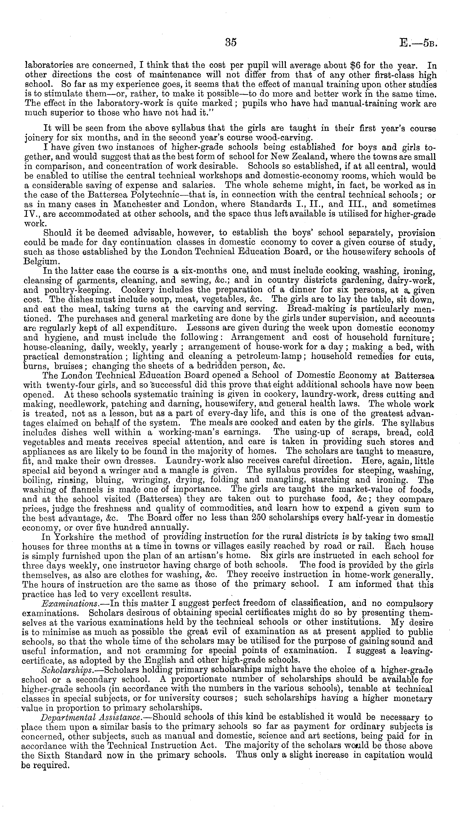 laboratories are concerned, I think that the cost per pupil will average about $6 for the year. In other directions the cost of maintenance will not differ from that of any other first-class high school. So far as my experience goes, it seems that the effect of manual training upon other studies is to stimulate them—or, rather, to make it possible—to do more and better work in the same time. The effect in the laboratory-work is quite marked ; pupils who have had manual-training work are much superior to those who have not had it." It will be seen from the above syllabus that the girls are taught in their first year's course joinery for six months, and in the second year's course wood-carving. I have given two instances of higher-grade schools being established for boys and girls together, and would suggest that as the best form of school for New Zealand, where the towns are small in comparison, and concentration of work desirable. Schools so established, if at all central, would be enabled to utilise the central technical workshops and domestic-economy rooms, which would be a considerable saving of expense and salaries. The whole scheme might, in fact, be worked as in the case of the Battersea Polytechnic—that is, in connection with the central technical schools; or as in many cases in Manchester and London, where Standards 1., 11., and 111., and sometimes IV., are accommodated at other schools, and the space thus left available is utilised for higher-grade work. Should it be deemed advisable, however, to establish the boys' school separately, provision could be made for day continuation classes in domestic economy to cover a given course of study, such as those established by the London Technical Education Board, or the housewifery schools of Belgium. In the latter case the course is a six-months one, and must include cooking, washing, ironing, cleansing of garments, cleaning, and sewing, &c; and in country districts gardening, dairy-work, and poultry-keeping. Cookery includes the preparation of a dinner for six persons, at a. given cost. The dishes must include soup, meat, vegetables, &c. The girls are to lay the table, sit down, and eat the meal, taking turns at the carving and serving. Bread-making is particularly mentioned. The purchases and general marketing are done by the girls under supervision, and accounts are regularly kept of all expenditure. Lessons are given during the week upon domestic economy and hygiene, and must include the following: Arrangement and cost of household furniture; house-cleaning, daily, weekly, yearly ; arrangement of house-work for a day; making a bed, with practical demonstration; lighting and cleaning a petroleum-lamp; household remedies for cuts, burns, bruises; changing the sheets of a bedridden person, &c. The London Technical Education Board opened a School of Domestic Economy at Battersea with twenty-four girls, and so 'Successful did this prove that eight additional schools have now been opened. At these schools systematic training is given in cookery, laundry-work, dress cutting and making, needlework, patching and darning, housewifery, and general health laws. The whole work is treated, not as a lesson, but as a part of every-day life, and this is one of the greatest advantages claimed on behalf of the system. The meals are cooked and eaten by the girls. The syllabus includes dishes well within a working-man's earnings. The using-up of scraps, bread, cold vegetables and meats receives special attention, and care is taken in providing such stores and appliances as are likely to be found in the majority of homes. The scholars are taught to measure, fit, and make their own dresses. Laundry-work also receives careful direction. Here, again, little special aid beyond a wringer and a mangle is given. The syllabus provides for steeping, washing, boiling, rinsing, bluing, wringing, drying, folding and mangling, starching and ironing. The washing of flannels is made one of importance. The girls are taught the market-value of foods, and at the school visited (Battersea) they are taken out to purchase food, &c; they compare prices, judge the freshness and quality of commodities, and learn how to expend a given sum to the best advantage, &c. The Board offer no less than 250 scholarships every half-year in domestic economy, or over five hundred annually. In Yorkshire the method of providing instruction for the rural districts is by taking two small houses for three months at a time in towns or villages easily reached by road or rail. Each house is simply furnished upon the plan of an artisan's home. Six girls are instructed in each school for three days weekly, one instructor having charge of both schools. The food is provided by the girls themselves, as also are clothes for washing, &c. They receive instruction in home-work generally. The hours of instruction are the same as those of the primary school. I am informed that this practice has led to very excellent results. Examinations. —ln this matter I suggest perfect freedom of classification, and no compulsory examinations. Scholars desirous of obtaining special certificates might do so by presenting themselves at the various examinations held by the technical schools or other institutions. My desire is to minimise as much as possible the great evil of examination as at present applied to public schools, so that the whole time of the scholars may be utilised for the purpose of gaining sound and useful information, and not cramming for special points of examination. I suggest a leavingcertificate, as adopted by the English and other high-grade schools. Scholarships. —Scholars holding primary scholarships might have the choice of a higher-grade school or a secondary school. A proportionate number of scholarships should be available for higher-grade schools (in accordance with the numbers in the various schools), tenable at technical classes in special subjects, or for university courses; such sc
