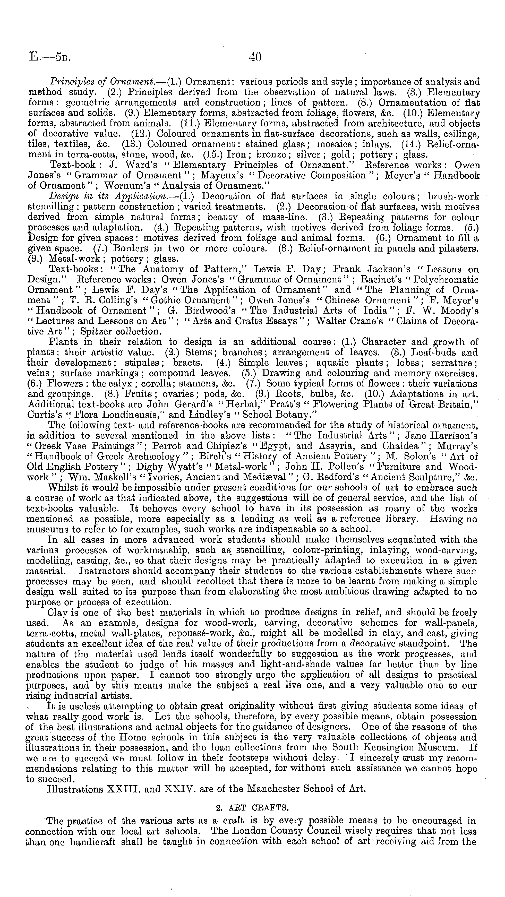 Principles of Ornament. —-(1.) Ornament: various periods and style; importance of analysis and method study. (2.) Principles derived from the observation of natural laws. (3.) Elementary forms: geometric arrangements and construction; lines of pattern. (8.) Ornamentation of flat surfaces and solids. (9.) Elementary forms, abstracted from foliage, flowers, &c. (10.) Elementary forms, abstracted from animals. (11.) Elementary forms, abstracted from architecture, and objects of decorative value. (12.) Coloured ornaments in flat-surface decorations, such as walls, ceilings, tiles, textiles, &c. (13.) Coloured ornament: stained glass; mosaics ; inlays. (14.) Belief-orna-ment in terra-eotta, stone, wood, &c. (15.) Iron; bronze; silver ; gold; pottery ; glass. Text-book : J. Ward's " Elementary Principles of Ornament." Beference works: Owen Jones's "Grammar of Ornament"; Mayeux's "Decorative Composition"; Meyer's" Handbook of Ornament " ; Wornum's " Analysis of Ornament." Design in its Application. —(l.) Decoration of flat surfaces in single colours; brush-work stencilling ; pattern construction ; varied treatments. (2.) Decoration of flat surfaces, with motives derived from simple natural forms; beauty of mass-line. (3.) Eepeating patterns for colour processes and adaptation. (4.) Eepeating patterns, with motives derived from foliage forms. (5.) Design for given spaces: motives derived from foliage and animal forms. (6.) Ornament to fill a given space. (7.) Borders in two or more colours. (8.) Belief-ornament in panels and pilasters. (9.) Metal-work ; pottery ; glass. Text-books: "The Anatomy of Pattern," Lewis F. Day; Frank Jackson's "Lessons on Design." Beference works : Owen Jones's " Grammar of Ornament " ; Bacinet's " Polychromatic Ornament " ; Lewis F. Day's " The Application of Ornament" and " The Planning of Ornament " ; T. B. Colling's " Gothic Ornament " ; Owen Jones's "Chinese Ornament"; F.Meyer's "Handbook of Ornament"; G. Birdwood's "The Industrial Arts of India"; F. W. Moody's " Lectures and Lessons on Art" ; " Arts and Crafts Essays " ; Walter Crane's " Claims of Decorative Art " ; Spitzer collection. Plants in their relation to design is an additional course: (1.) Character and growth of plants: their artistic value. (2.) Stems; branches; arrangement of leaves. (3.) Leaf-buds and their development; stipules; bracts. (4.) Simple leaves; aquatic plants; lobes; serrature; veins; surface markings ; compound leaves. (5.) Drawing and colouring and memory exercises. (6.) Flowers : the calyx ; corolla; stamens, &c. (7.) Some typical forms of flowers : their variations and groupings. (8.) Fruits; ovaries; pods, &c. (9.) Boots, bulbs, &c. (10.) Adaptations in art. Additional text-books are John Gerard's "Herbal," Pratt's " Flowering Plants of Great Britain," Curtis's " Flora Londinensis," and Lindley's " School Botany." The following text- and reference-books are recommended for the study of historical ornament, in addition to several mentioned in the above lists : " The Industrial Arts "; Jane Harrison's " Greek Vase Paintings"; Perrot and Chipiez's "Egypt, and Assyria, and Chaldea " ; Murray's " Handbook of Greek Archaeology " ; Birch's " History of Ancient Pottery " ; M. Solon's " Art of Old English Pottery " ; Digby Wyatt's " Metal-work " ; John H. Pollen's "Furniture and Woodwork " ; Wm. Maskell's "Ivories, Ancient and Mediaeval" ; G. Bedford's " Ancient Sculpture," &c. Whilst it would be impossible under present conditions for our schools of art to embrace such a course of work as that indicated above, the suggestions will be of general service, and the list of text-books valuable. It behoves every school to have in its possession as many of the works mentioned as possible, more especially as a lending as well as a reference library. Having no museums to refer to for examples, such works are indispensable to a school. In all cases in more advanced work students should make themselves acquainted with the various processes of workmanship, such as stencilling, colour-printing, inlaying, wood-carving, modelling, casting, &c, so that their designs may be practically adapted to execution in a given material. Instructors should accompany their students to the various establishments where such processes may be seen, and should recollect that there is more to be learnt from making a simple design well suited to its purpose than from elaborating the most ambitious drawing adapted to no purpose or process of execution. Clay is one of the best materials in which to produce designs in relief, and should be freely used. As an example, designs for wood-work, carving, decorative schemes for wall-panels, terra-cotta, metal wall-plates, repousse-work, &c, might all be modelled in clay, and cast, giving students an excellent idea of the real value of their productions from a decorative standpoint. The nature of the material used lends itself wonderfully to suggestion as the work progresses, and enables the student to judge of his masses and light-and-shade values far better than by line productions upon paper. I cannot too strongly urge the application of all designs to practical purposes, and by this means make the subject a real live one, and a very valuable one to our rising industrial artists. It is useless attempting to obtain great originality without first giving students some ideas of what really good work is. Let the schools, therefore, by every possible means, obtain possession of the best illustrations and actual objects for the guidance of designers. One of the reasons of the great success of the Home schools in this subject is the very valuable collections of objects and illustrations in their possession, and the loan collections from the South Kensington Museum. If we are to succeed we must follow in their footsteps without delay. I sincerely trust my recommendations relating to this matter will be accepted, for without such assistance we cannot hope to succeed. Illustrations XXIII.