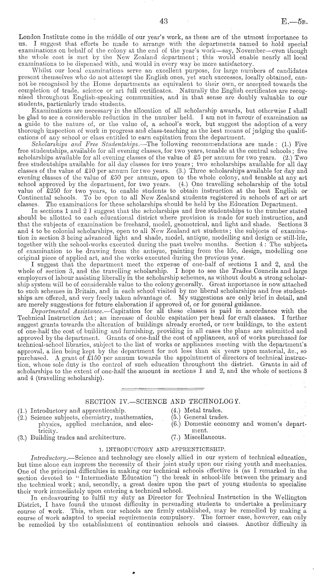 SECTION IV.—SCIENCE AND TECHNOLOGY. (1.) Introductory and apprenticeship. (4.) Metal trades. (2.) Science subjects, chemistry, mathematics, (5.) General trades. physics, applied mechanics, and elec- (6.) Domestic economy and women's departtricity. ment. (3.) Building trades and architecture. (7.) Miscellaneous. 1. INTRODUCTORY AND APPRENTICESHIP. Introductory. —Science and technology are closely allied in our system of technical education, but time alone can impress the necessity of their joint study upon our rising youth and mechanics. One of the principal difficulties in making our technical schools effective is (as I remarked in the section devoted to "Intermediate Education") the break in school-life between the primary and the technical work; and, secondly, a great desire upon the part of young students to specialise their work immediately upon entering a technical school. In endeavouring to fulfil my duty as Director for Technical Instruction in the Wellington District, I have found the utmost difficulty in persuading students to undertake a preliminary course of work. This, when our schools are firmly established, may be remedied by making a course of work adapted to special requirements compulsory. The former case, however, can only be remedied by the establishment of continuation schools and classes. Another difficulty in