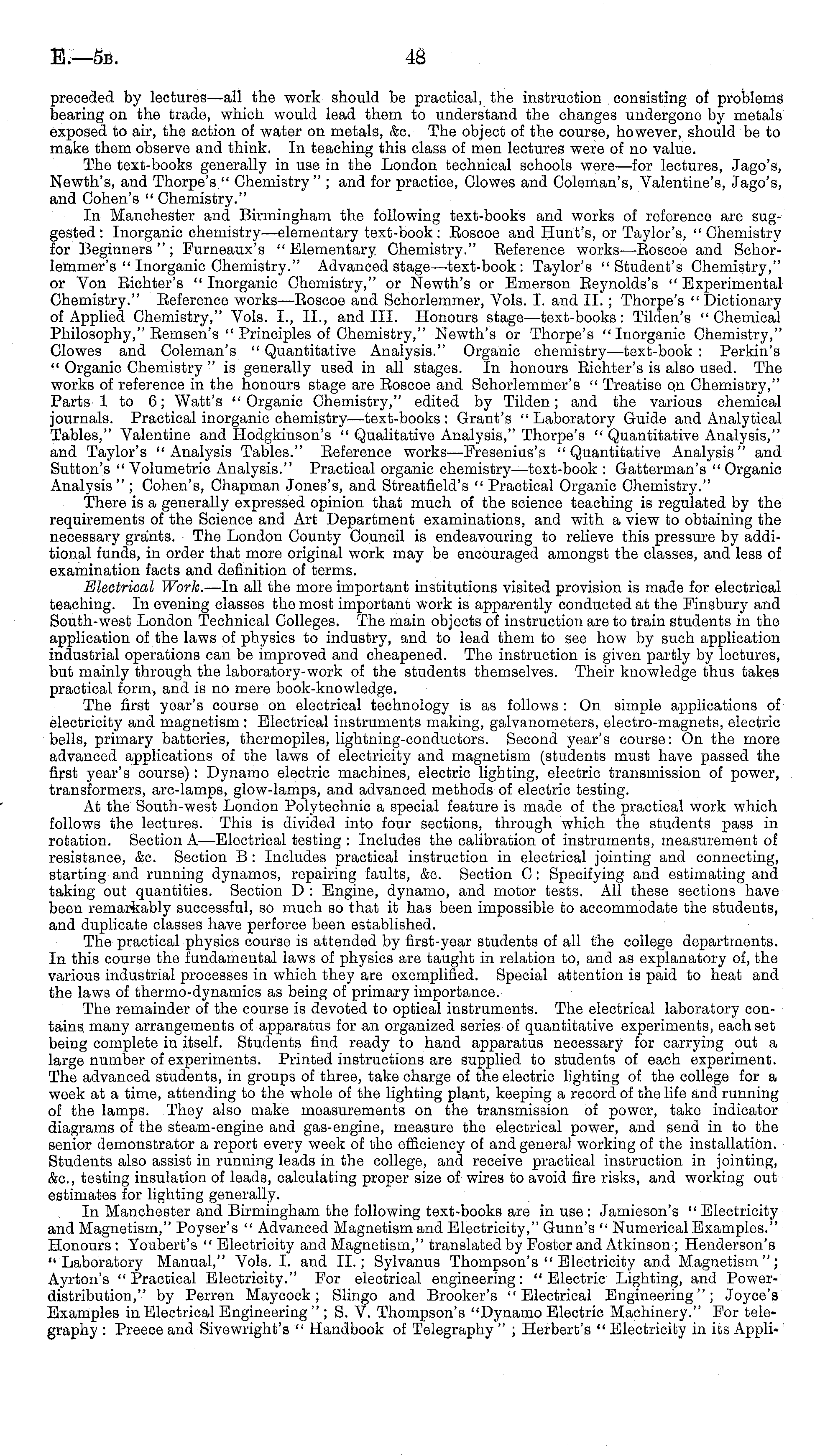 preceded by lectures—all the work should be practical, the instruction consisting of problems bearing on the trade, which would lead them to understand the changes undergone by metals exposed to air, the action of water on metals, &c. The object of the course, however, should be to make them observe and think. In teaching this class of men lectures were of no value. The text-books generally in use in the London technical schools were—for lectures, Jago's, Newth's, and Thorpe's," Chemistry " ; and for practice, Clowes and Coleman's, Valentine's, Jago's, and Cohen's " Chemistry." In Manchester and Birmingham the following text-books and works of reference are suggested : Inorganic chemistry—elementary text-book : Eoscoe and Hunt's, or Taylor's, " Chemistry for Beginners"; Furneaux's "Elementary Chemistry." Beference works —Eoscoe and Schorlemmer's " Inorganic Chemistry." Advanced stage—-text-book : Taylor's " Student's Chemistry," or Yon Eichter's " Inorganic Chemistry," or Newth's or Emerson Eeynolds's " Experimental Chemistry." Beference works—Eoscoe and Schorlemmer, Vols. I. and 11. ; Thorpe's "Dictionary of Applied. Chemistry," Vols. 1., 11., and 111. Honours stage—text-books: Tilden's "Chemical Philosophy," Bemsen's " Principles of Chemistry," Newth's or Thorpe's "Inorganic Chemistry," Clowes and Coleman's " Quantitative Analysis." Organic chemistry —text-book : Perkin's " Organic Chemistry "is generally used in all stages. In honours Eichter's is also used. The works of reference in the honours stage are Eoscoe and Schorlemmer's " Treatise on Chemistry," Parts 1 to 6; Watt's "Organic Chemistry," edited by Tilden; and the various chemical journals. Practical inorganic chemistry—text-books : Grant's " Laboratory Guide and Analytical Tables," Valentine and Hodgkinson's " Qualitative Analysis," Thorpe's " Quantitative Analysis," and Taylor's "Analysis Tables." Beference works—Fresenius's "Quantitative Analysis" and Sutton's "Volumetric Analysis." Practical organic chemistry—text-book : Gatterman's "Organic Analysis" ; Cohen's, Chapman Jones's, and Streatfield's " Practical Organic Chemistry." There is a generally expressed opinion that much of the science teaching is regulated by the requirements of the Science and Art Department examinations, and with a view to obtaining the necessary grants. The London County Council is endeavouring to relieve this pressure by additional funds, in order that more original work may be encouraged amongst the classes, and less of examination facts and definition of terms. Electrical Work. —ln all the more important institutions visited provision is made for electrical teaching. In evening classes the most important work is apparently conducted at the Finsbury and South-west London Technical Colleges. The main objects of instruction are to train students in the application of the laws of physics to industry, and to lead them to see how by such application industrial operations can be improved and cheapened. The instruction is given partly by lectures, but mainly through the laboratory-work of the students themselves. Their knowledge thus takes practical form, and is no mere book-knowledge. The first year's course on electrical technology is as follows : On simple applications of electricity and magnetism : Electrical instruments making, galvanometers, electro-magnets, electric bells, primary batteries, thermopiles, lightning-conductors. Second year's course: On the more advanced applications of the laws of electricity and magnetism (students must have passed the first year's course): Dynamo electric machines, electric lighting, electric transmission of power, transformers, arc-lamps, glow-lamps, and advanced methods of electric testing. At the South-west London Polytechnic a special feature is made of the practical work which follows the lectures. This is divided into four sections, through which the students pass in rotation. Section A—Electrical testing : Includes the calibration of instruments, measurement of resistance, &c. Section B: Includes practical instruction in electrical jointing and connecting, starting and running dynamos, repairing faults, &c. Section C : Specifying and estimating and taking out quantities. Section D : Engine, dynamo, and motor tests. All these sections have been remarkably successful, so much so that it has been impossible to accommodate the students, and duplicate classes have perforce been established. The practical physics course is attended by first-year students of all the college departments. In this course the fundamental laws of physics are taught in relation to, and as explanatory of, the various industrial processes in which they are exemplified. Special attention is paid to heat and the laws of thermo-dynamics as being of primary importance. The remainder of the course is devoted to optical instruments. The electrical laboratory contains many arrangements of apparatus for an organized series of quantitative experiments, each set being complete in itself. Students find ready to hand apparatus necessary for carrying out a large number of experiments. Printed instructions are supplied to students of each experiment. The advanced students, in groups of three, take charge of the electric lighting of the college for a week at a time, attending to the whole of the lighting plant, keeping a record of the life and running of the lamps. They also make measurements on the transmission of power, take indicator diagrams of the steam-engine and gas-engine, measure the electrical power, and send in to the senior demonstrator a report every week of the efficiency of and genera) working of the installation. Students also assist in running leads in the college, and receive practical instruction in jointing, &c, testing insulation of leads, calculating proper size of wires to avoid fire risks, and working out estimates for lighting generally. In Manchester and Birmingham the following text-books are in use