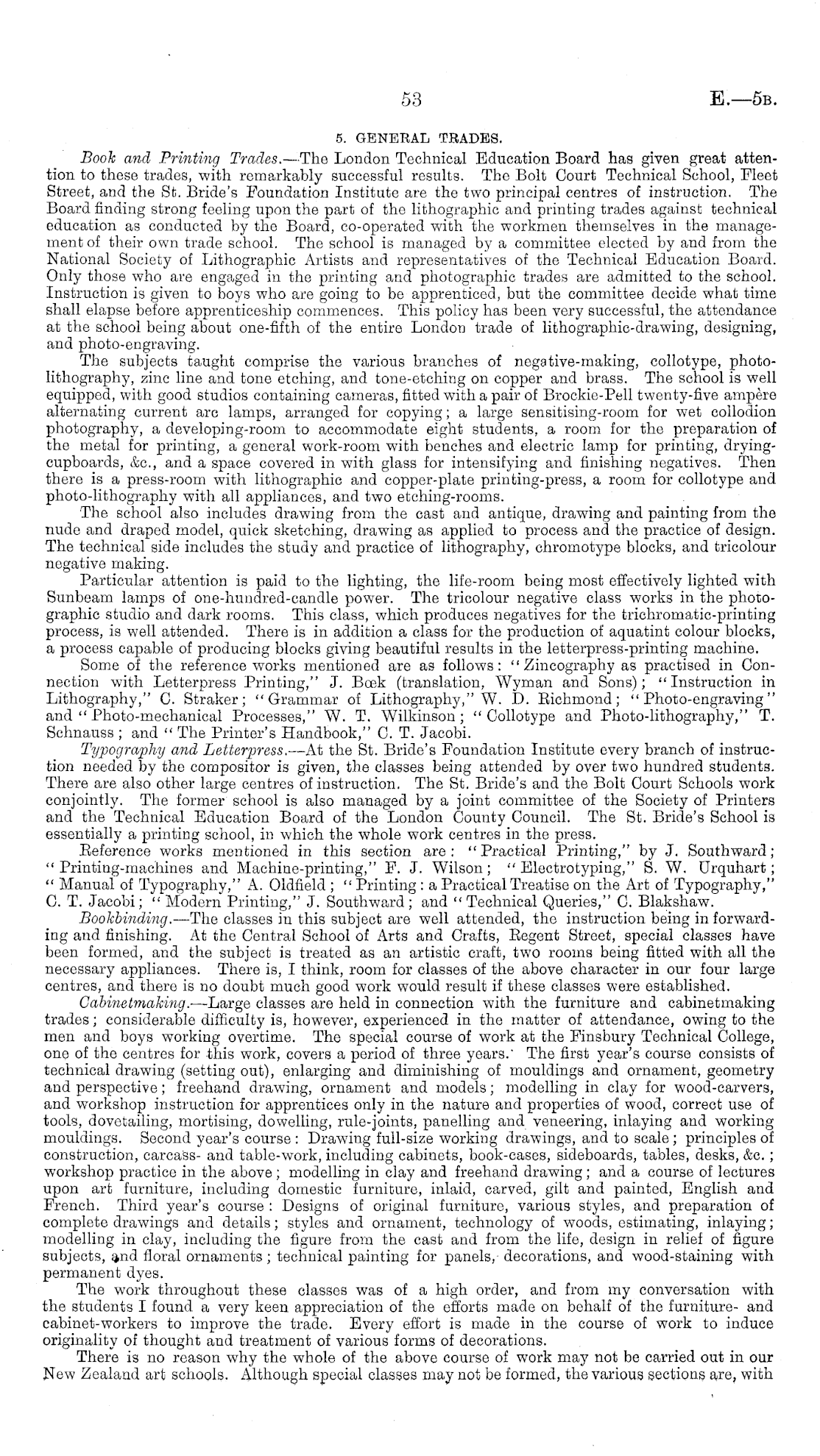 5. GENERAL TRADES. Book and Printing Trades .—The London Technical Education Board has given great attention to these trades, with remarkably successful results. The Bolt Court Technical School, Fleet Street, and the St. Bride's Foundation Institute are the two principal centres of instruction. The Board finding strong feeling upon the part of the lithographic and printing trades against technical education as conducted by the Board, co-operated with the workmen themselves in the management of their own trade school. The school is managed by a committee elected by and from the National Society of Lithographic Artists and representatives of the Technical Education Board. Only those who are engaged in the printing and photographic trades are admitted to the school. Instruction is given to boys who are going to be apprenticed, but the committee decide what time shall elapse before apprenticeship commences. This policy has been very successful, the attendance at the school being about one-fifth of the entire London trade of lithographic-drawing, designing, and photo-engraving. The subjects taught comprise the various branches of negative-making, collotype, photolithography, zinc line and tone etching, and tone-etching on copper and brass. The school is well equipped, with good studios containing cameras, fitted with a pair of Brockie-Pell twenty-five ampere alternating current arc lamps, arranged for copying; a large sensitising-room for wet collodion photography, a developing-room to accommodate eight students, a room for the preparation of the metal for printing, a general work-room with benches and electric lamp for printing, dryingcupboards, &c, and a space covered in with glass for intensifying and finishing negatives. Then there is a press-room with lithographic and copper-plate printing-press, a room for collotype and photo-lithography with all appliances, and two etching-rooms. The school also includes drawing from the cast and antique, drawing and painting from the nude and draped model, quick sketching, drawing as applied to process and the practice of design. The technical side includes the study and. practice of lithography, chromotype blocks, and tricolour negative making. Particular attention is paid to the lighting, the life-room being most effectively lighted with Sunbeam lamps of one-hundred-candle power. The tricolour negative class works in the photographic studio and dark rooms. This class, which produces negatives for the trichromatic-printing process, is well attended. There is in addition a class for the production of aquatint colour blocks, a process capable of producing blocks giving beautiful results in the letterpress-printing machine. Some of the reference works mentioned are as follows: " Zincography as practised in Connection with Letterpress Printing," J. Bcek (translation, Wyman and Sons); "Instruction in Lithography," C. Straker; "Grammar of Lithography," W. D. Bichmond; "Photo-engraving" and " Photo-mechanical Processes," W. T. Wilkinson; "Collotype and Photo-lithography," T. Schnauss ; and " The Printer's Handbook," C. T. Jacobi. Typography and Letterpress. —At the St. Bride's Foundation Institute every branch of instruction needed by the compositor is given, the classes being attended by over two hundred students. There are also other large centres of instruction. The St. Bride's and the Bolt Court Schools work conjointly. The former school is also managed by a joint committee of the Society of Printers and the Technical Education Board of the London County Council. The St. Bride's School is essentially a printing school, in which the whole work centres in the press. Beference works mentioned in this section are: "Practical Printing," by J. Southward; " Printing-machines and Machine-printing," F. J. Wilson; " Electrotyping," S. W. Urquhart; " Manual of Typography," A. Oldfield ; " Printing : a Practical Treatise on the Art of Typography," C. T. Jacobi; " Modern Printing," J. Southward; and "Technical Queries," C. Blakshaw. Bookbinding. —The classes in this subject are well attended, the instruction being in forwarding and finishing. At the Central School of Arts and Crafts, Eegent Street, special classes have been formed, and the subject is treated as an artistic craft, two rooms being fitted with all the necessary appliances. There is, I think, room for classes of the above character in our four large centres, and there is no doubt much good work would result if these classes were established. Cabinetmaking. —Large classes are held in connection with the furniture and cabinetmaking trades; considerable difficulty is, however, experienced in the matter of attendance, owing to the men and boys working overtime. The special course of work at the Finsbury Technical College, one of the centres for this work, covers a period of three years.' The first year's course consists of technical drawing (setting out), enlarging and diminishing of mouldings and ornament, geometry and perspective; freehand drawing, ornament and models; modelling in clay for wood-carvers, and workshop instruction for apprentices only in the nature and properties of wood, correct use of tools, dovetailing, mortising, dowelling, rule-joints, panelling and veneering, inlaying and working mouldings. Second year's course : Drawing full-size working drawings, and to scale; principles of construction, carcass- and table-work, including cabinets, book-cases, sideboards, tables, desks, &c.; workshop practice in the above; modelling in clay and freehand drawing; and a course of lectures upon art furniture, including domestic furniture, inlaid, carved, gilt and painted, English and French. Third year's course : Designs of original furniture, various styles, and preparation of complete drawings and details; styles and ornament, technology of woods, estimating, inlaying; modelling in clay, including the figure from the cast and from the life, design in relief of figure subjects, and floral orna